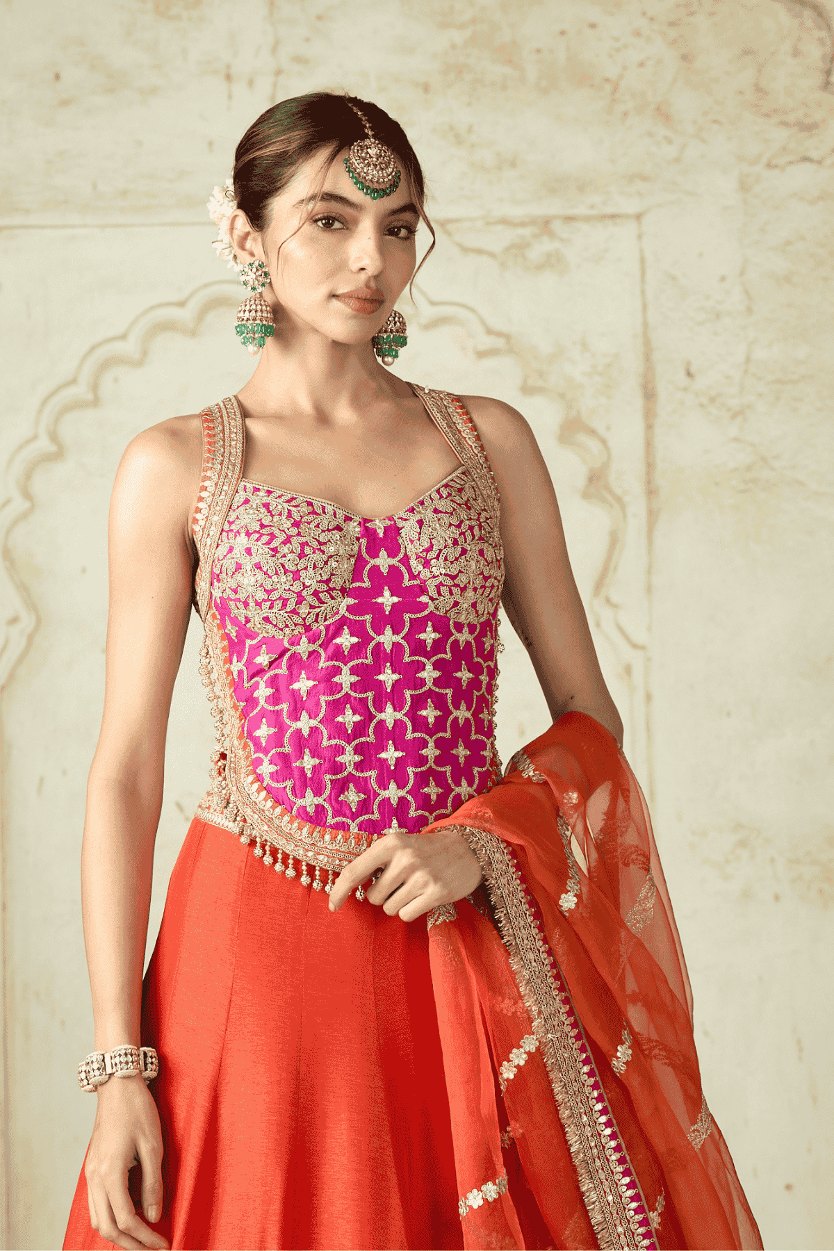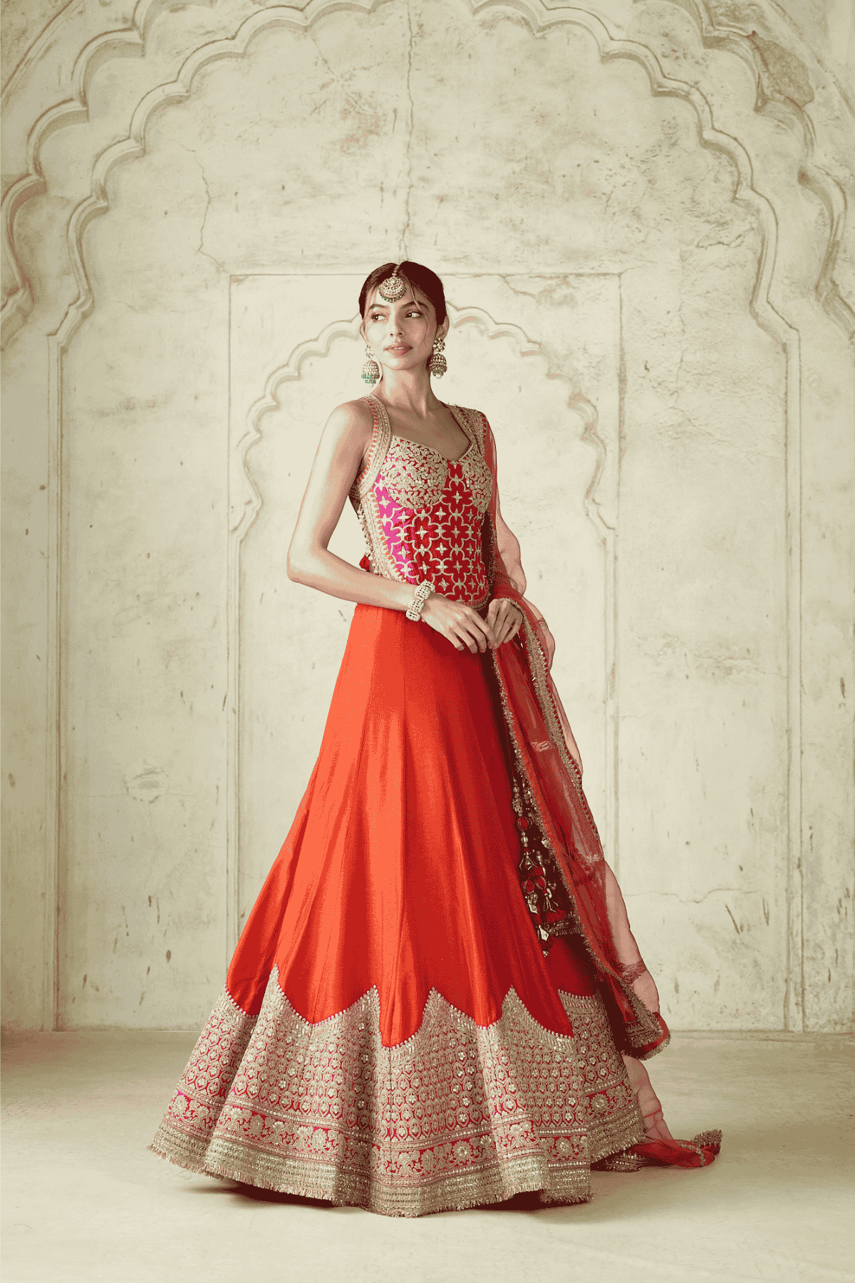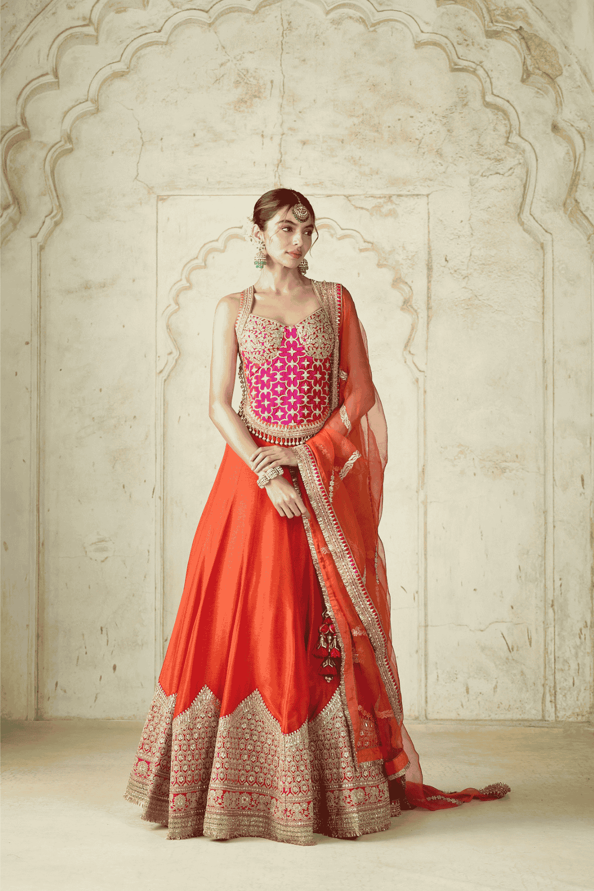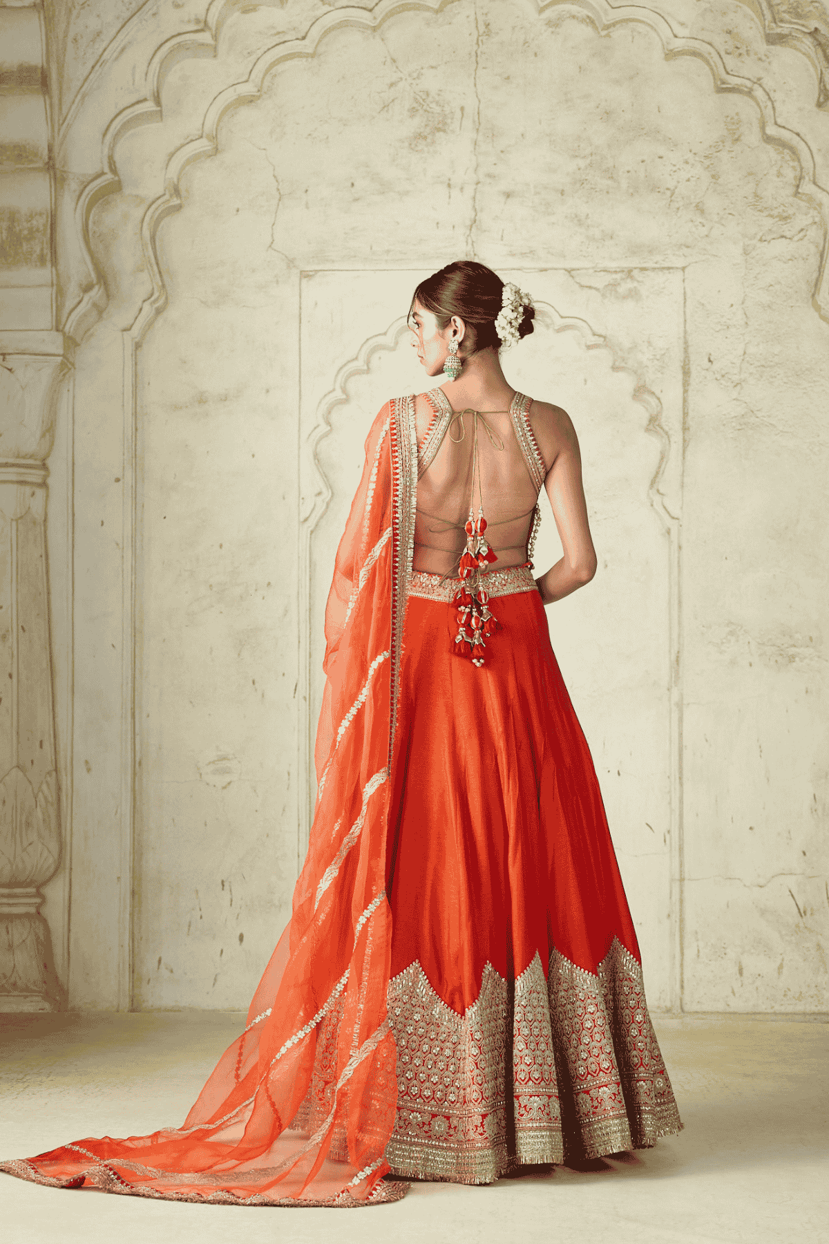 The blouse features intricate work, styled with delicate straps for a modern touch. The flowing lehenga is designed with a scalloped edge and a heavily embellished bordercreating a rich, regal finish. Completing the ensemble is a sheer matching dupatta, highlighted with dainty motifs and a broad embellished border that enhances its elegance.