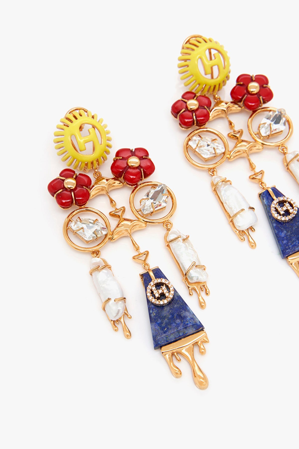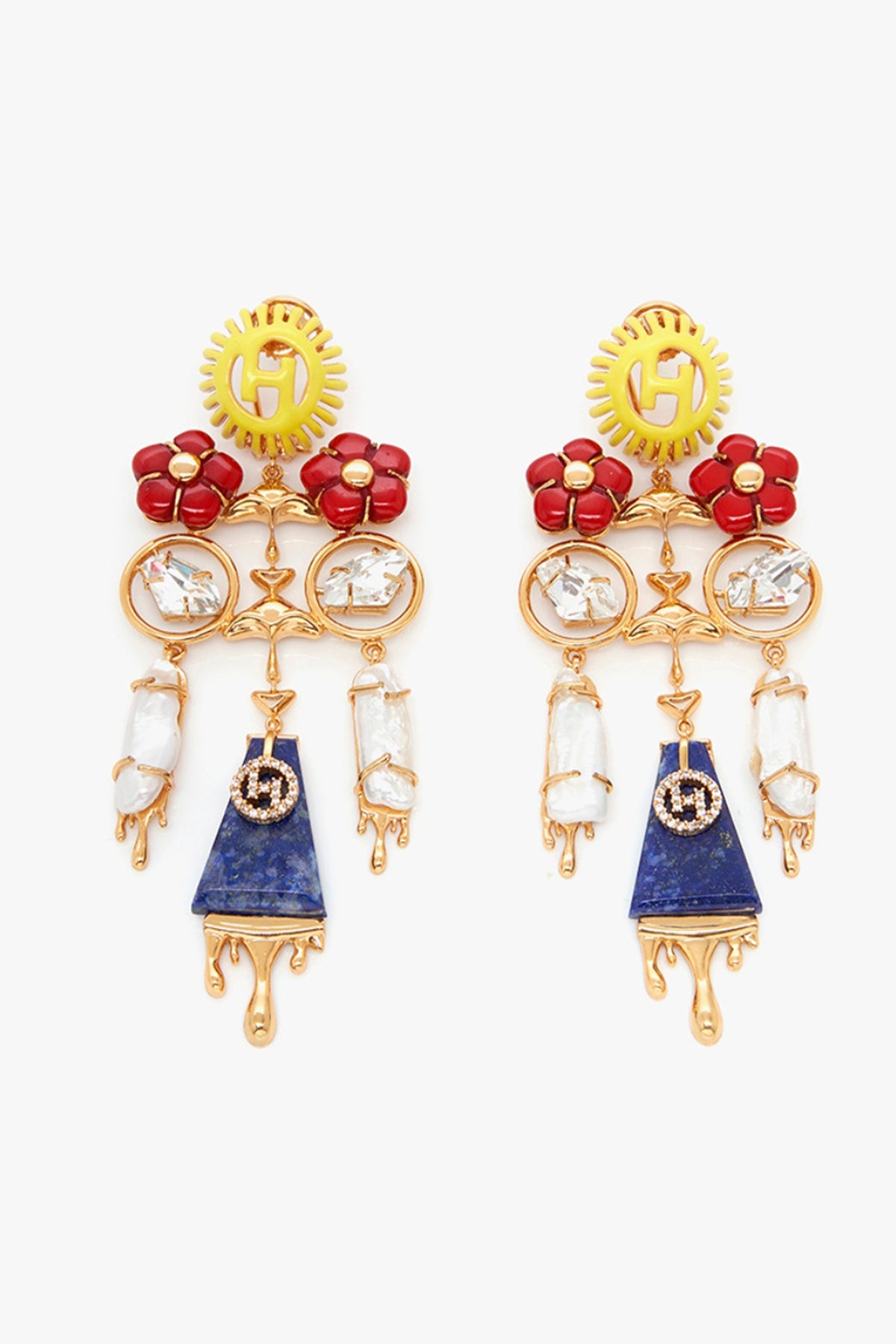The feriae earrings, features a lacquered monogram, poppi cabochons, galactic crystals , keshi pearls, and the unique charm of lapis lazuli, believed to inspire wisdom and self-expression. The reinvention of these elements, gracefully punctuated with iconic gold dripping accents, transforms the earrings into a euphoric state of the art piece finished in 22 k rose gold .Ā