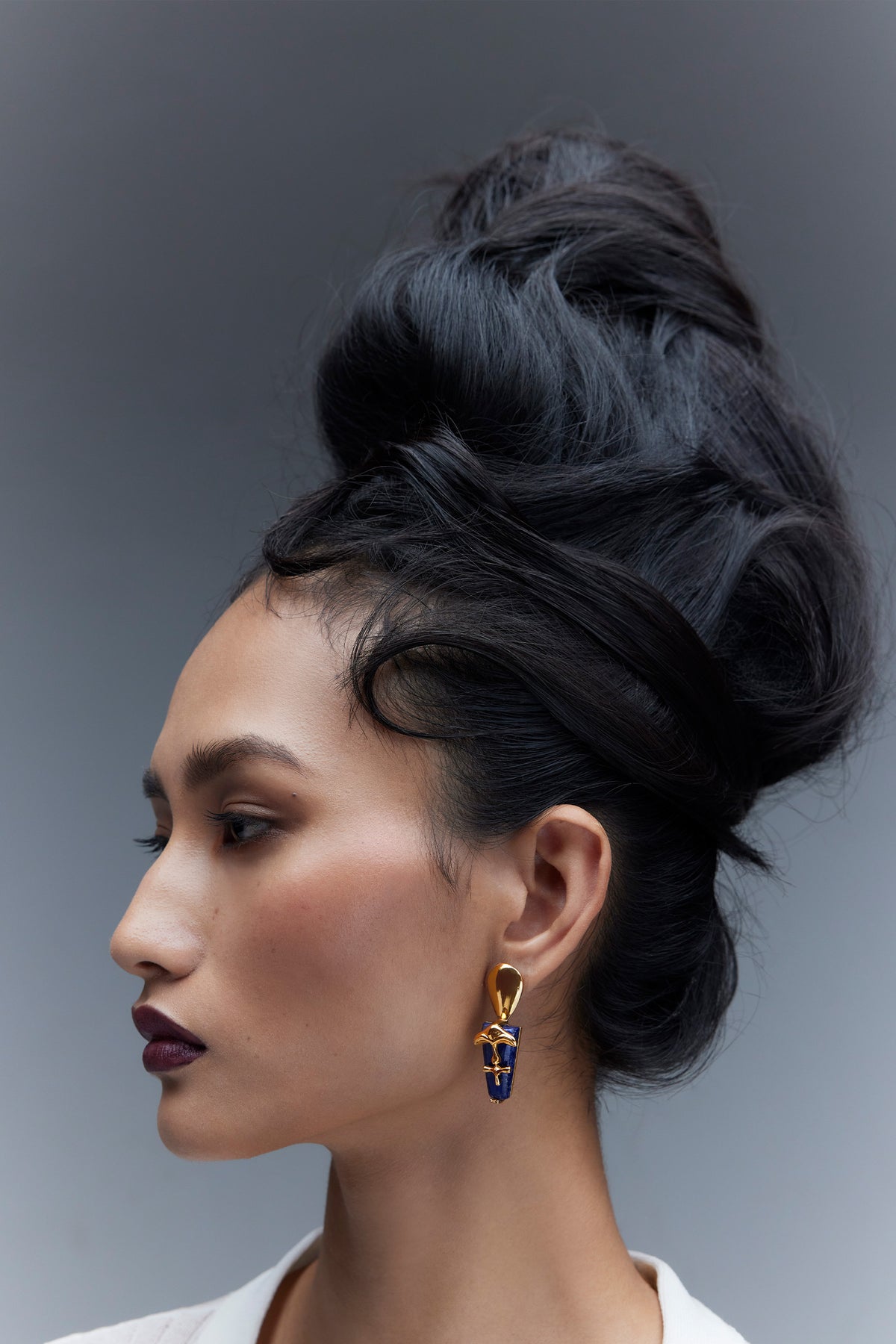 Finished in 22k gold, the lazuli sculpt earrings showcase the iconic shroom motif adorned with the profound serene blue hues of the lapis lazuli in a stunning abstraction. The pair is a sculpted addition to the repertoire of outhouse and offers infinite styling possibilities, from structured to sophisticated.