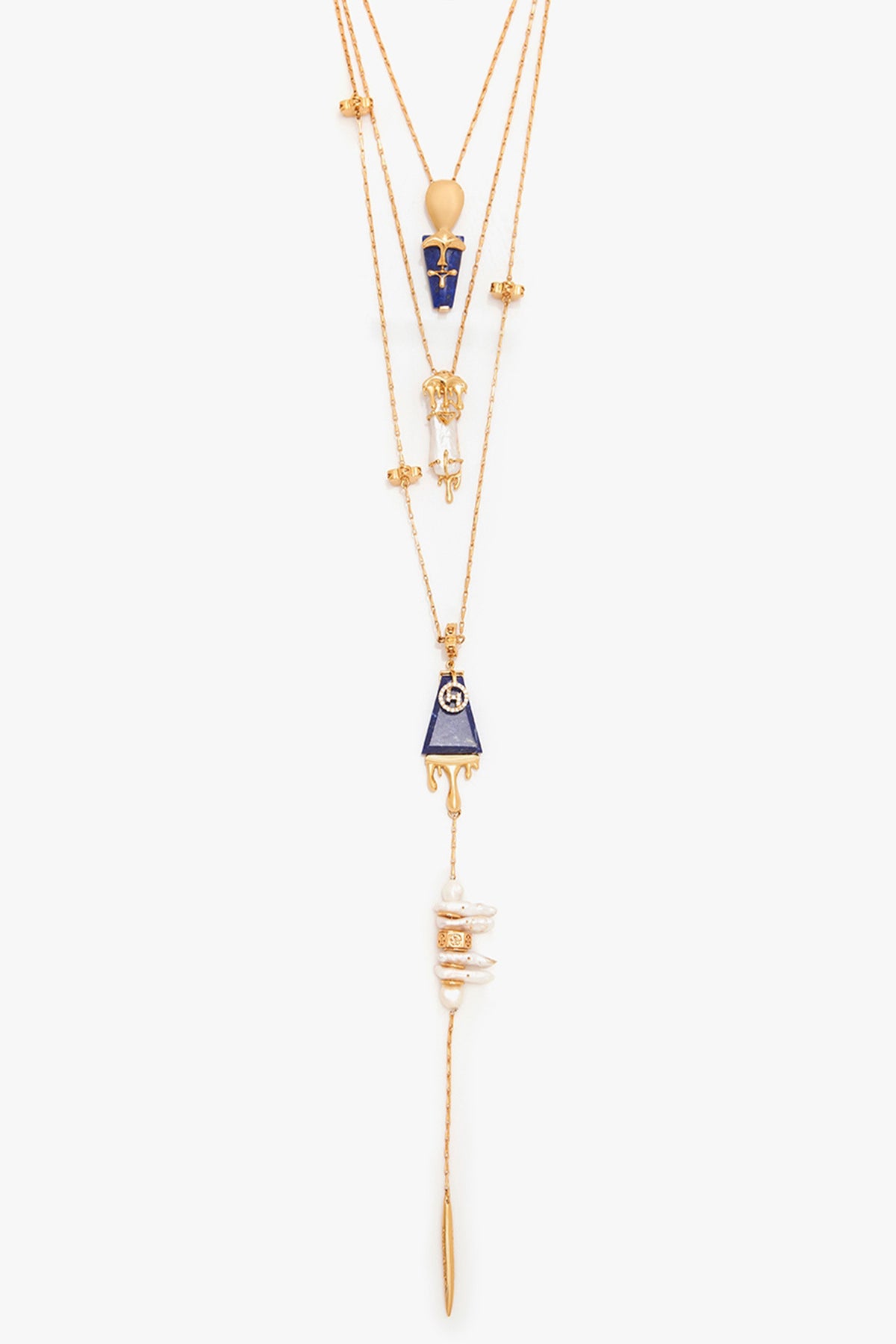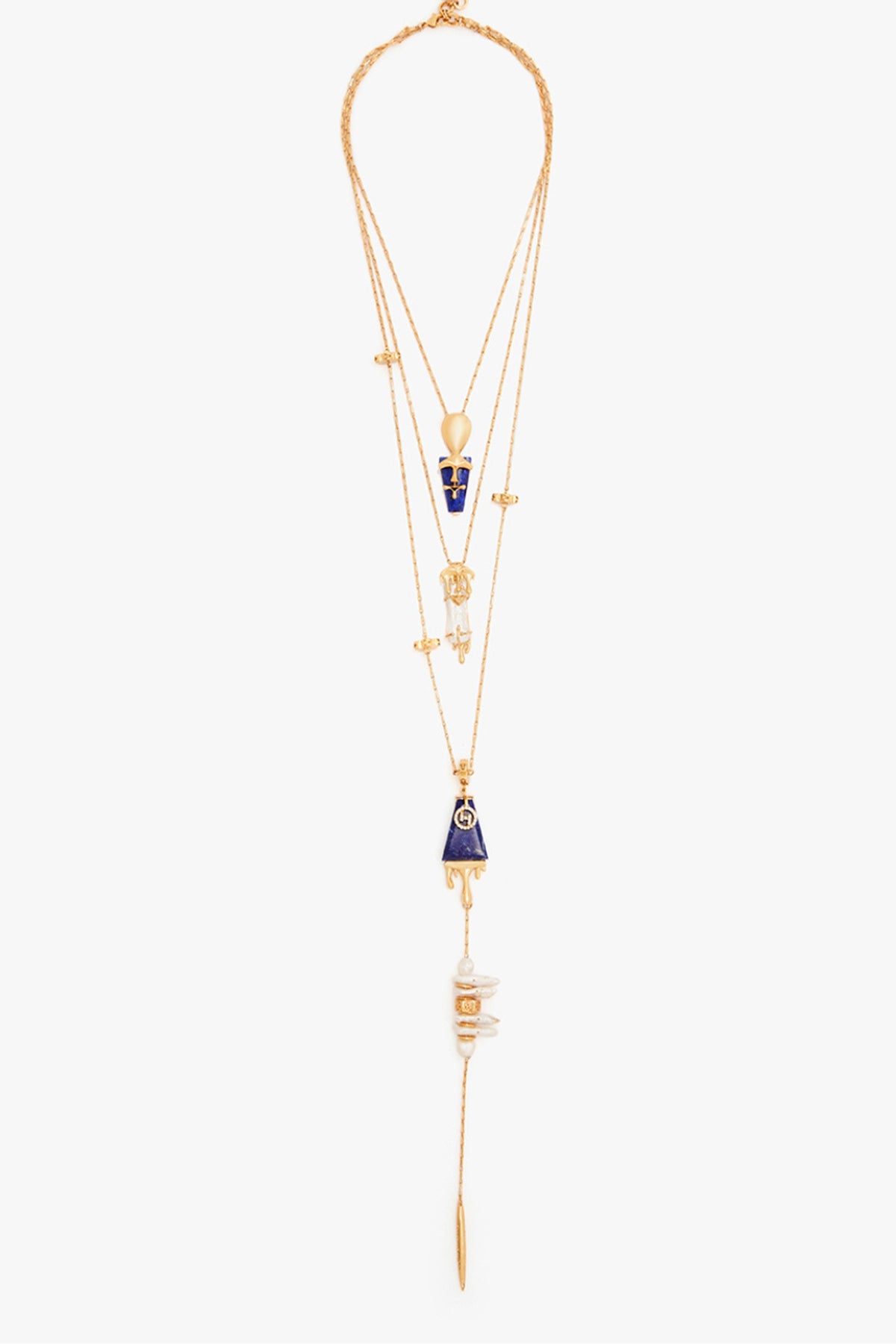 Indulge in the embrace of the lazuli sculpt layered necklace , an alluring pair of lapis lazuli and keshi pearls cascading delicately in layered splendor. Beholding the ethereal symphony of dainty chains finished in 22 rose gold and whimsical pendants, the necklace showcases the house's meticulous attention to detail with nano metallic accents, from graceful drips to blooming poppi flowers. Let this piece of art adorn you as a whimsical tapestry, seamlessly transitioning your style from the enchanting glow of daylight to the mystic of the night. Each semi-precious gemstone is unique and may vary in colour or texture.Ā