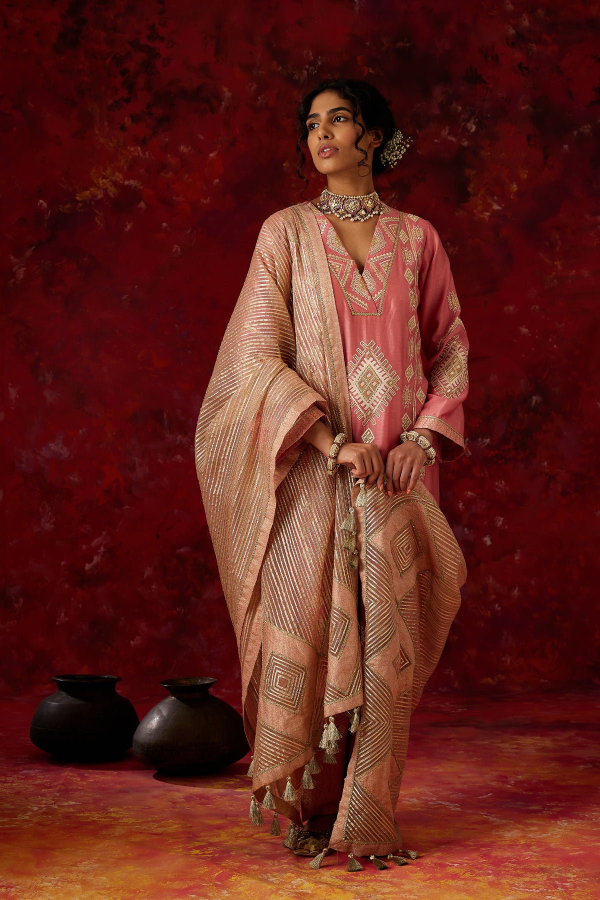 A chanderi a-line kurta with pockets and a pleated collar, with thread and nakshi motifs all over the front and back along with patched banarsi is paired with an organza dupatta bearing gota strips and banarsi patchwork as well as chanderi pants with a wide banarsi border complimented with delicate motif embroidery and small tassels.Ā