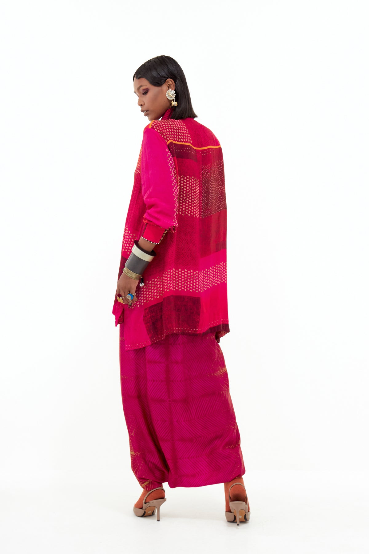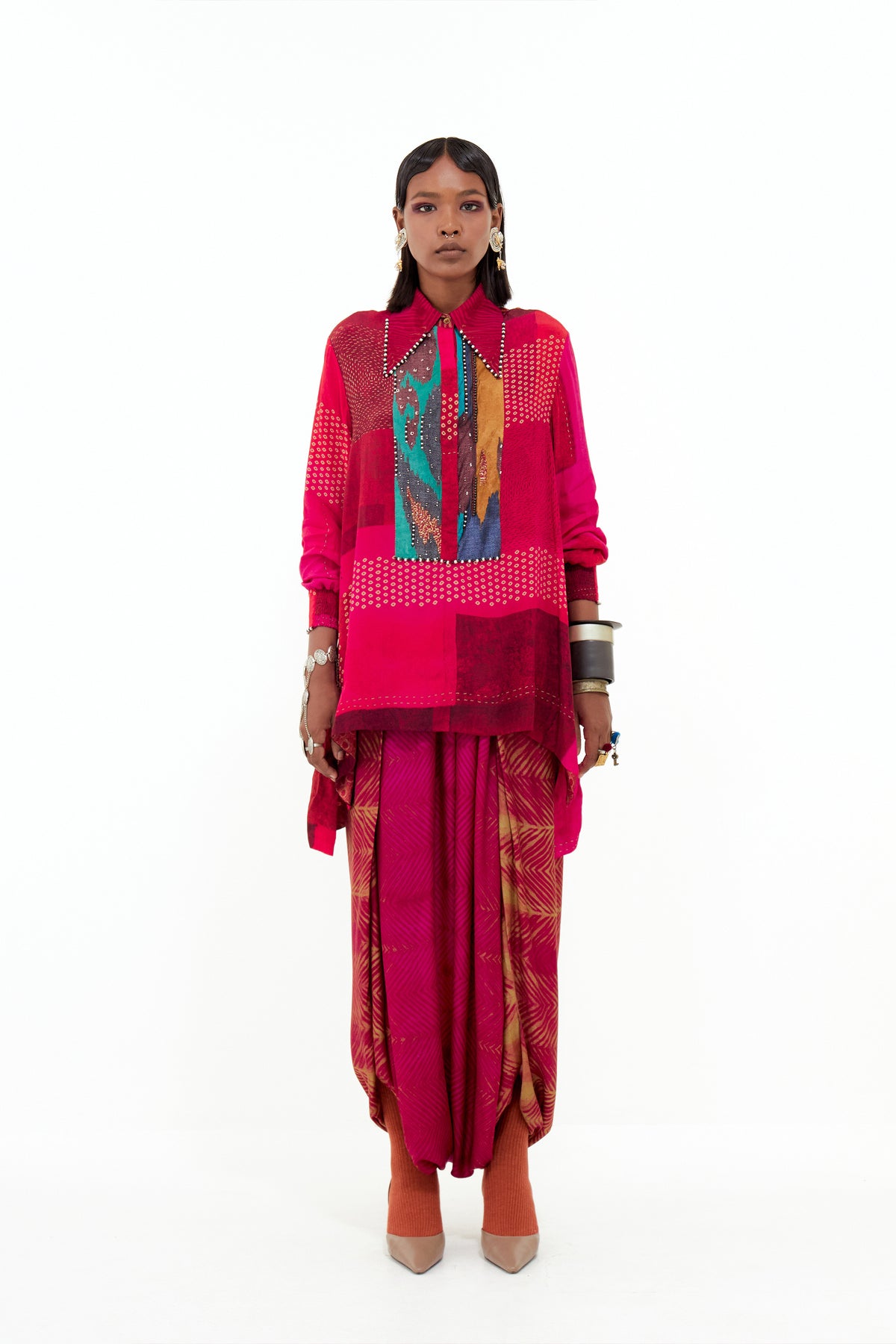 Collage print straight shirt with embroidered collar paired with shibori print drape trouser.