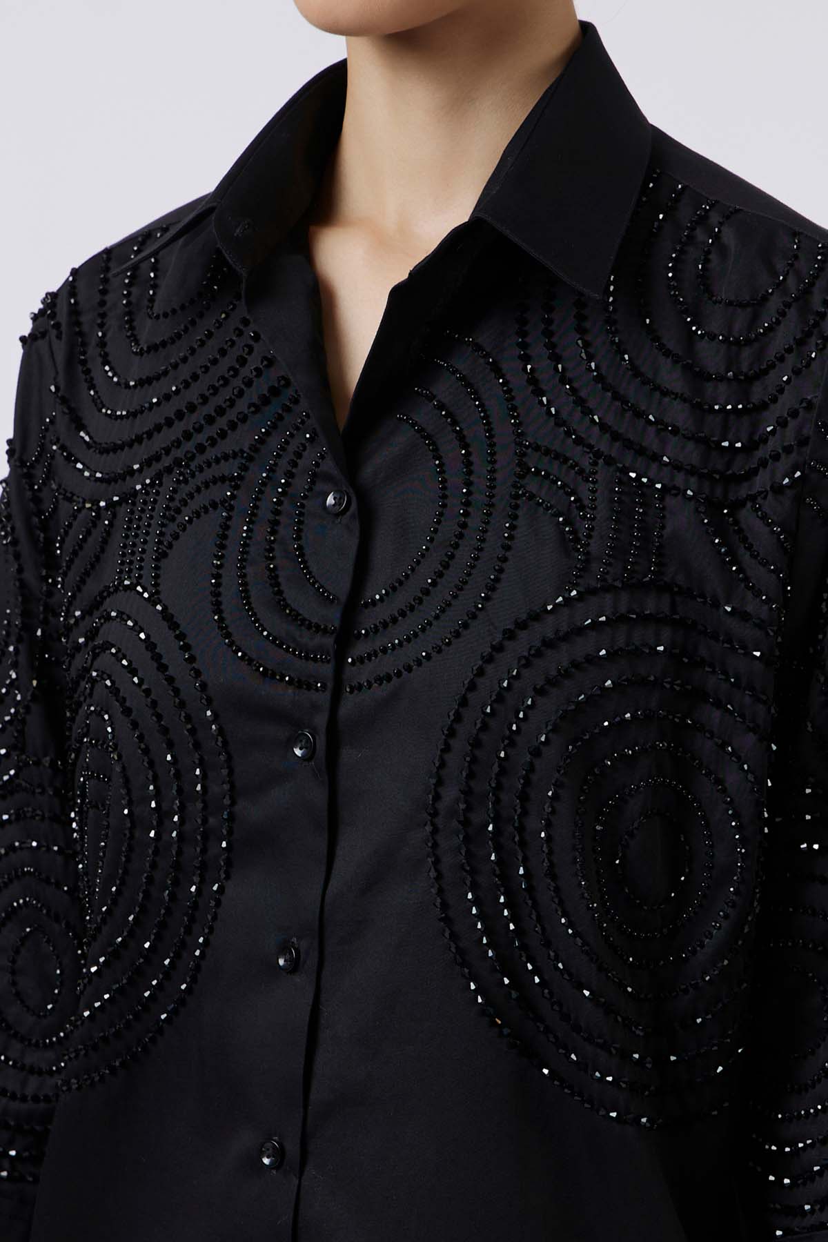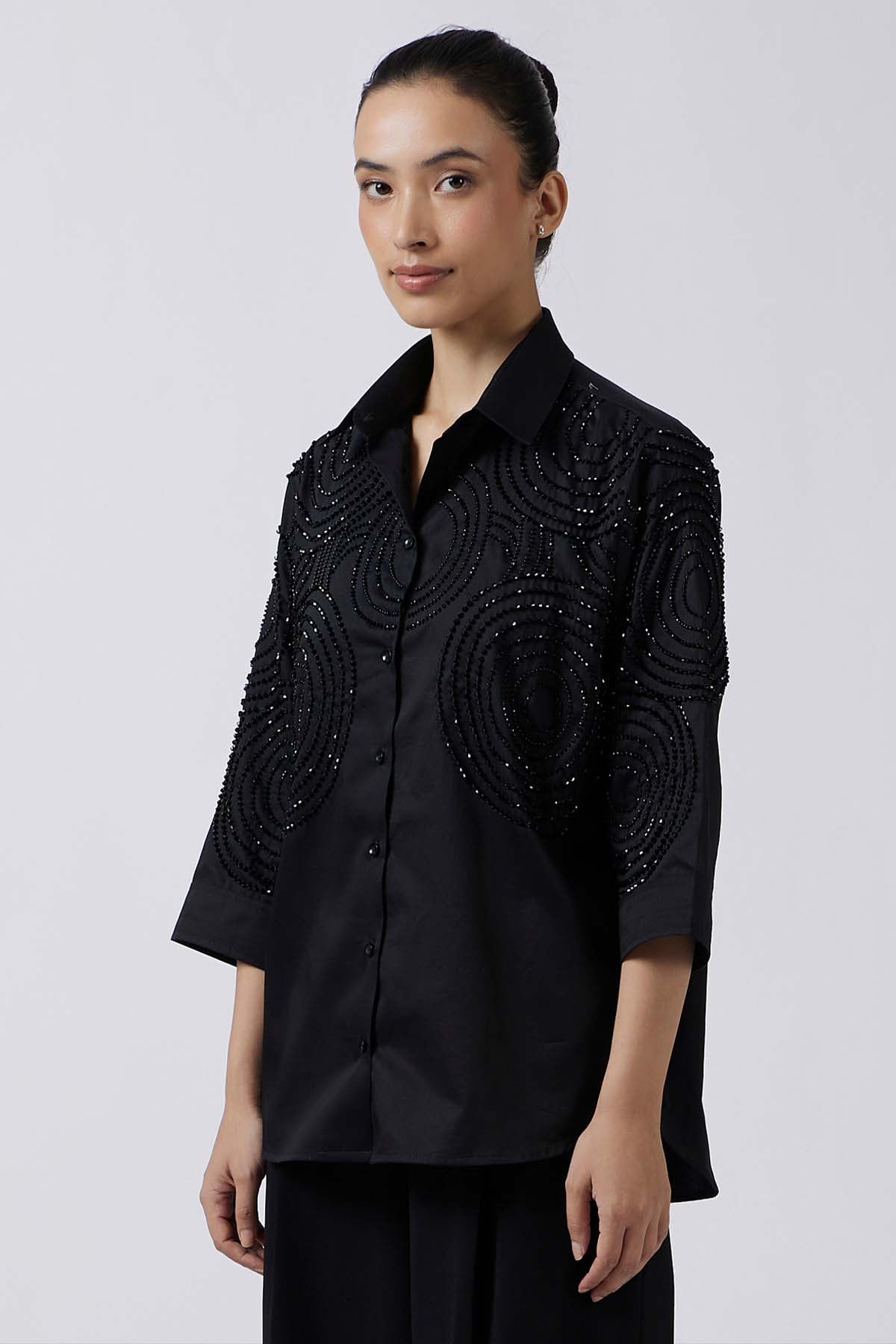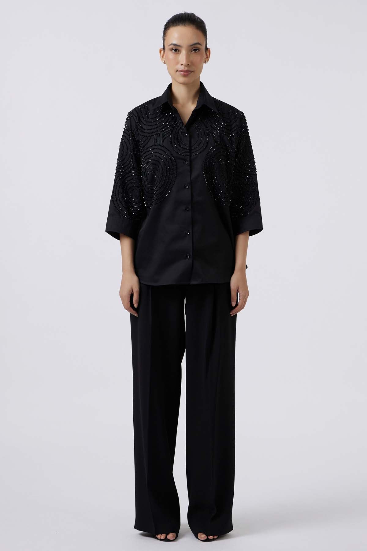 A pristine celeste black shirt redefined with hand-embroidered bead detailing. designed with delicate circular motifs, the beadwork adds subtle shimmer and depth while blending seamlessly into the purity of Black-on-Black embroidery.Crafted in fine fabric with a refined silhouette, this piece embodies timeless elegance and couture-inspired craftsmanship.Paired with black straight fit pants