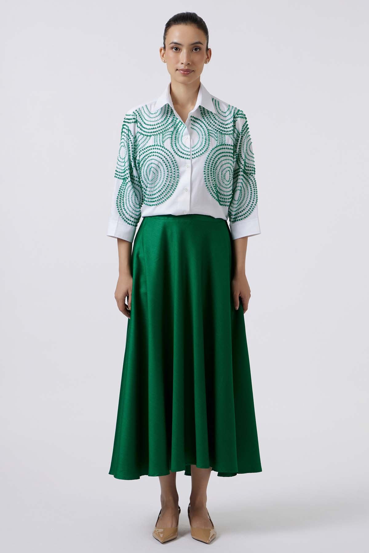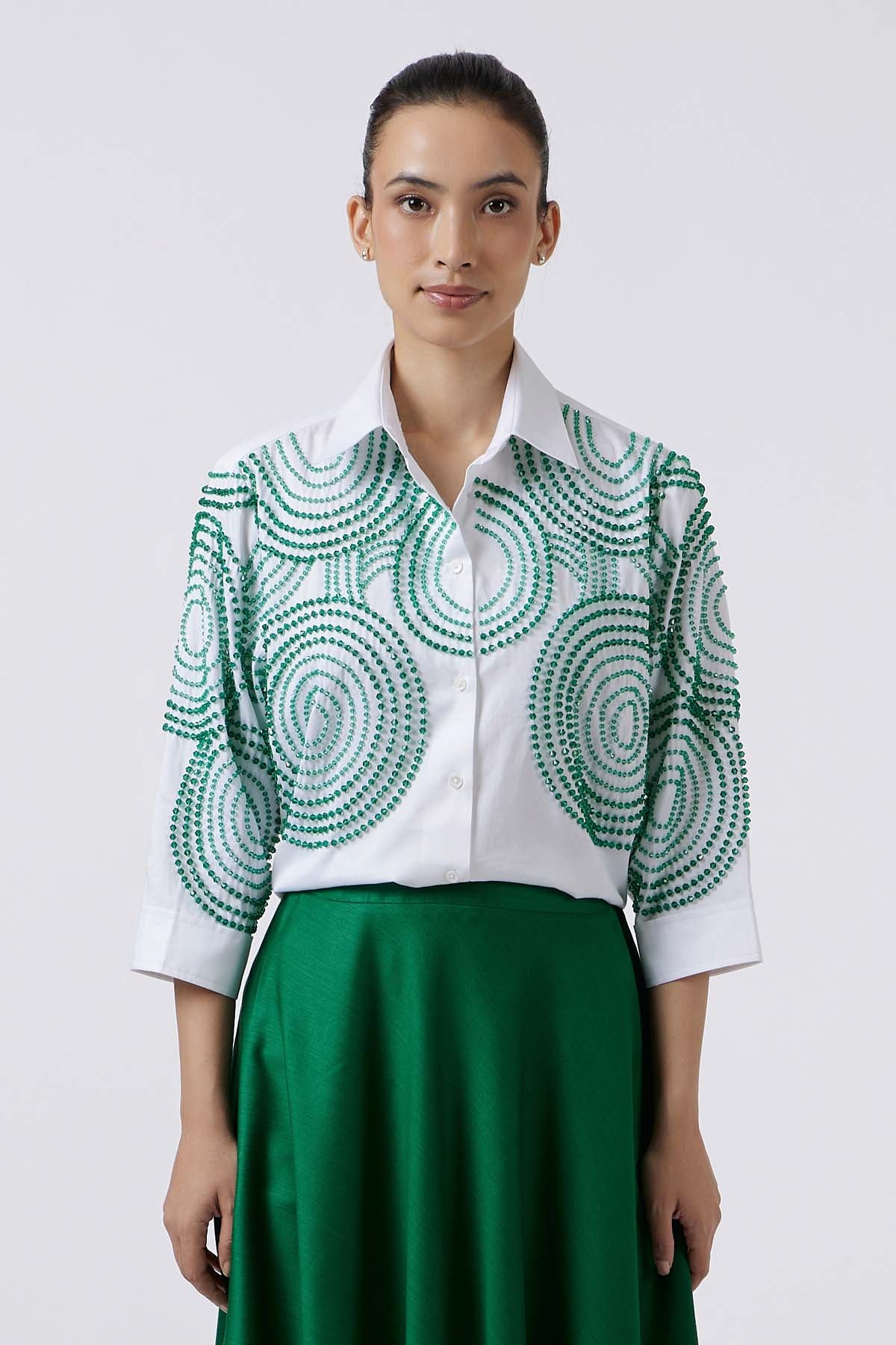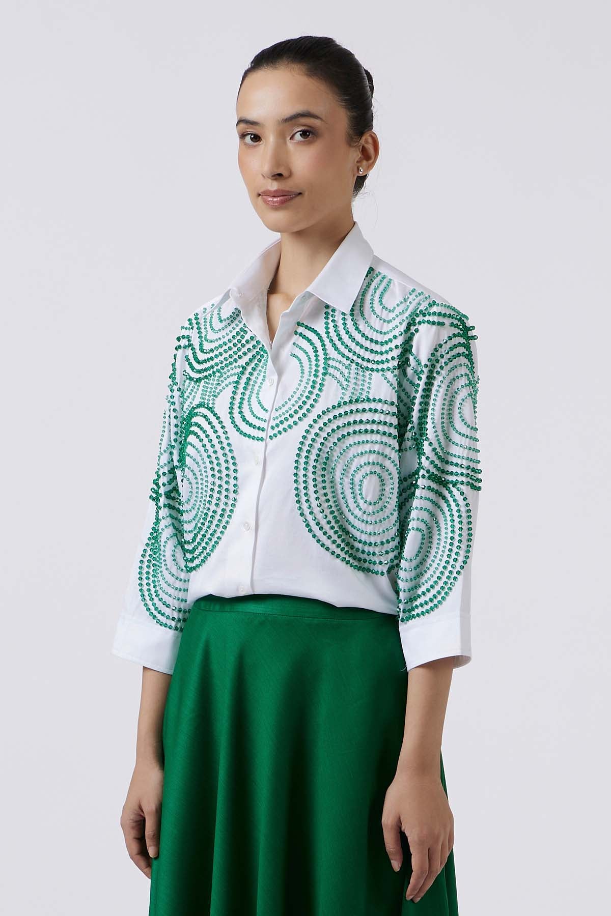 A pristine celeste emerald crop shirt redefined with hand-embroidered bead detailing. Designed with delicate circular motifs, the beadwork adds subtle shimmer and depth while blending seamlessly into the purity of White-on-Emerald embroidery. Crafted in fine fabric with a refined silhouette, this piece embodies timeless elegance and couture-inspired craftsmanship.