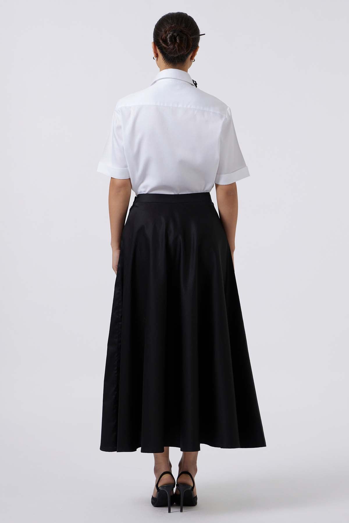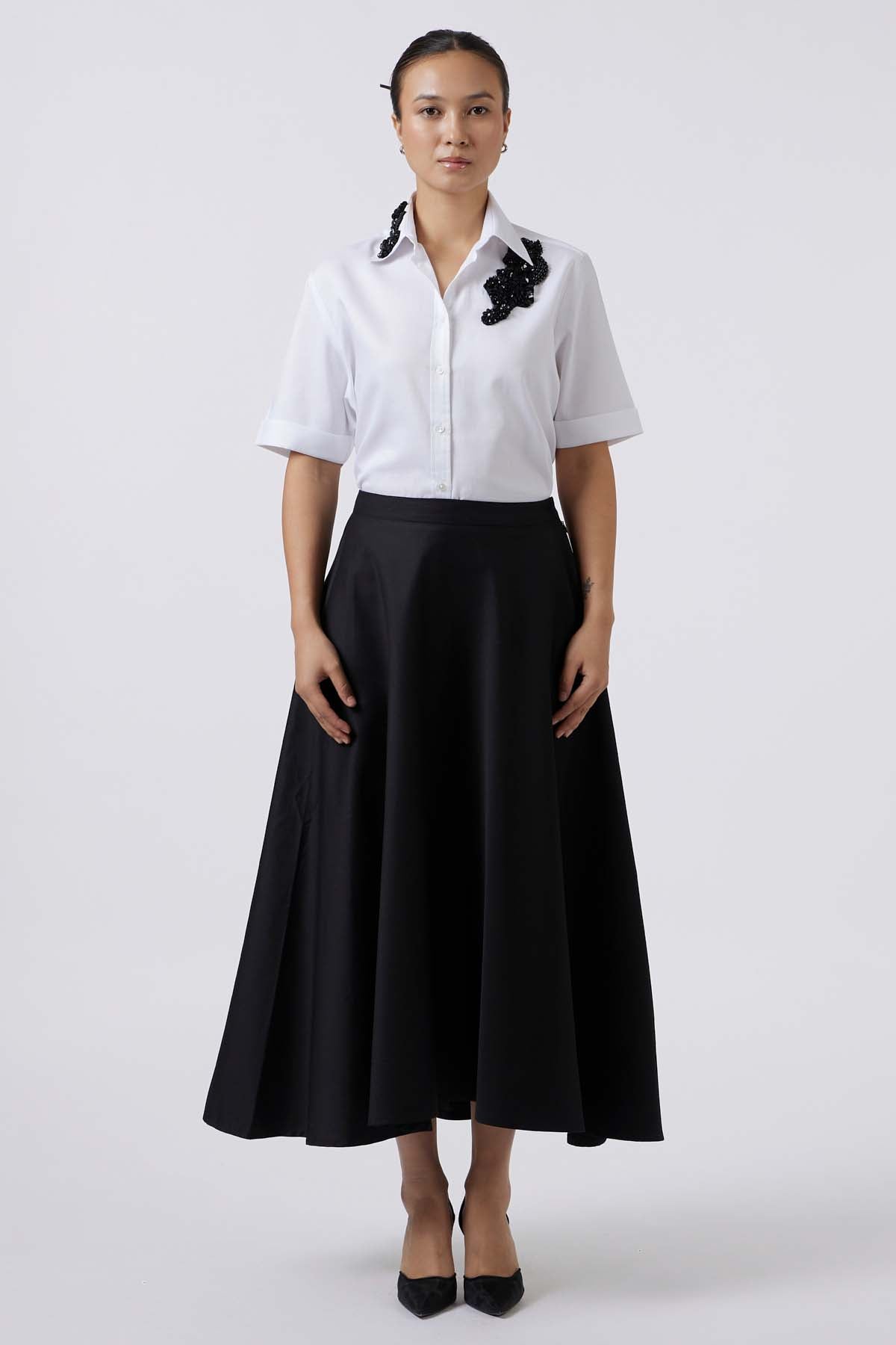 A modern classic reimagined through couture detail, this white crop shirt is elevated with intricate hand embroidery. Featuring a sharp classic collar and half sleeves, it is adorned with two appliquéd motifs placed thoughtfully on the collar and shoulder. Each motif is crafted on delicate tulle, richly embellished with sequins and beads of varying sizes and materials, creating a striking textural contrast. Entirely hand-finished, this piece embodies refined craftsmanship and timeless sophistication, paired with flared black pima cotton skirt