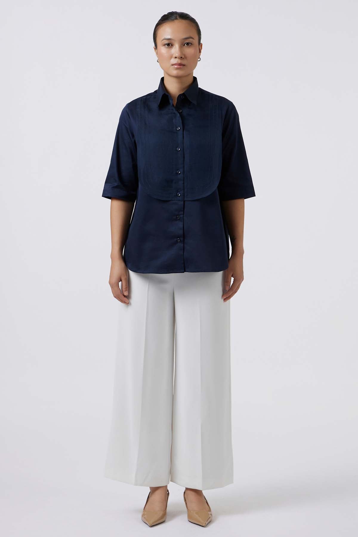 Tailored in lustrous pima cotton, this shirt is elevated with a sheer pure organza bib, distinguished by three fine stitch-line details that highlight its architectural precision. The elbow-length sleeves lend modern proportion, while the interplay of opaque satin and translucent organza creates a refined contrast. A contemporary expression of structure and softness, this piece embodies timeless luxury with couture subtlety.