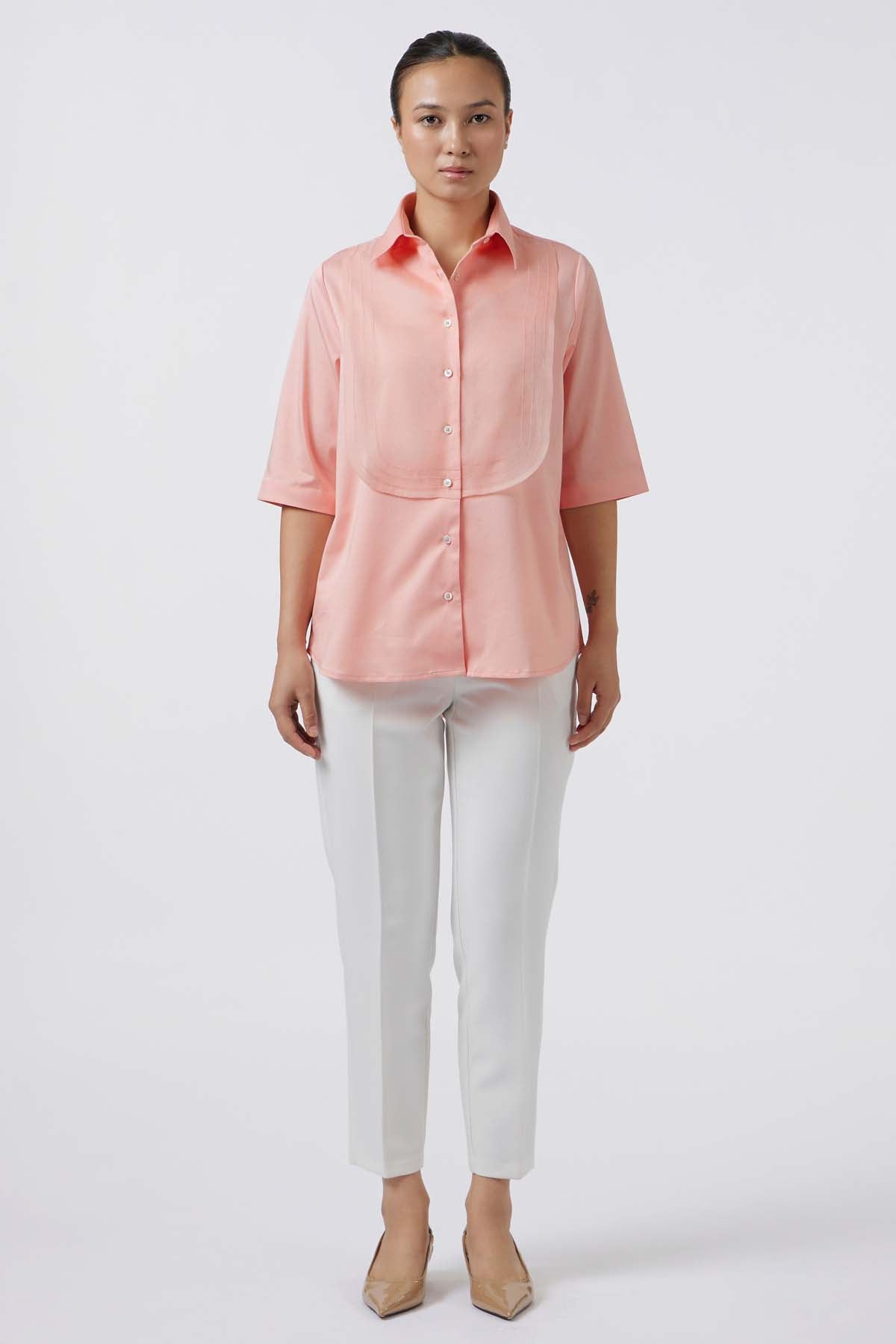 Tailored in lustrous pima cotton, this shirt is elevated with a sheer organza bib, distinguished by three fine stitch-line details that highlight its architectural precision. The elbow-length sleeves lend modern proportion, while the interplay of opaque satin and translucent organza creates a refined contrast. A contemporary expression of structure and softness, this piece embodies timeless luxury with couture subtlety.