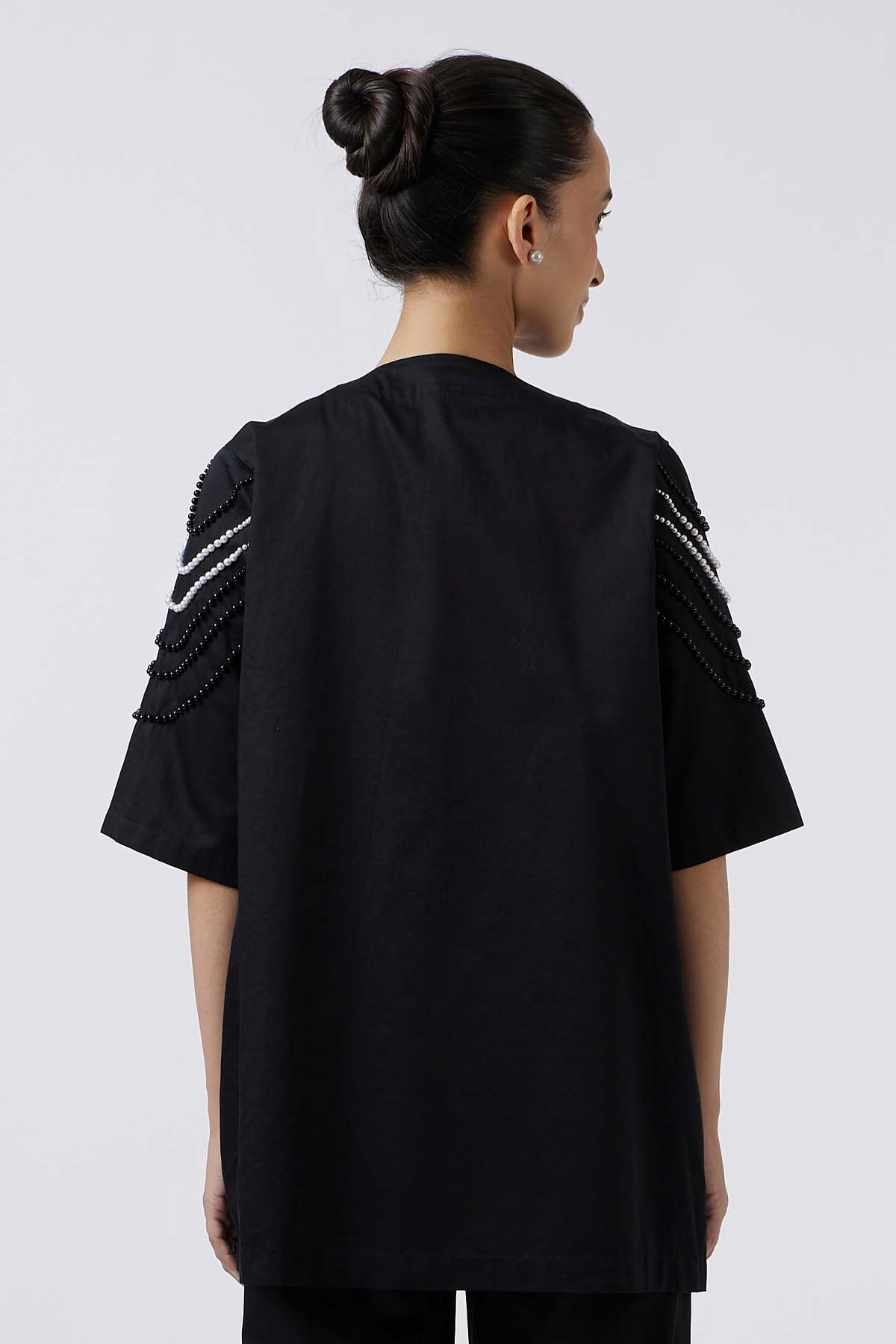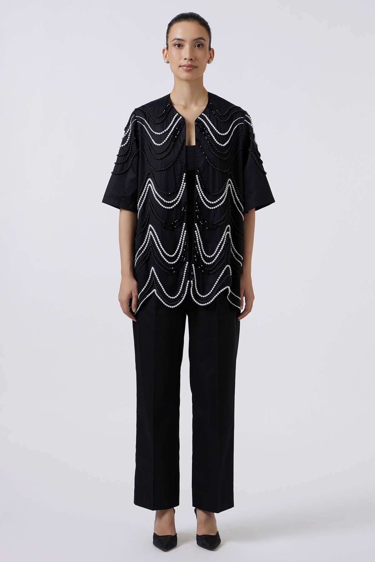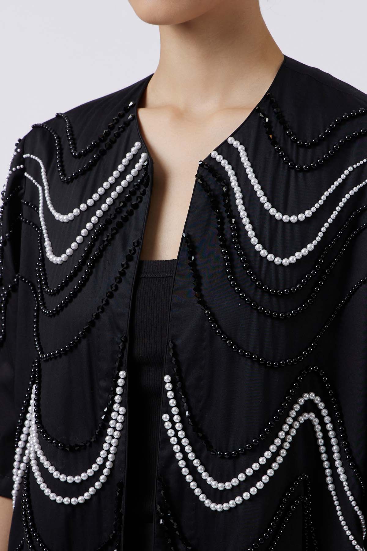 A statement in texture and craftsmanship, this jacket features graceful three-fourth sleeves and a sculpted silhouette. White and black pearls are hand crafted in fluid wave formations, creating movement and depth across the surface. Tailored with precision, it combines timeless elegance with contemporary artistry—an iconic piece that elevates any ensemble with luminous sophistication.