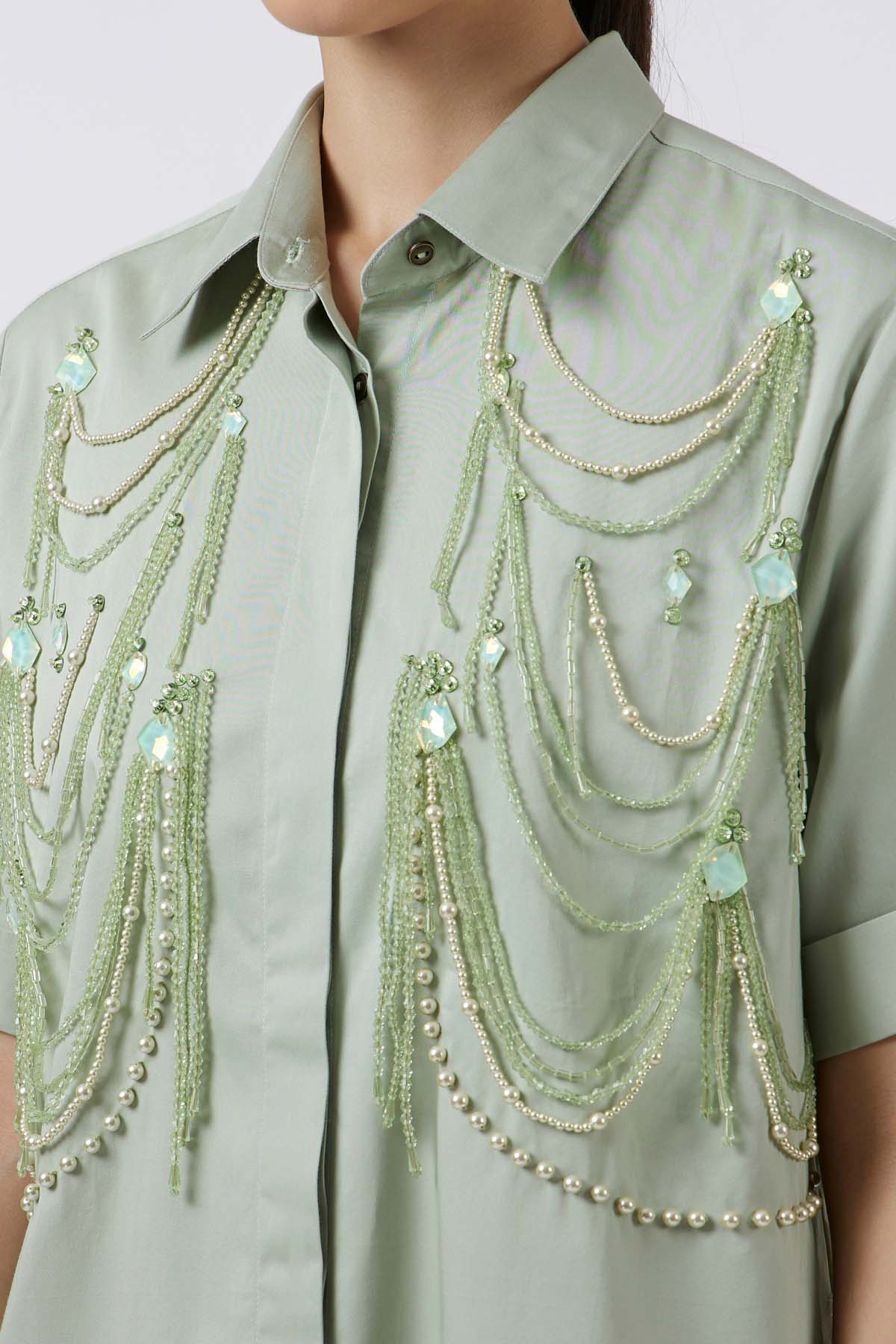 Crafted in soft pima cotton, this pistachio fringe shirt combines comfort with striking detail. Short sleeves frame a playful yet sophisticated silhouette, while mixed-material fringes cascade across the shirt, creating movement and texture with every step. The interplay of lustrous metallic tones and artisanal fringe work gives this piece a modern, elevated edge — perfect for making a statement with understated luxury.Paired with straight-fit pants featuring side pockets and an elasticated back waist, the look balances tailored precision with modern ease. A harmony of bold design and fluid fabric, it is elegance reimagined through structure and wearability