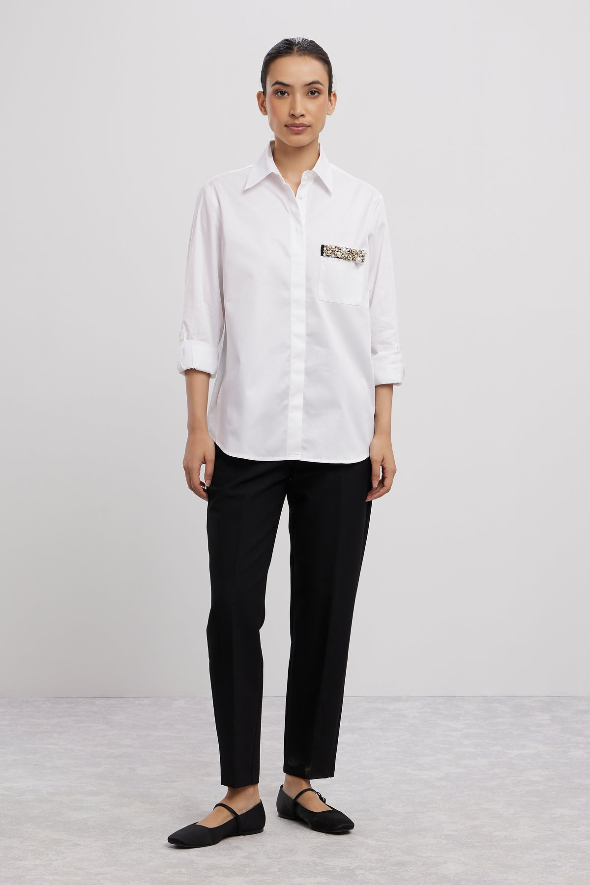 The sky blue pearl strip pocket shirt is a modern twist on a classic design. Its relaxed fit and classic collar offer comfort and style, while the concealed button placket maintains a sleek silhouette. Rolled up ,sleeves the shirt is elevated by the eye-catching pearl strip embellished pocket, adding a touch of opulence to this contemporary piece.