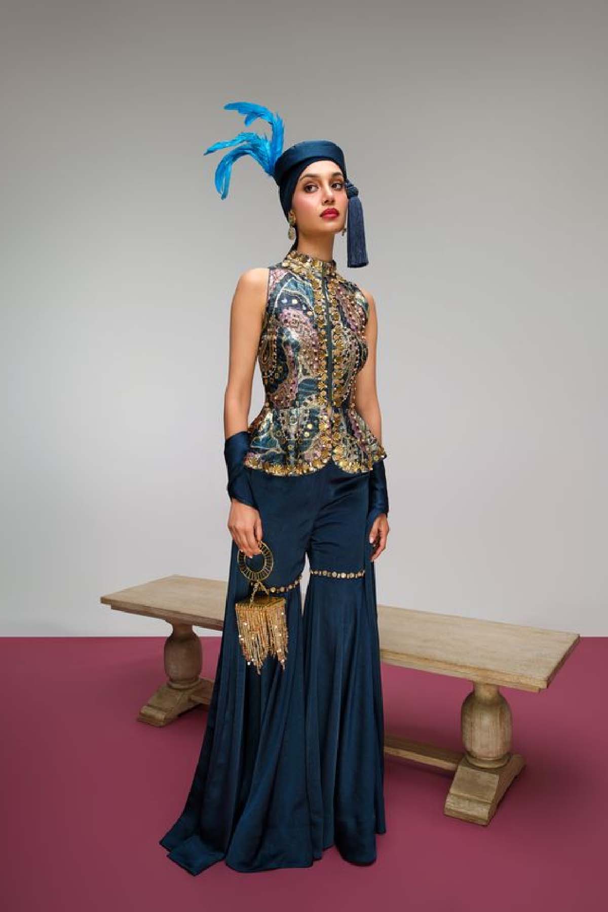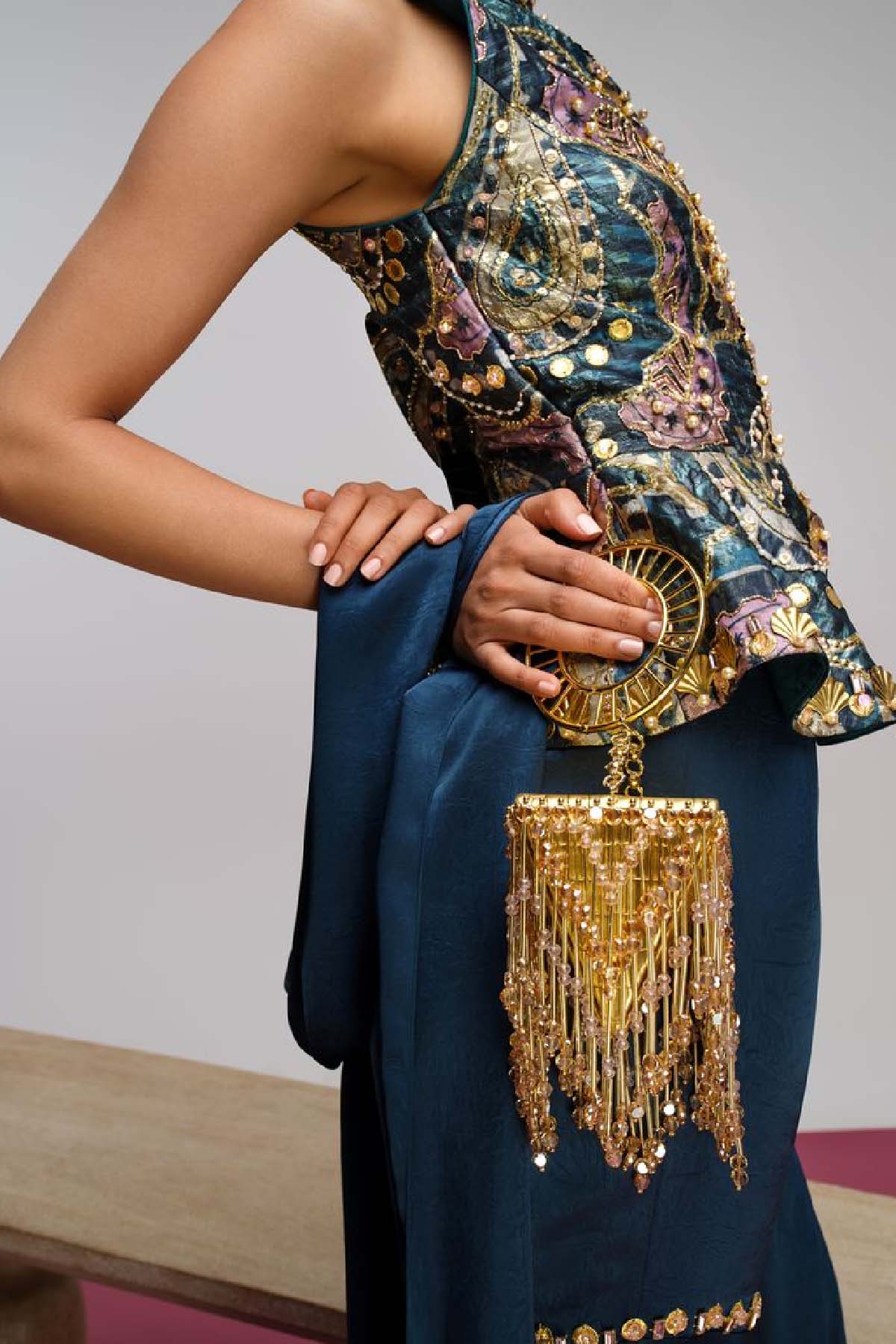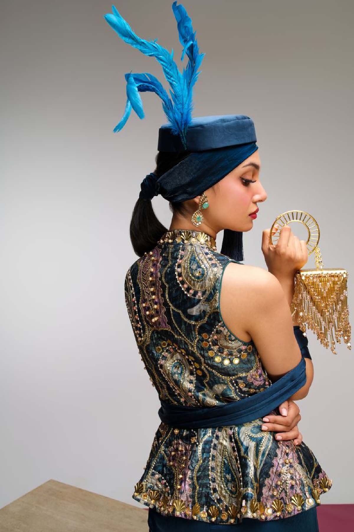 A playful statement that celebrates the spirit of the papaverse. The front-zip peplum top is crafted in luxe jacquard, brought alive with hand-illustrated printed paisley motifs and signature papaverse storytelling. Intricately embroidered with metallic coins, sequins and pearls, it shimmers with movement and texture while maintaining a sculpted, flattering silhouette.