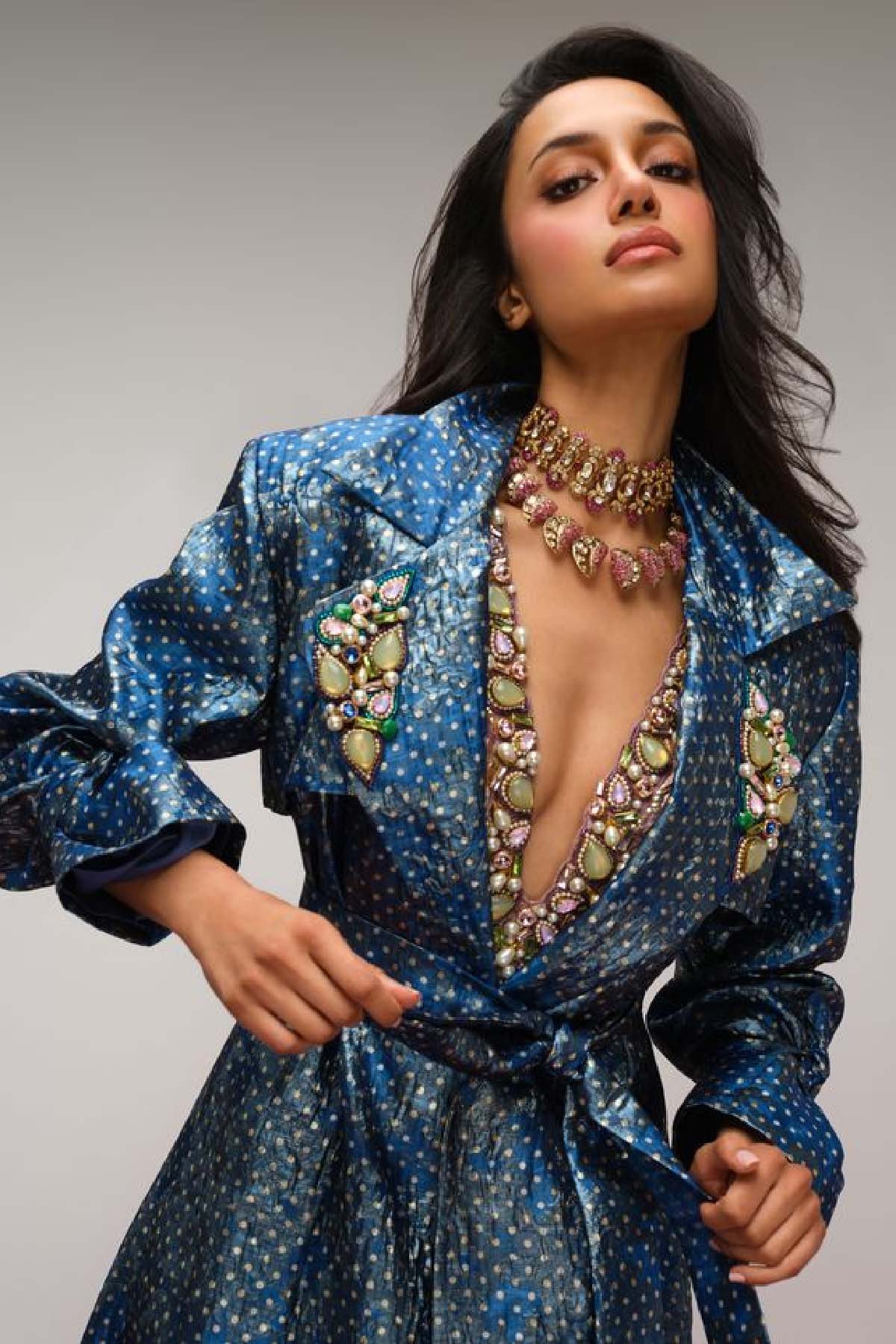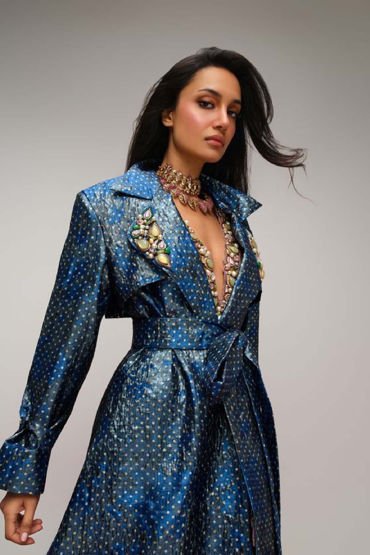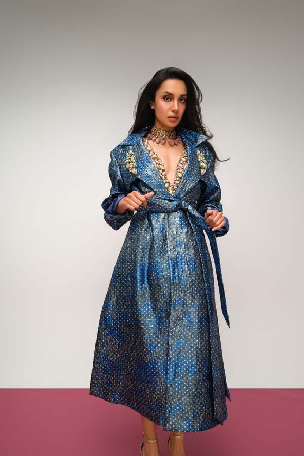 Crafted in luxe jacquard in a light petrol blue, this trench coat falls elegantly to the calves and is designed with a structured silhouette that can be worn belted for definition or open for effortless ease. Adjustable tie-ups at the sleeves and a bold statement collar add character and versatility to the piece.