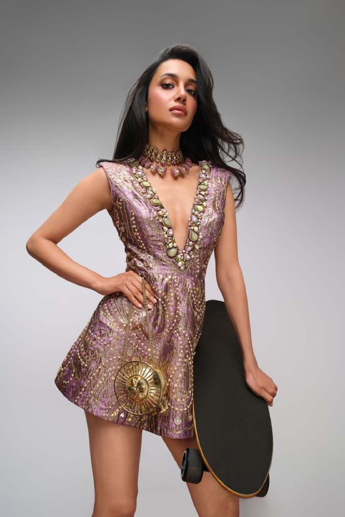A romantic statement in modern vintage glamour. This fit-and-flare dress is crafted in luxe pink jacquard, printed with vintage-inspired paisleys and intricately embroidered all over with metallic detailing, pearls and sequins for a soft, luminous finish. The deep v neckline is richly embellished with jewels, coloured beads and pearls, creating a striking focal point that elevates the silhouette.