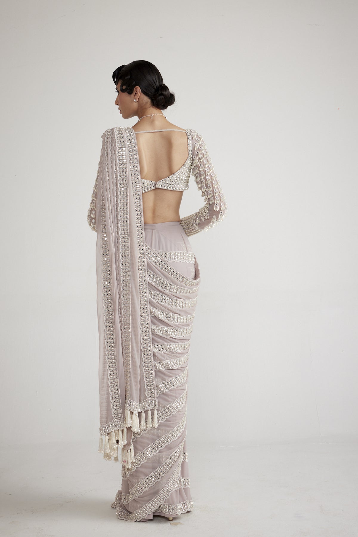 Ash pink chandelier pearl drop saree clubbed with a hand embroidered full sleeve blouse