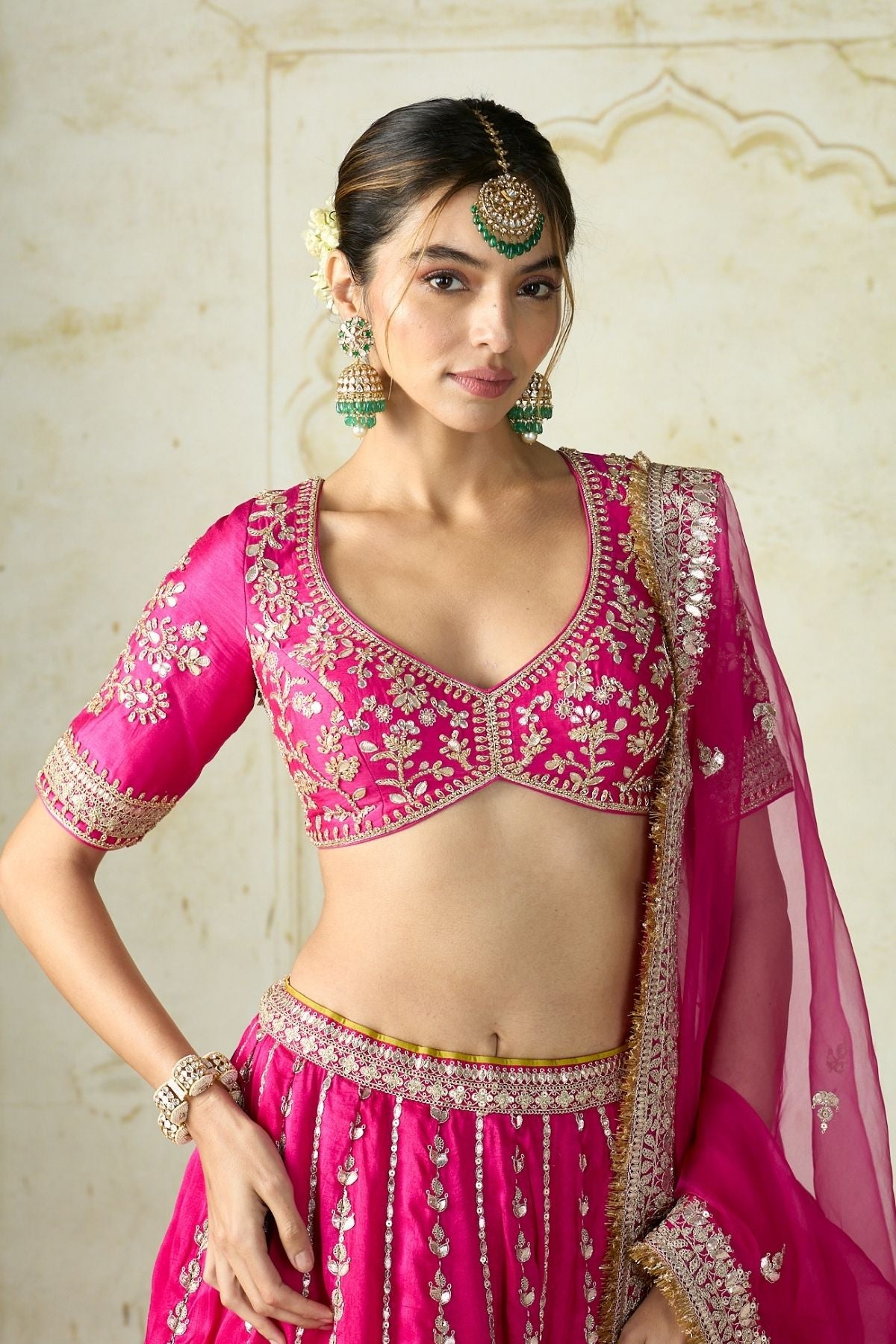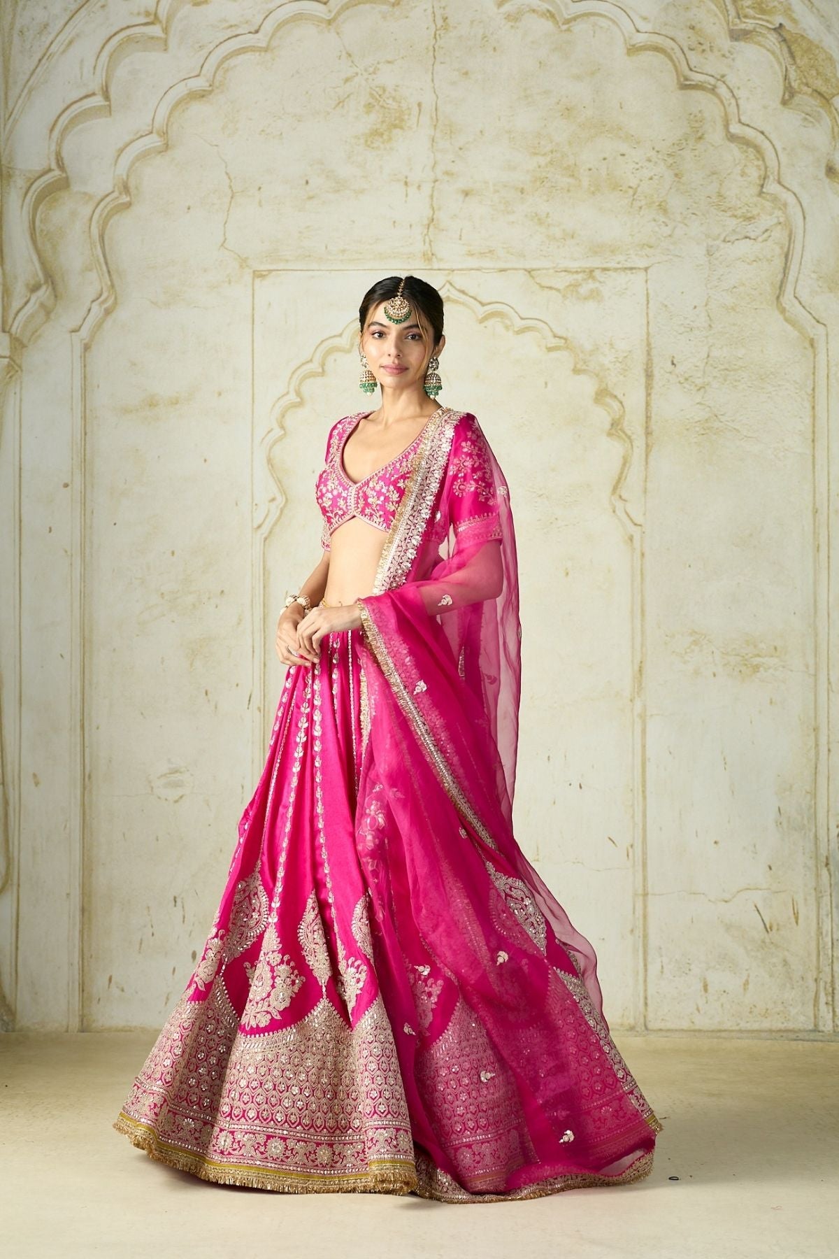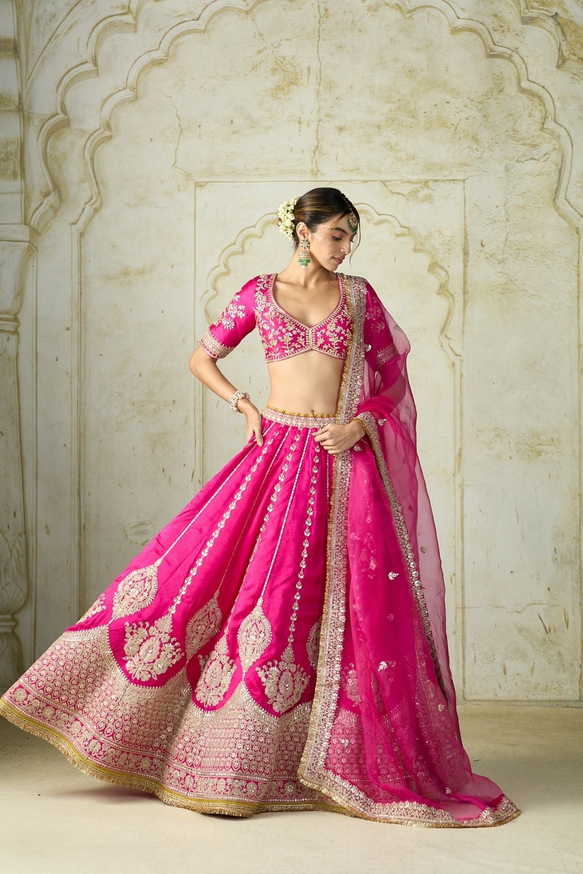 This lehenga set is a stunning blend of grace and grandeur, perfect for weddings and festive occasions. The heavily embroidered blouse with intricate zari and sequin work pairs beautifully with the voluminous flared lehenga, richly adorned with ornate motifs and a heavily embellished border. A sheer dupatta with delicate butti work and a border adds a soft, elegant finish to the look.