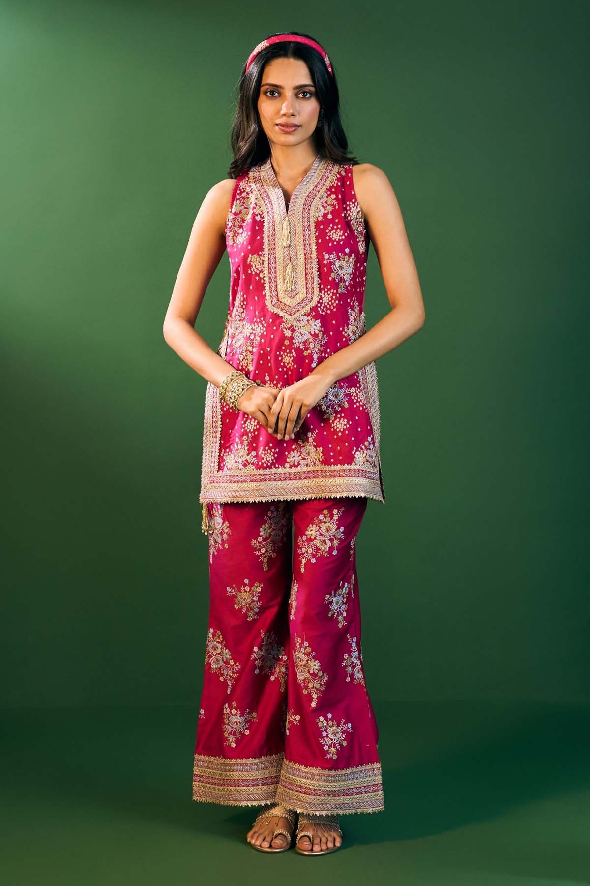 A festive favourite in fuschia, this kurta set is crafted in rich pima satin with delicate floral embroidery. The straight kurta is paired with flared pants for easy movement, perfect for evenings of celebration.