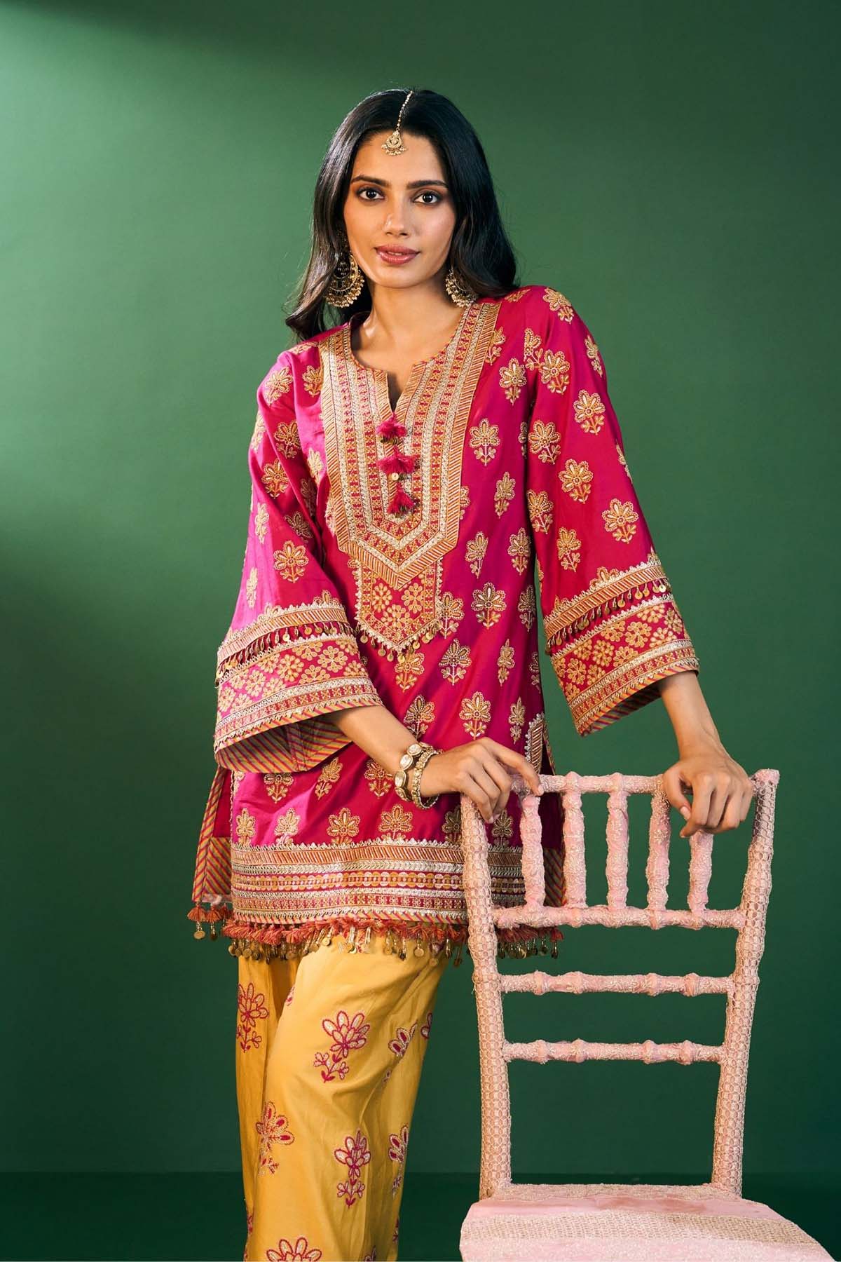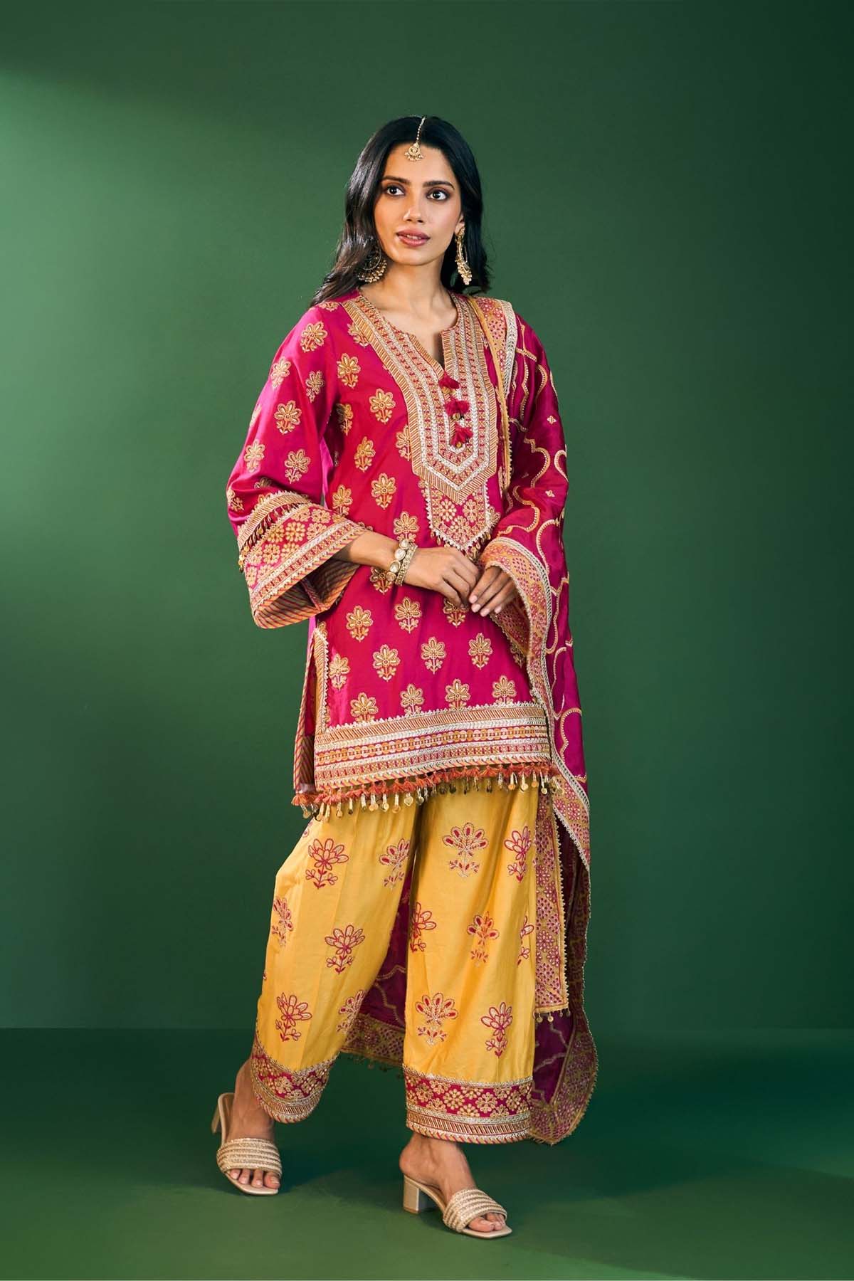 A vibrant pairing in festive tones; this fuschia kurta in soft pima satin is embroidered with fine detailing and paired with contrasting mustard pants. The look is completed with a fluid habotai silk dupatta for an elegant finish.