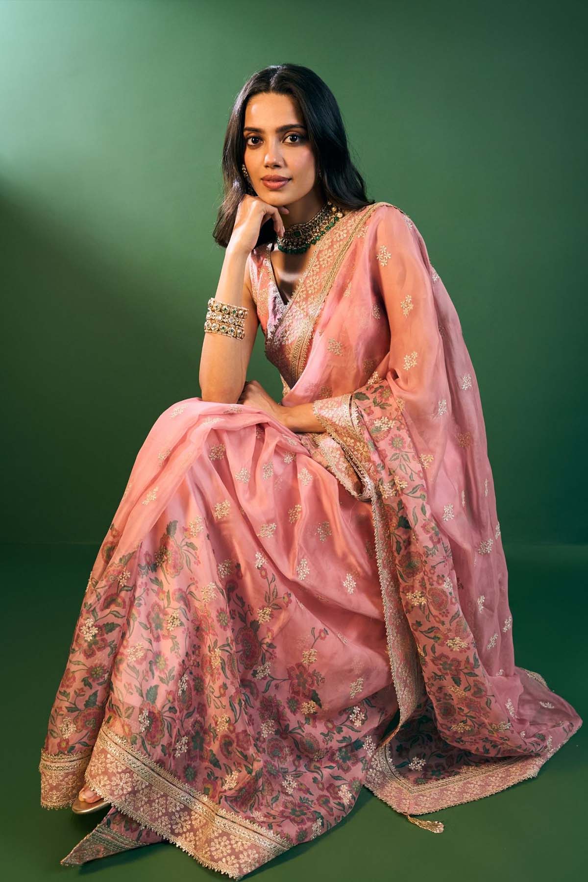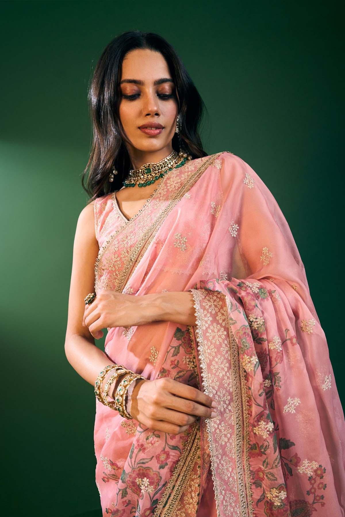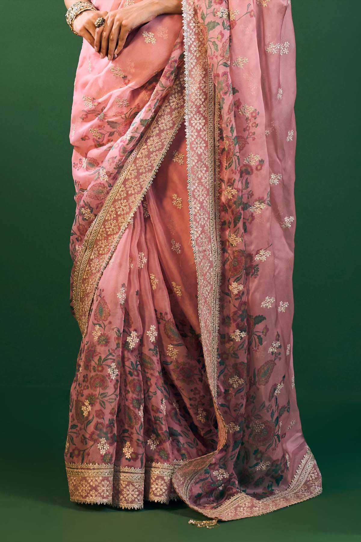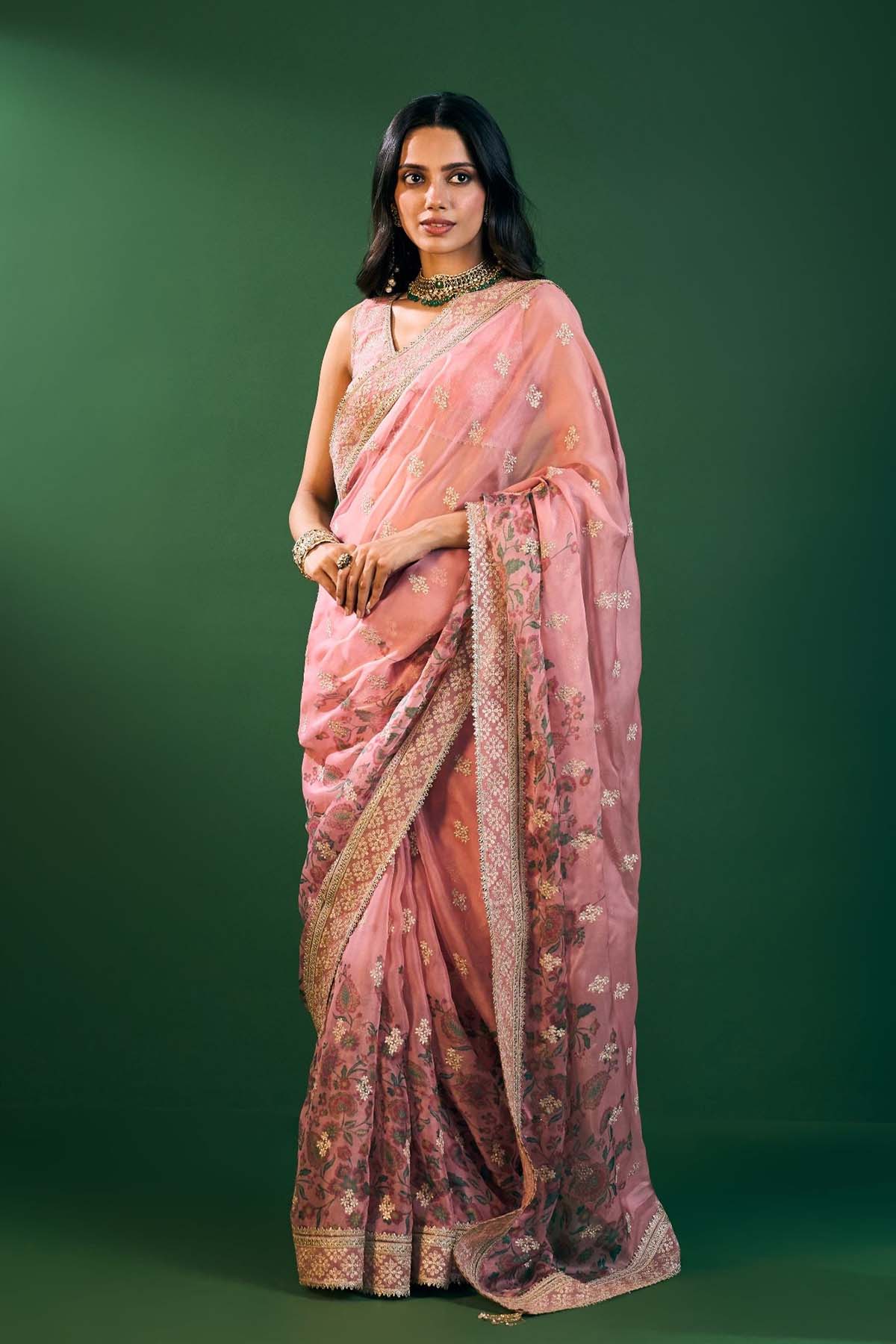 Romantic and refined, this pink printed organza saree is styled with a Pima Satin blouse. A breezy silhouette for day-to-night celebrations.
