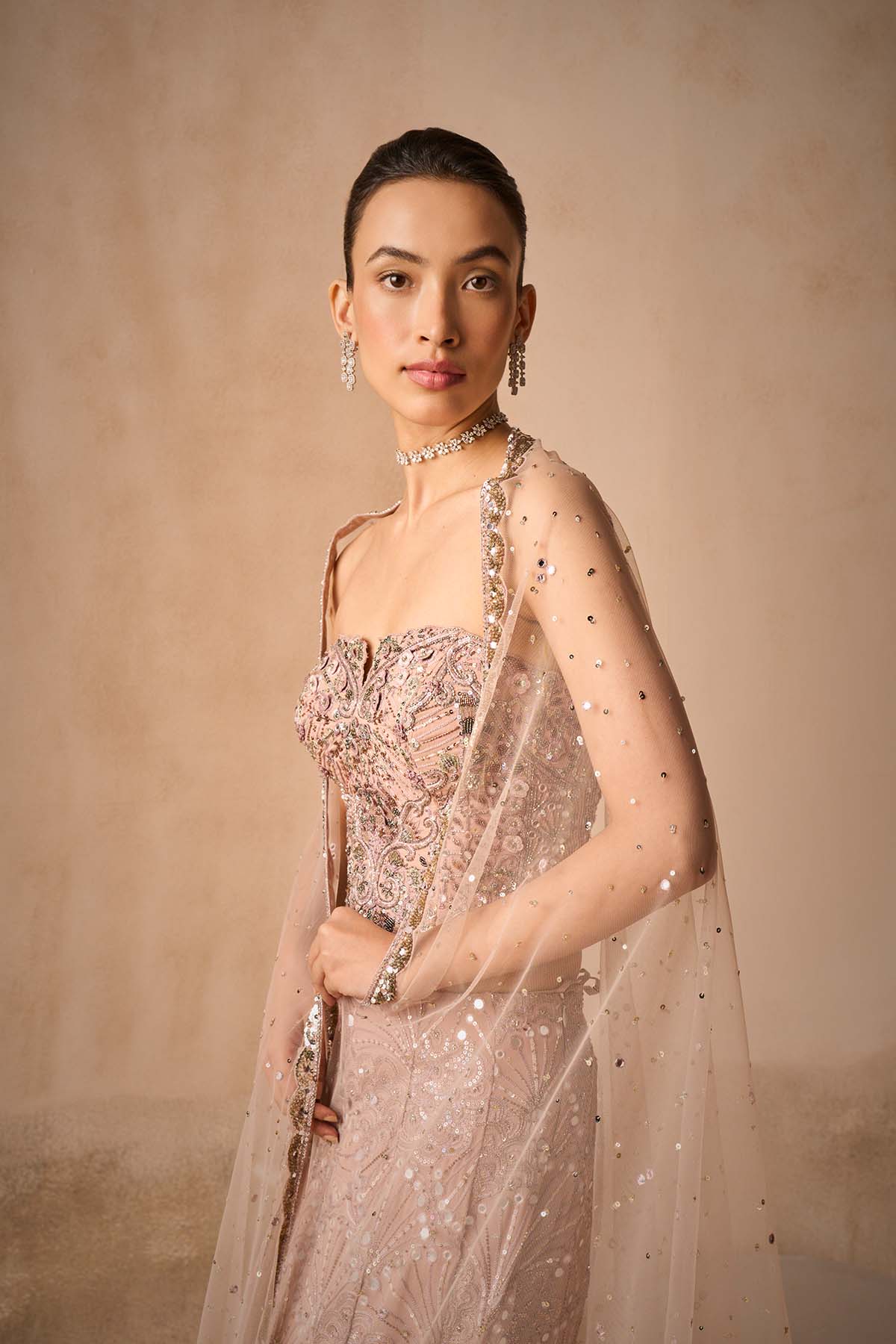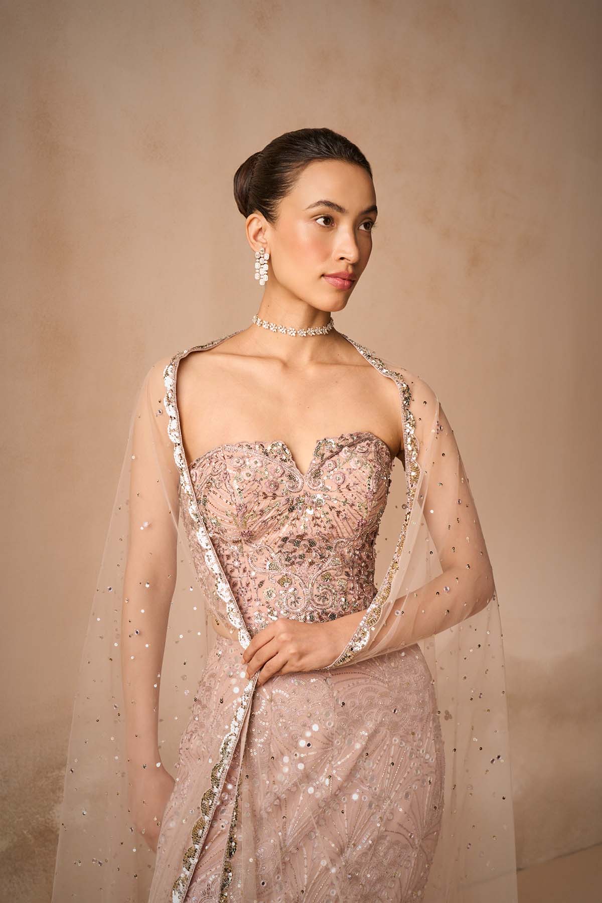 Mauve pink georgette fit and flared lehenga paired with a corset blouse and tulle dupatta.This lovely set has resham,abla,sequin,cutdana,resham and 3d flowers