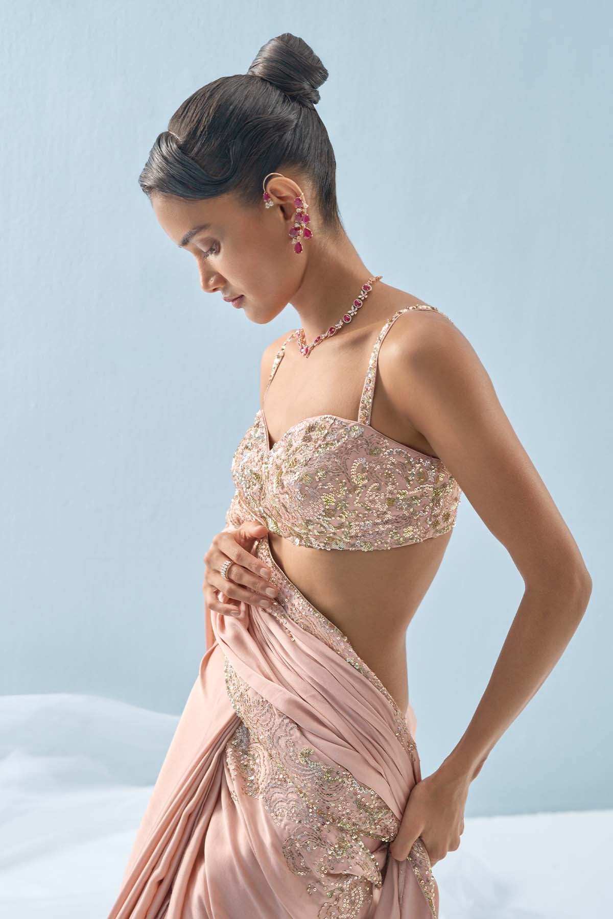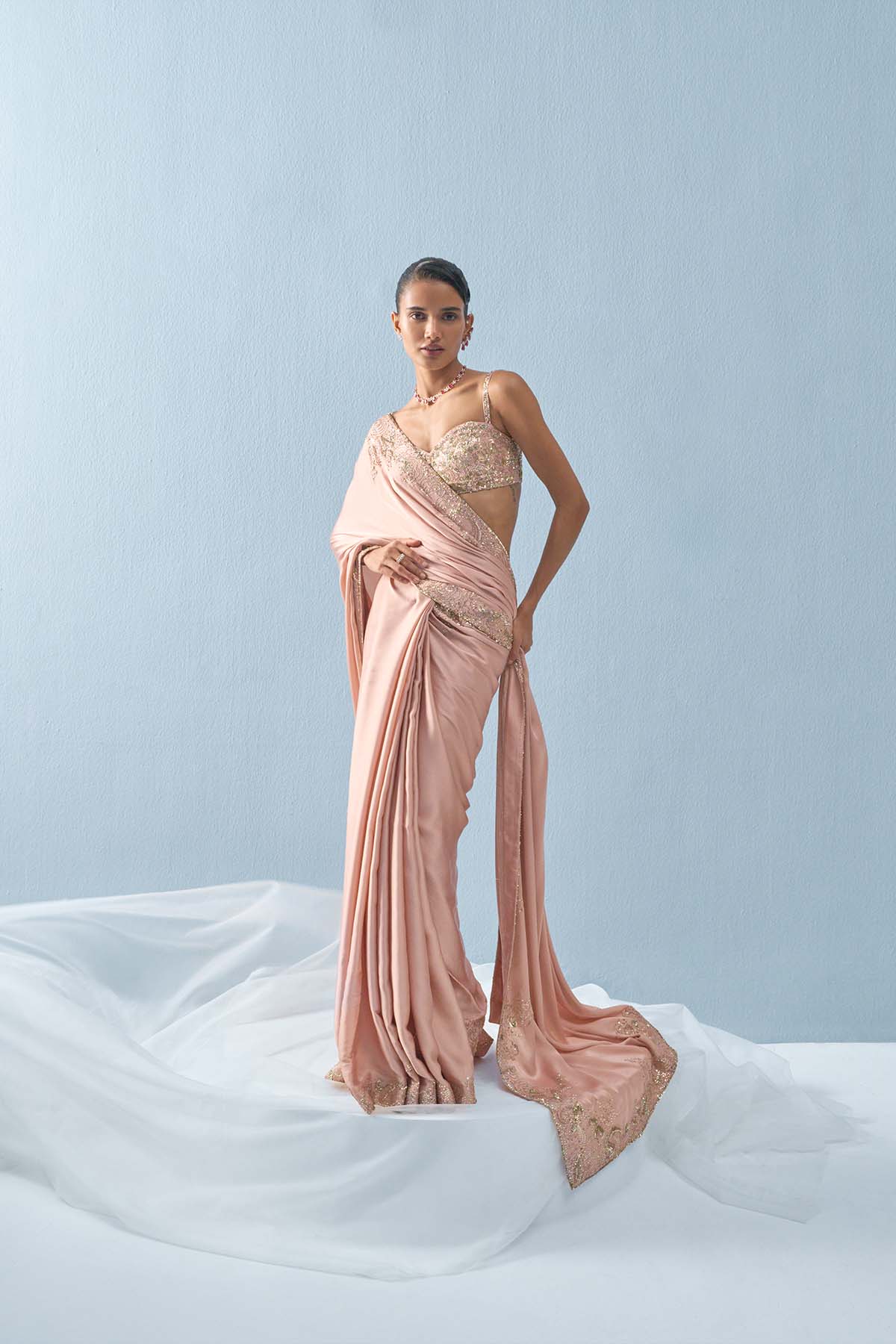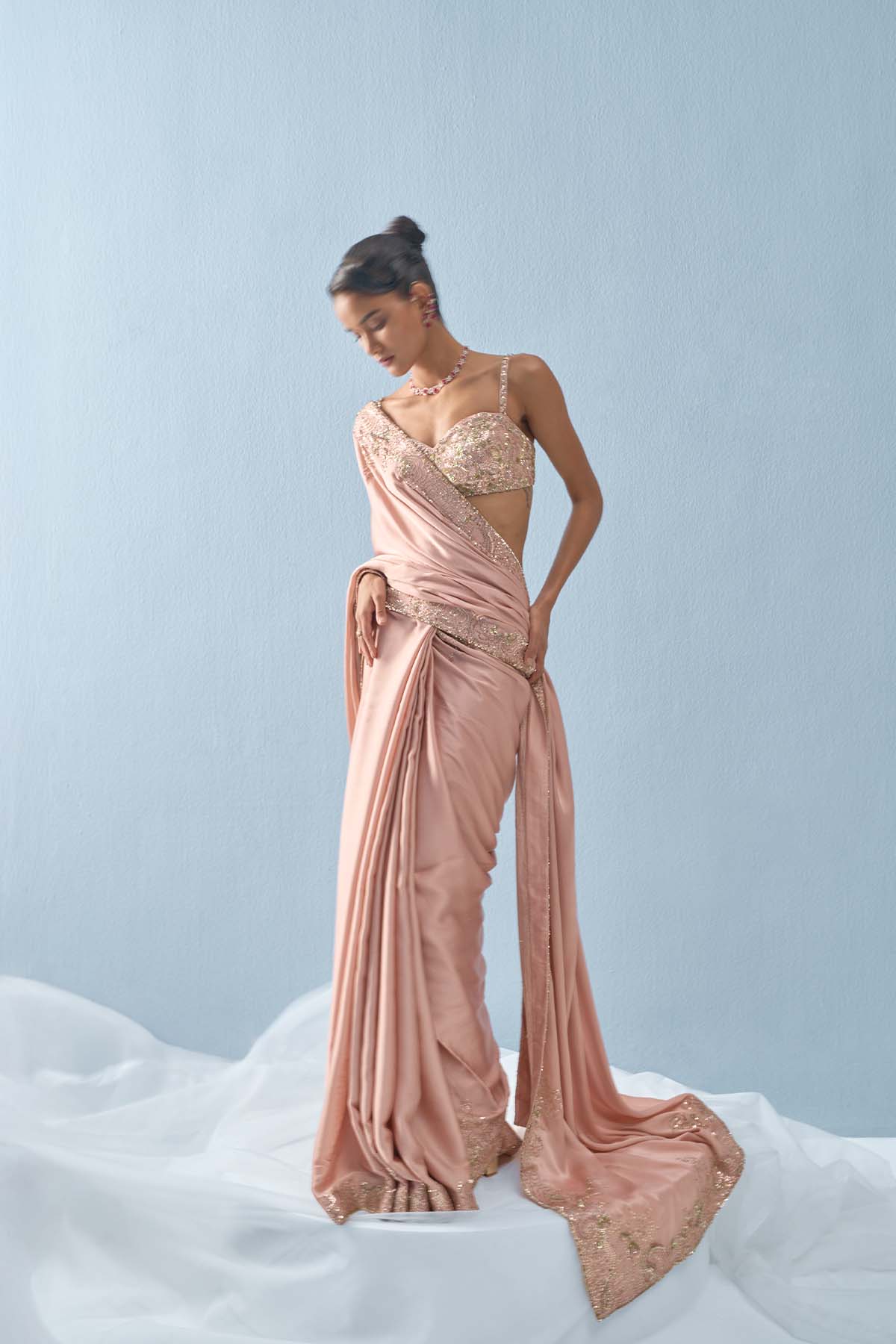 Nude pink satin unstitched saree with a strappy sleeveless blouse.The saree has and embroidered sequin border allover