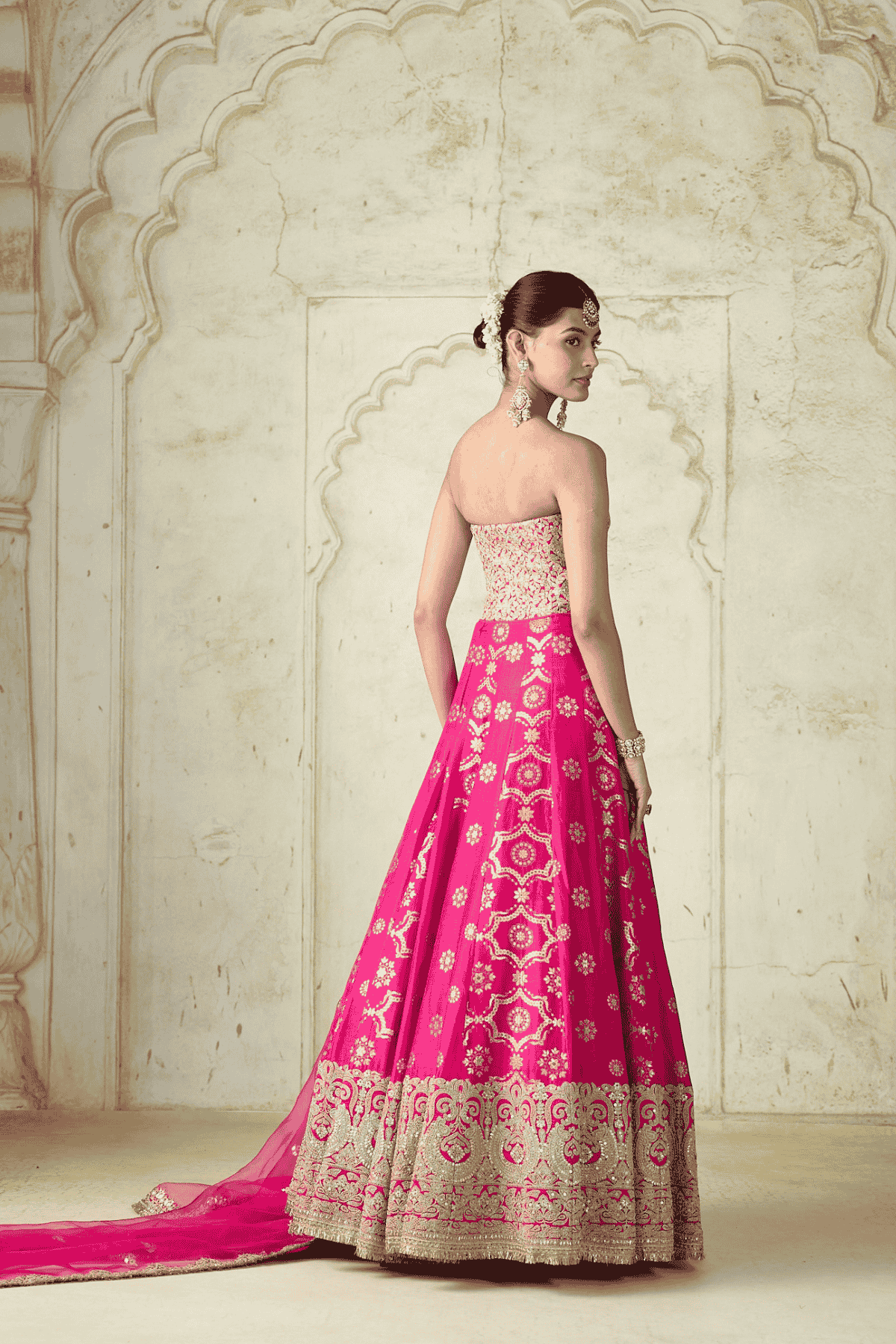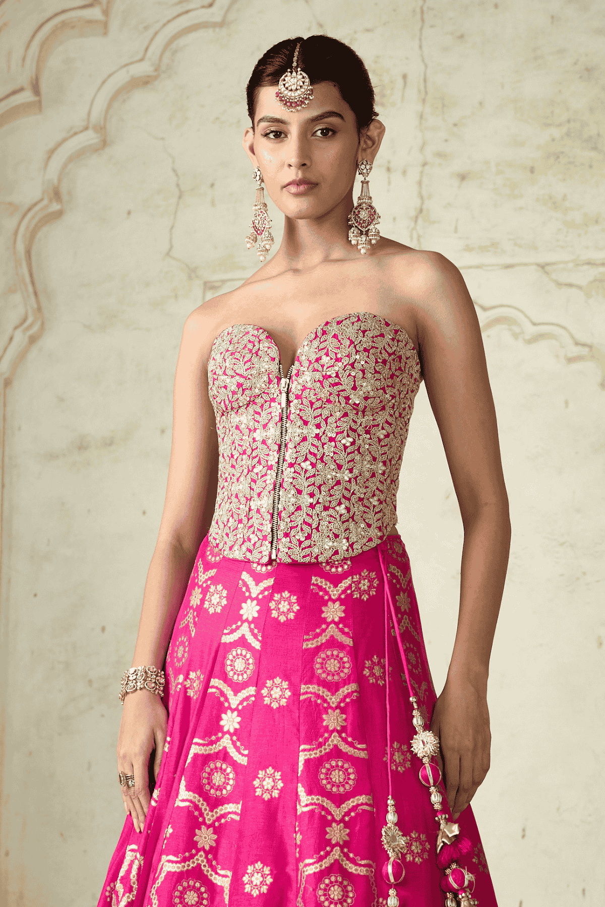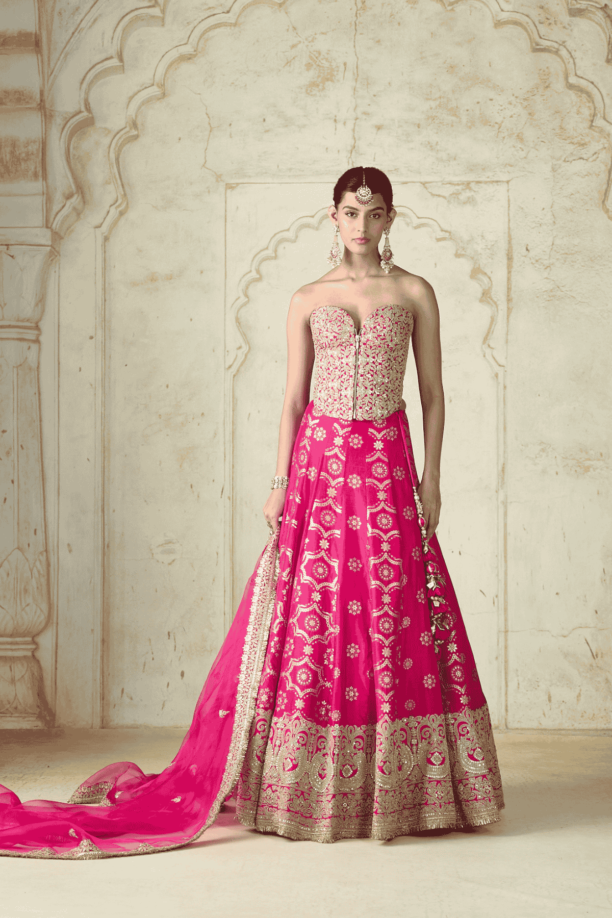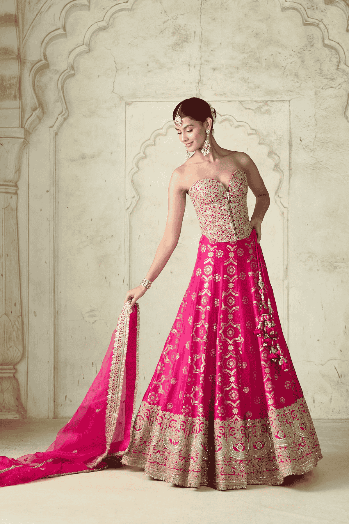 The strapless corset-style blouse is intricately embellished with dazzling embroidery, creating a stunningly structured silhouette.The voluminous flared lehenga is adorned with rich traditional motifs and an intricately embroidered border that adds a regal charm to the ensemble. A matching sheer dupatta edged with delicate lace completes the look.