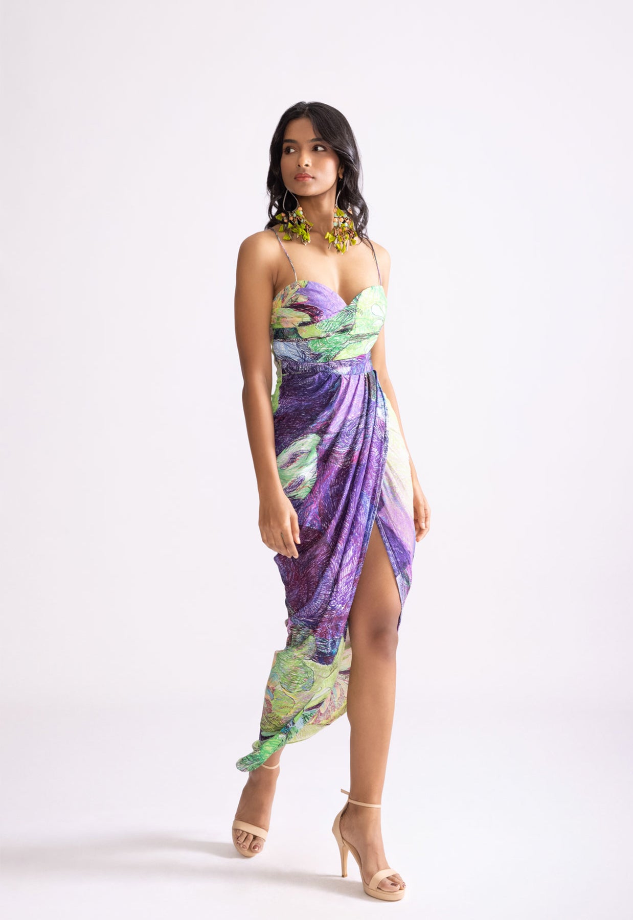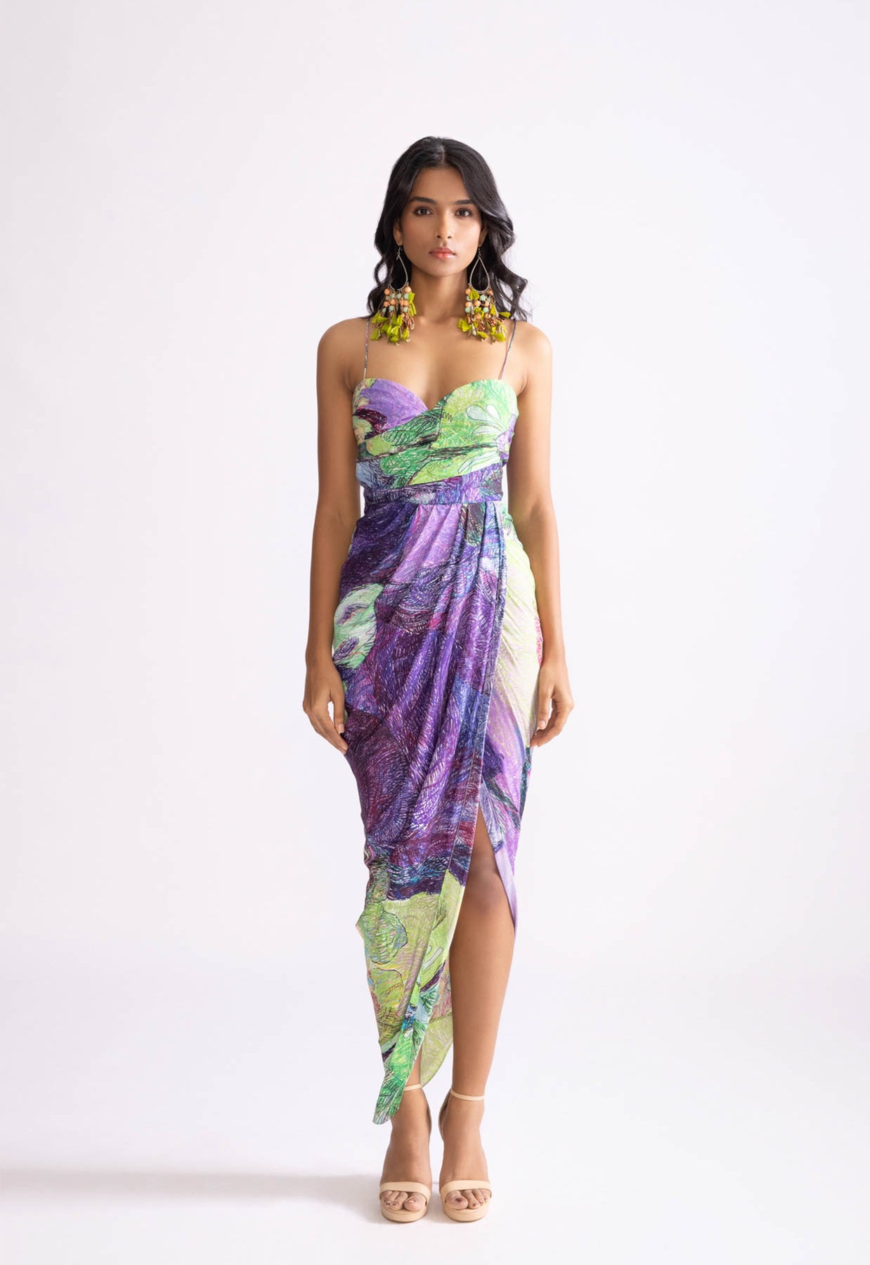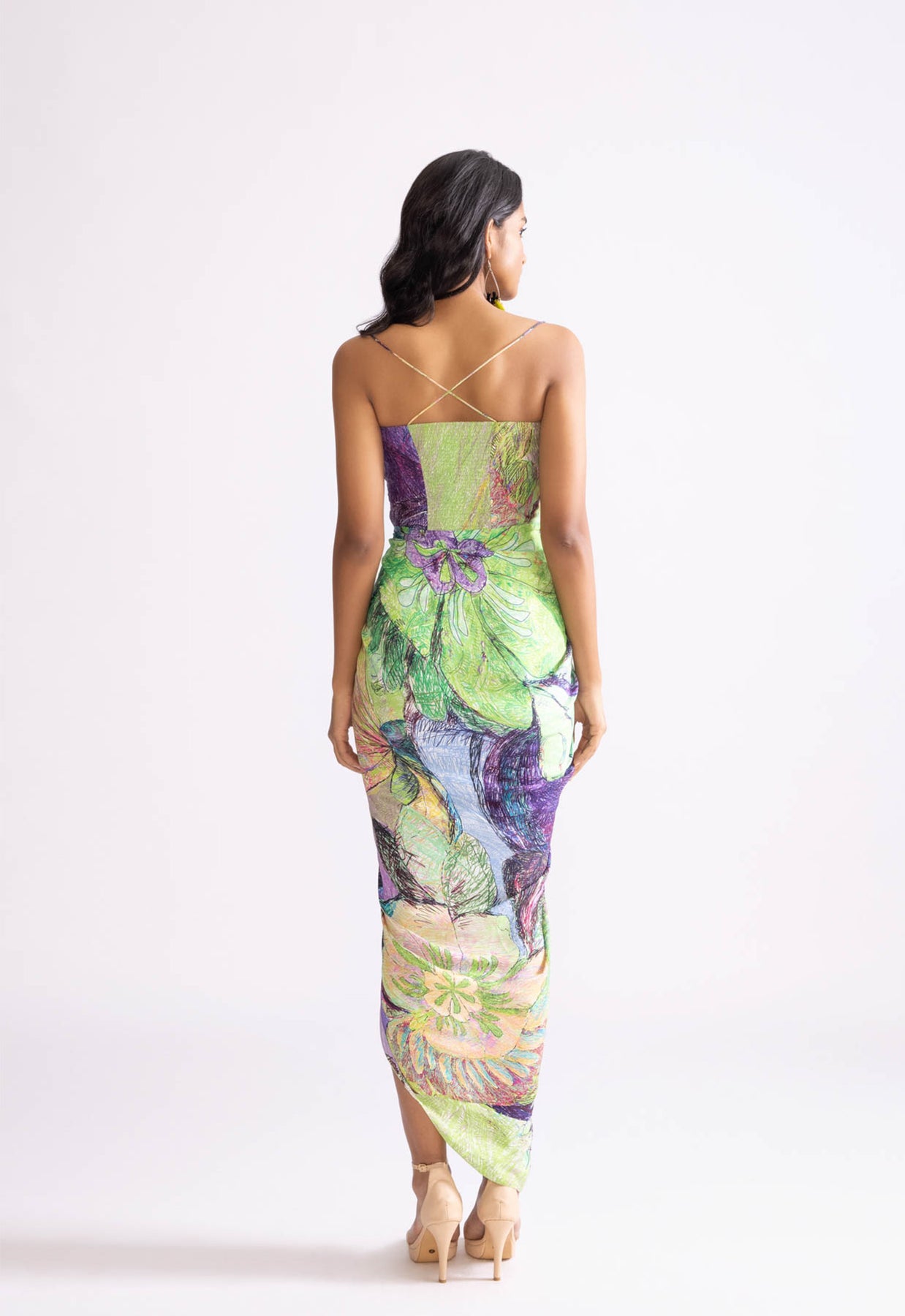 Daisy print hand draped dress with surplice bodice and noodle straps