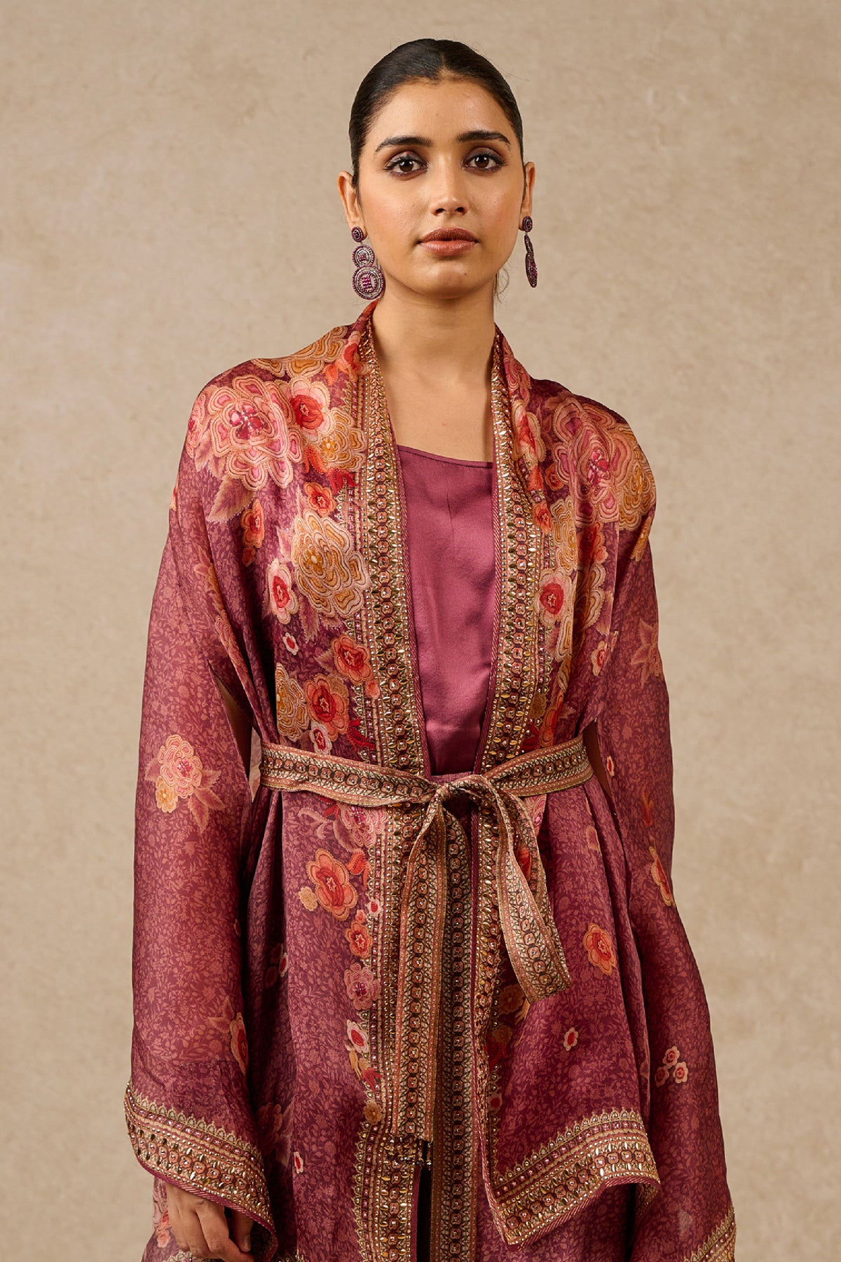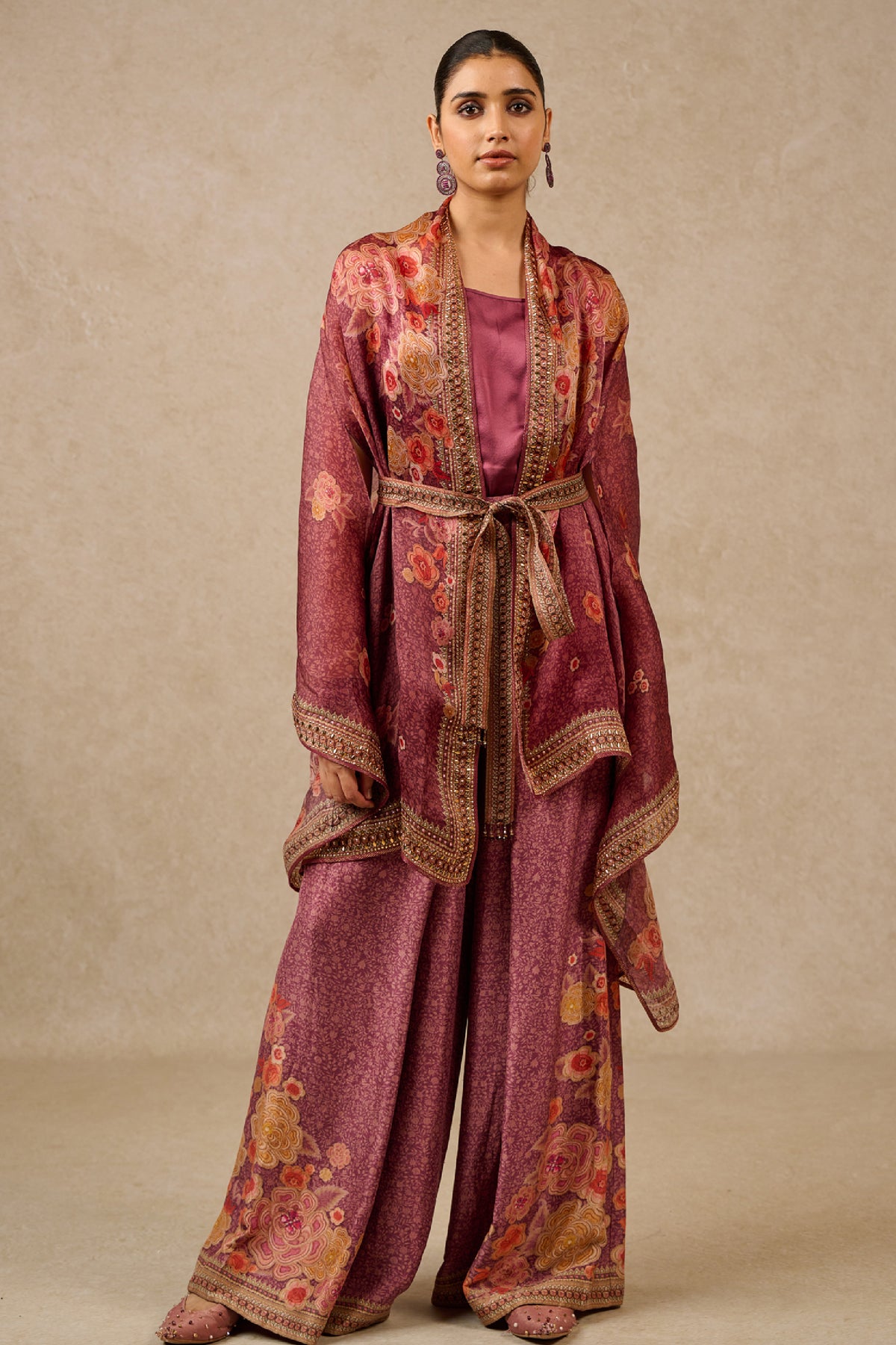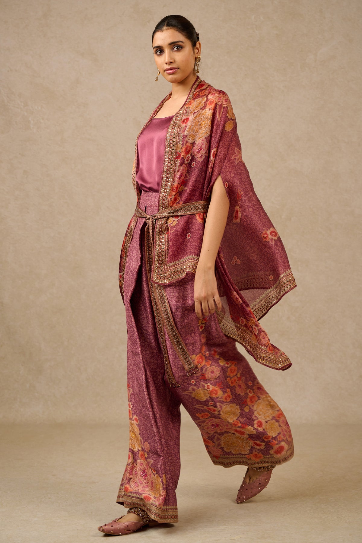 This is our satin organza printed cape highlighted with diamonds and comes with a belt. It is paired with a charmeuse slip inside, along with matching flared trousers in silk dupion.