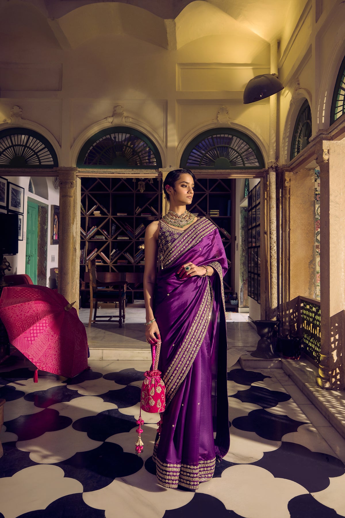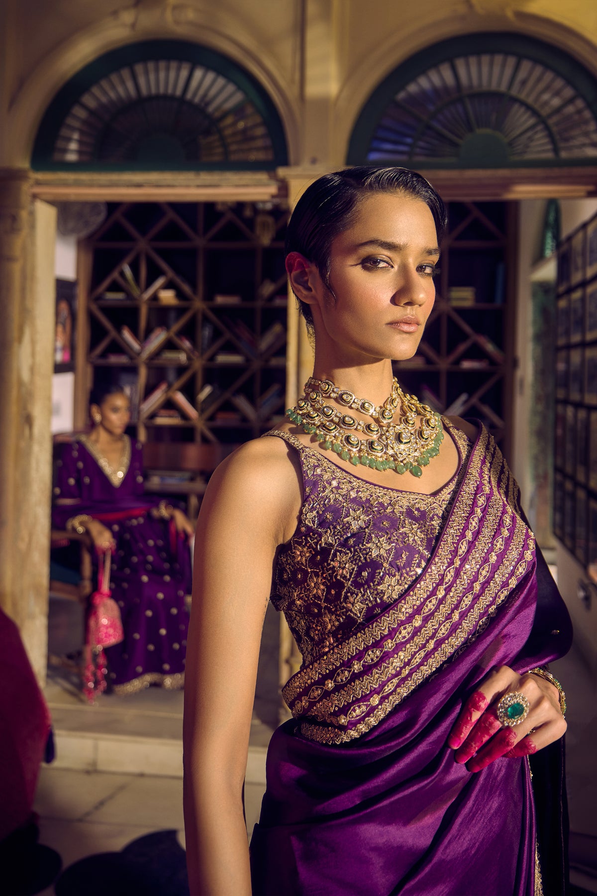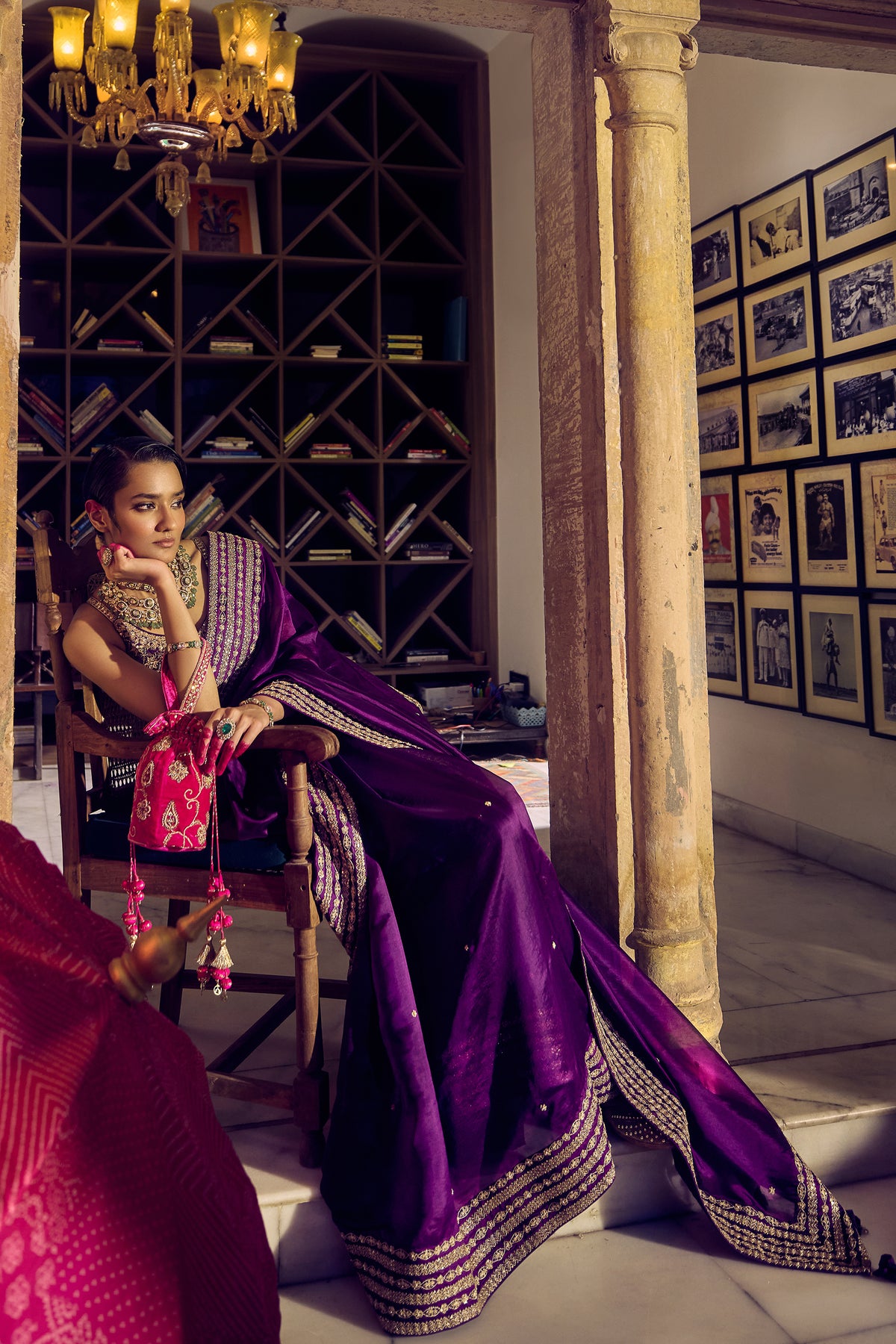 Classic bangani silk saree and blouse are enriched with gold gota and marodi accents, exuding unmatched regal opulence. The entire set is a blend of grandeur with comfort by using lightweight materials and exquisite embellishments.