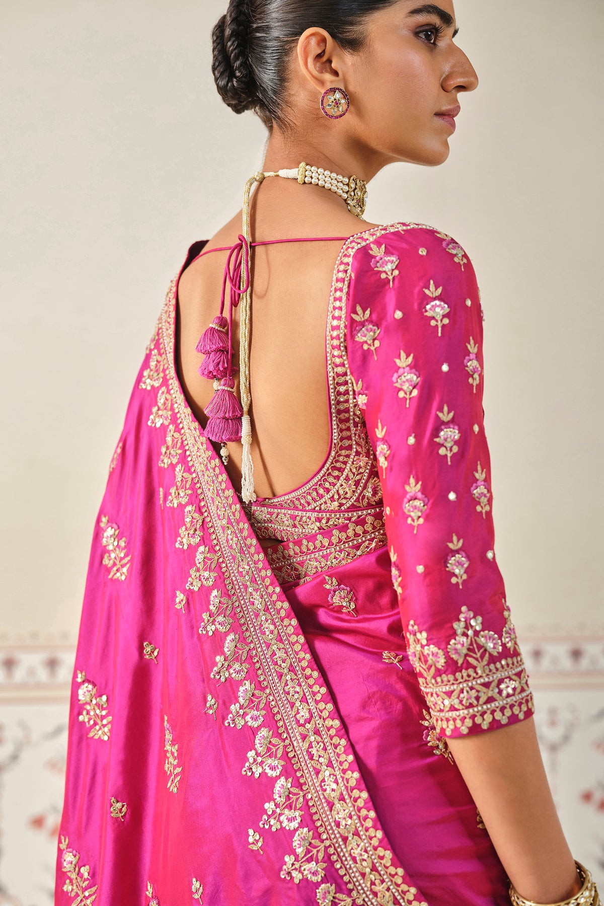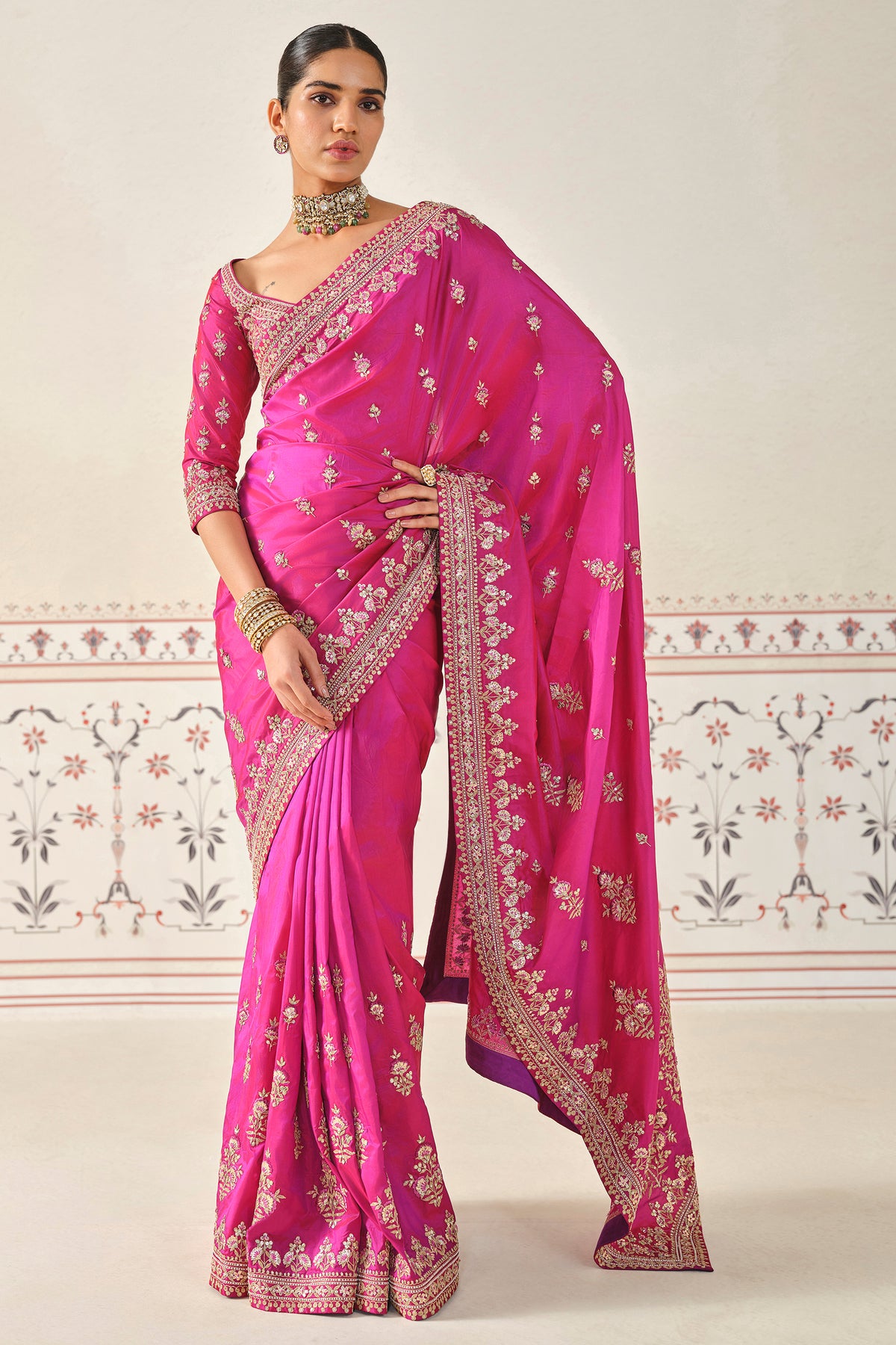 Debasmita is a silk saree crafted in an elegant pink colour. This striking saree features nature-inspired motifs and is elevated in gota patti, zari, threadwork and sequin details.