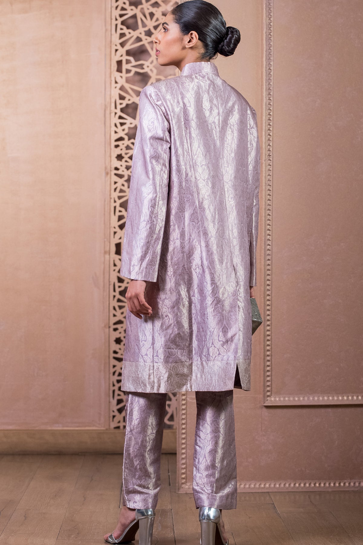 Our handwoven brocade bandhgala jacket is paired with matching brocade trousers.