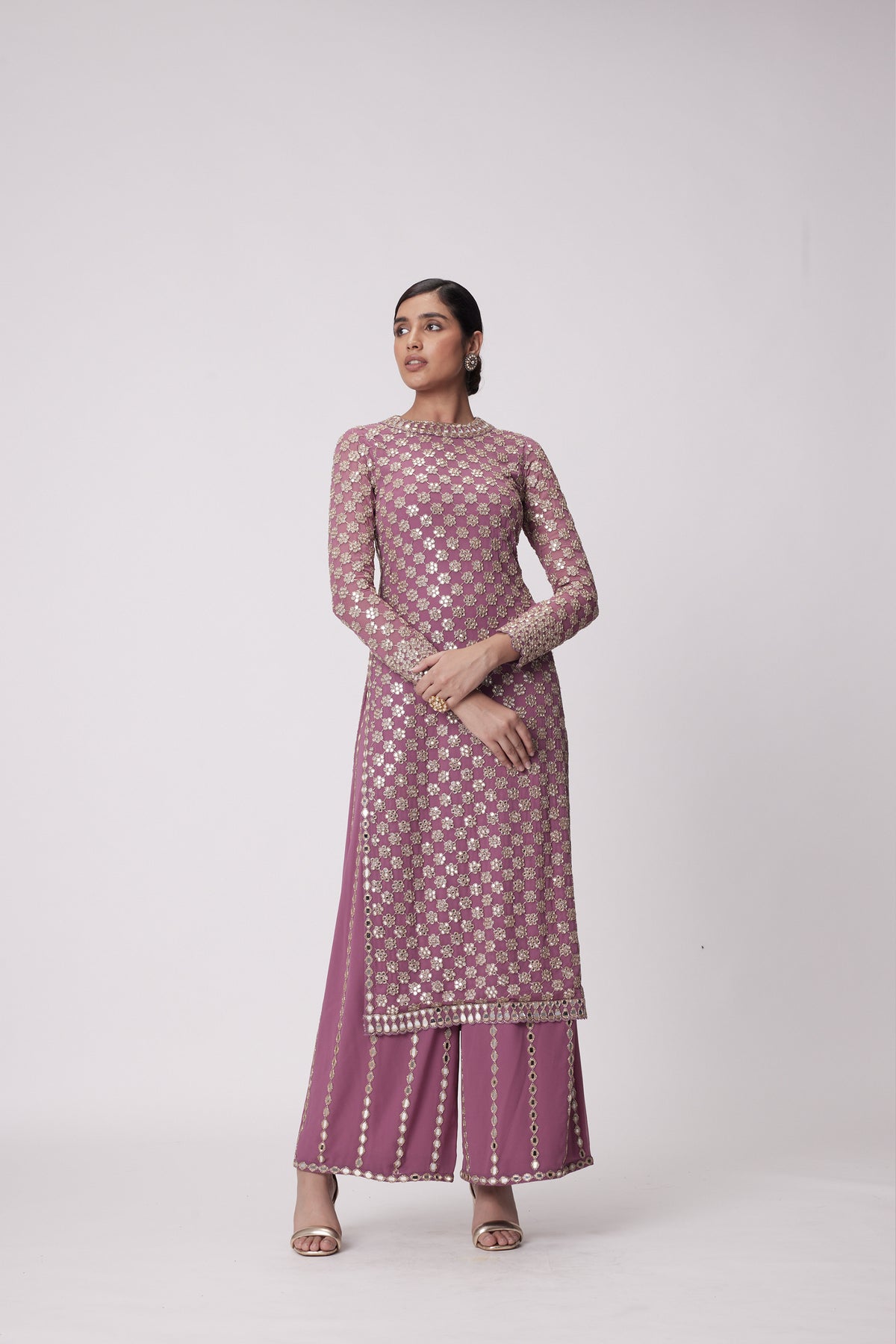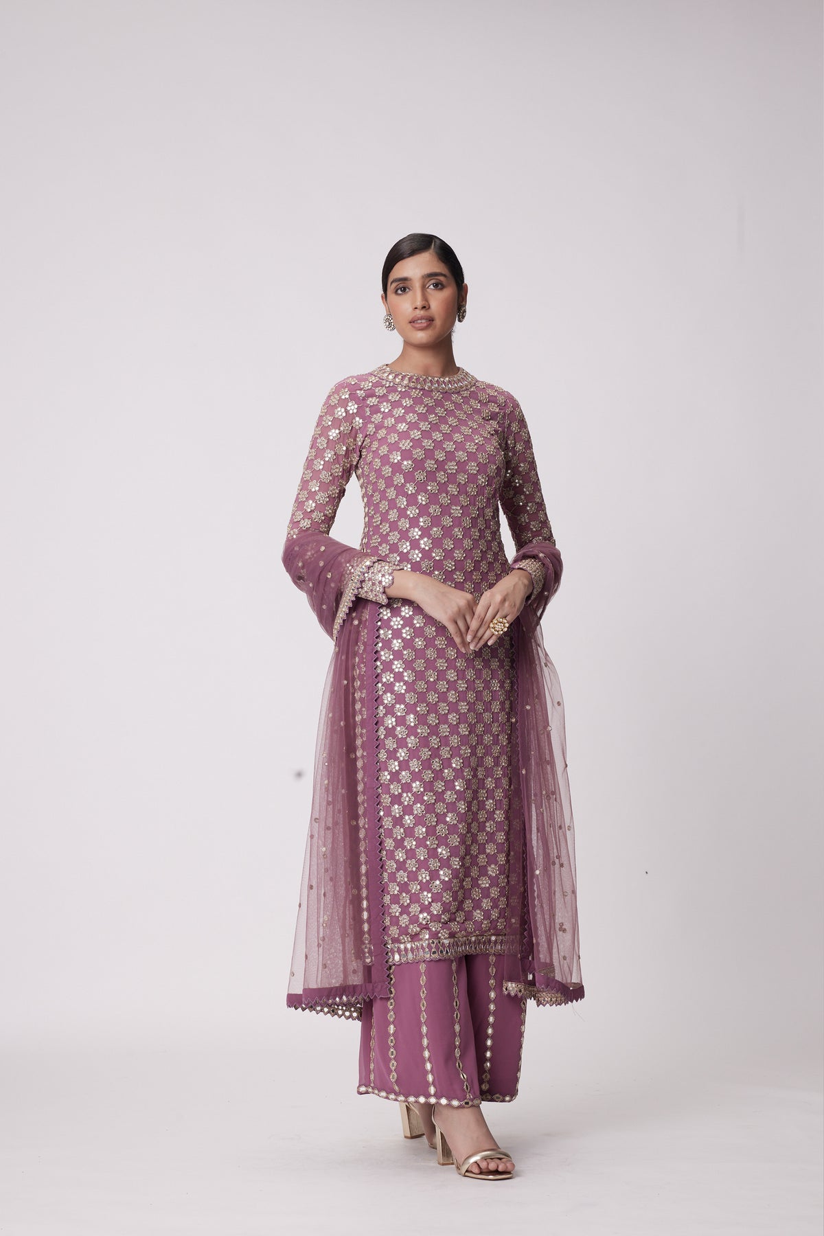 Mud mauve hand embroidered kurta, pants and dupatta.