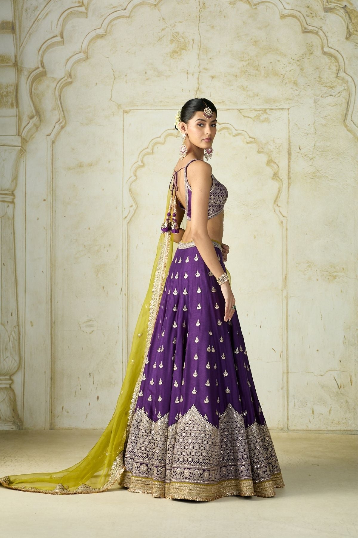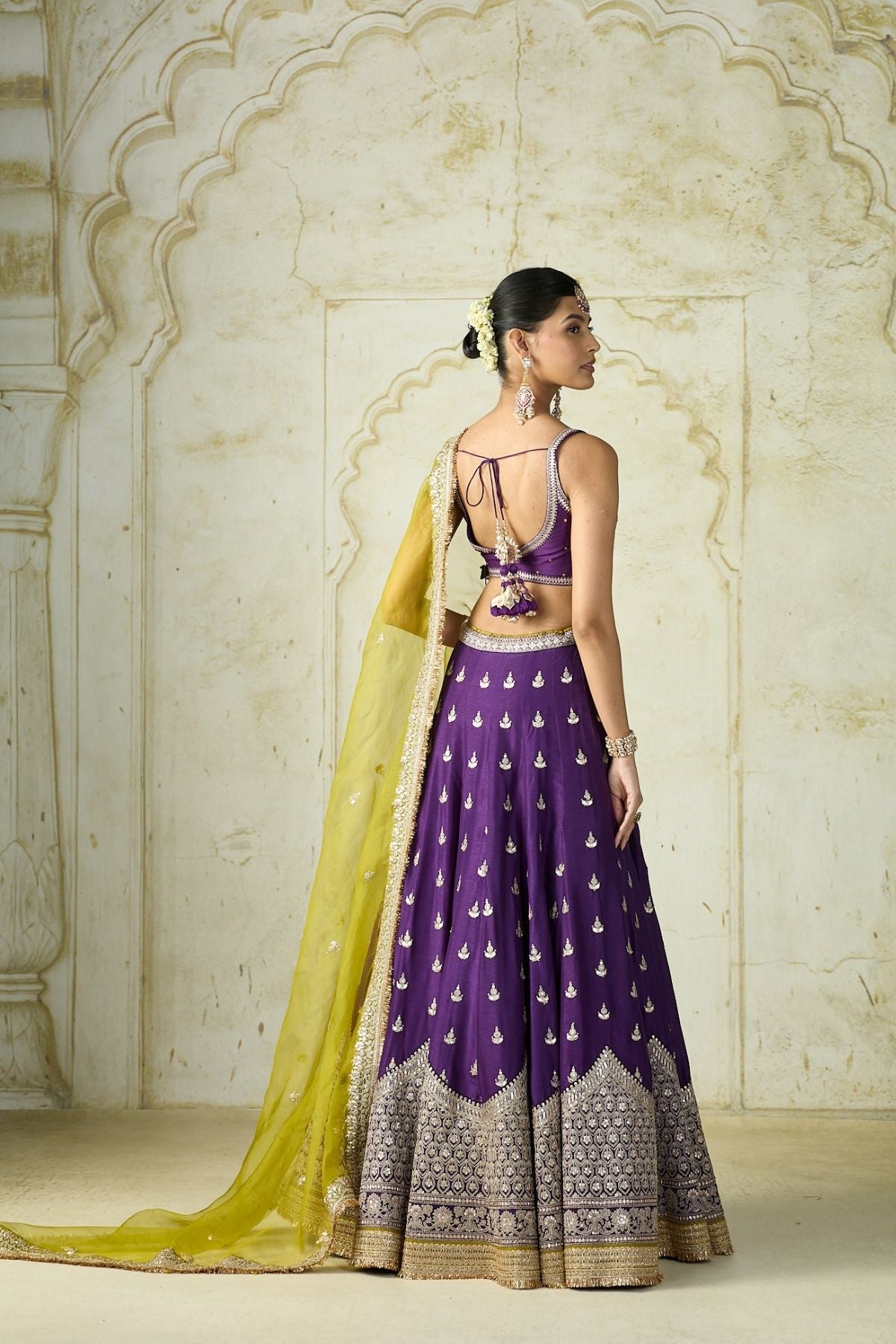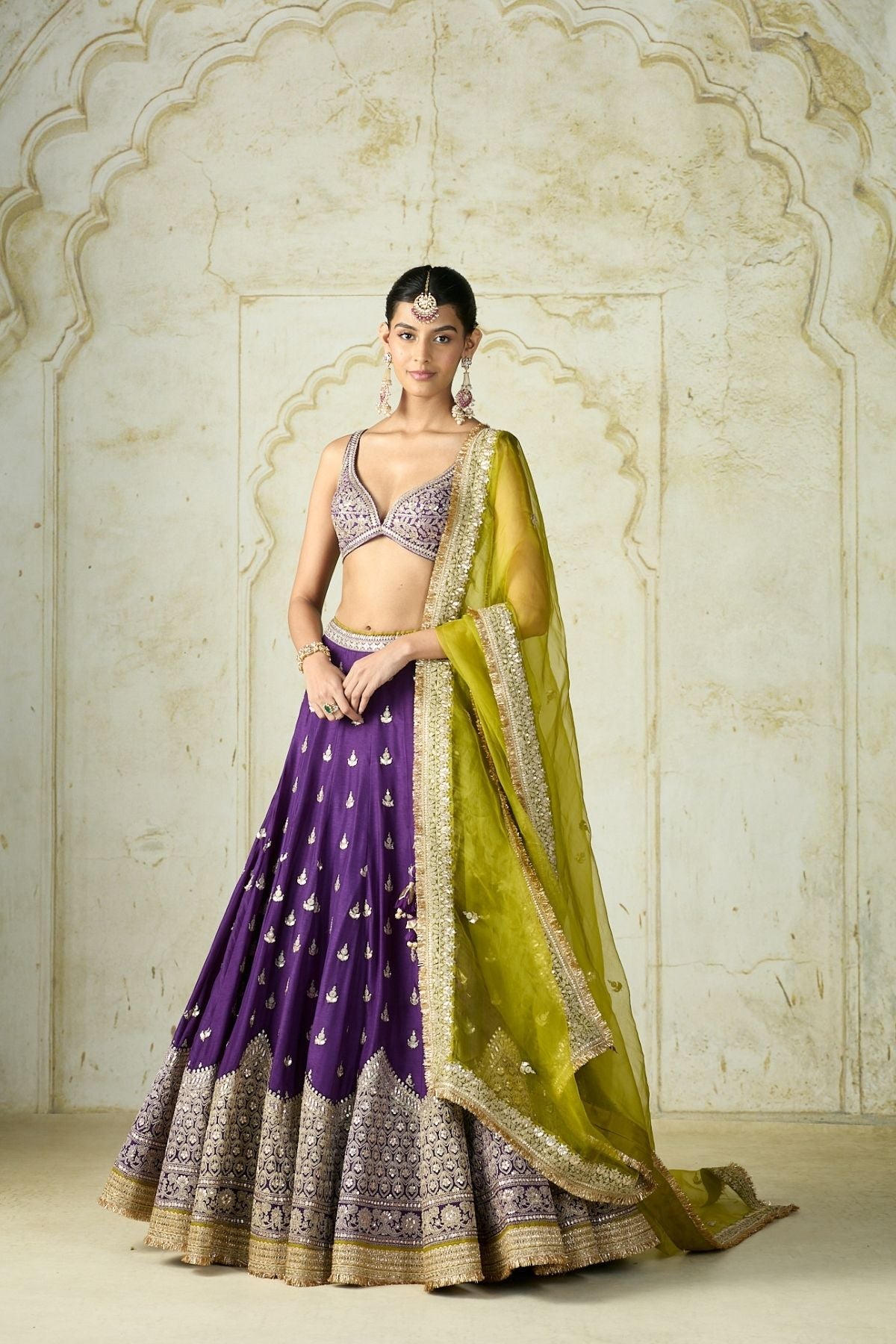 This elegant lehenga set radiates regal charm, featuring a beautifully embroidered blouse with intricate detailing paired with a deep neckline for a modern touch. The voluminous lehenga is adorned with delicate motifs scattered across and a richly embellished border that enhances its grandeur. A contrasting sheer dupatta with ornate embroidery and a finely detailed border completes the look.