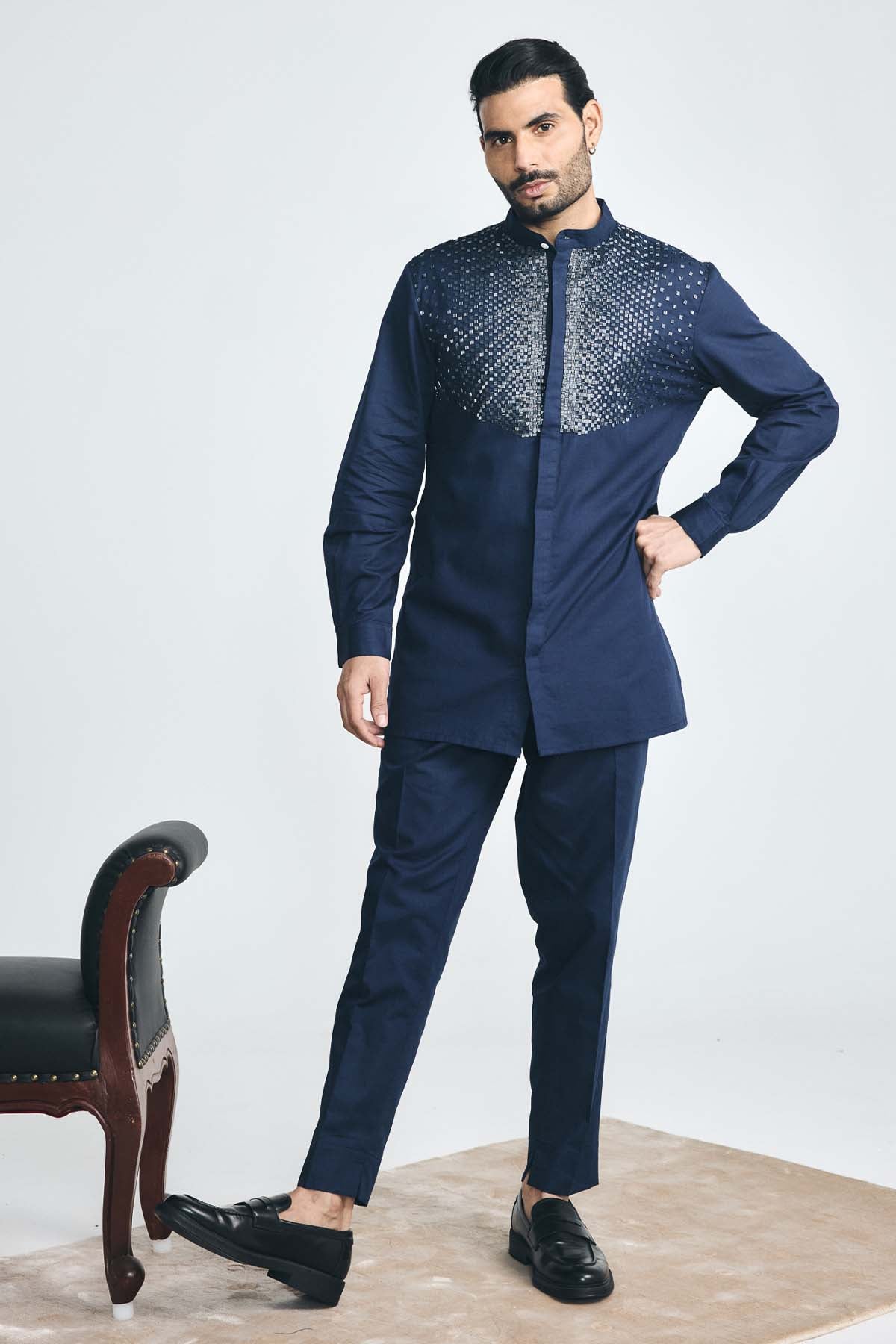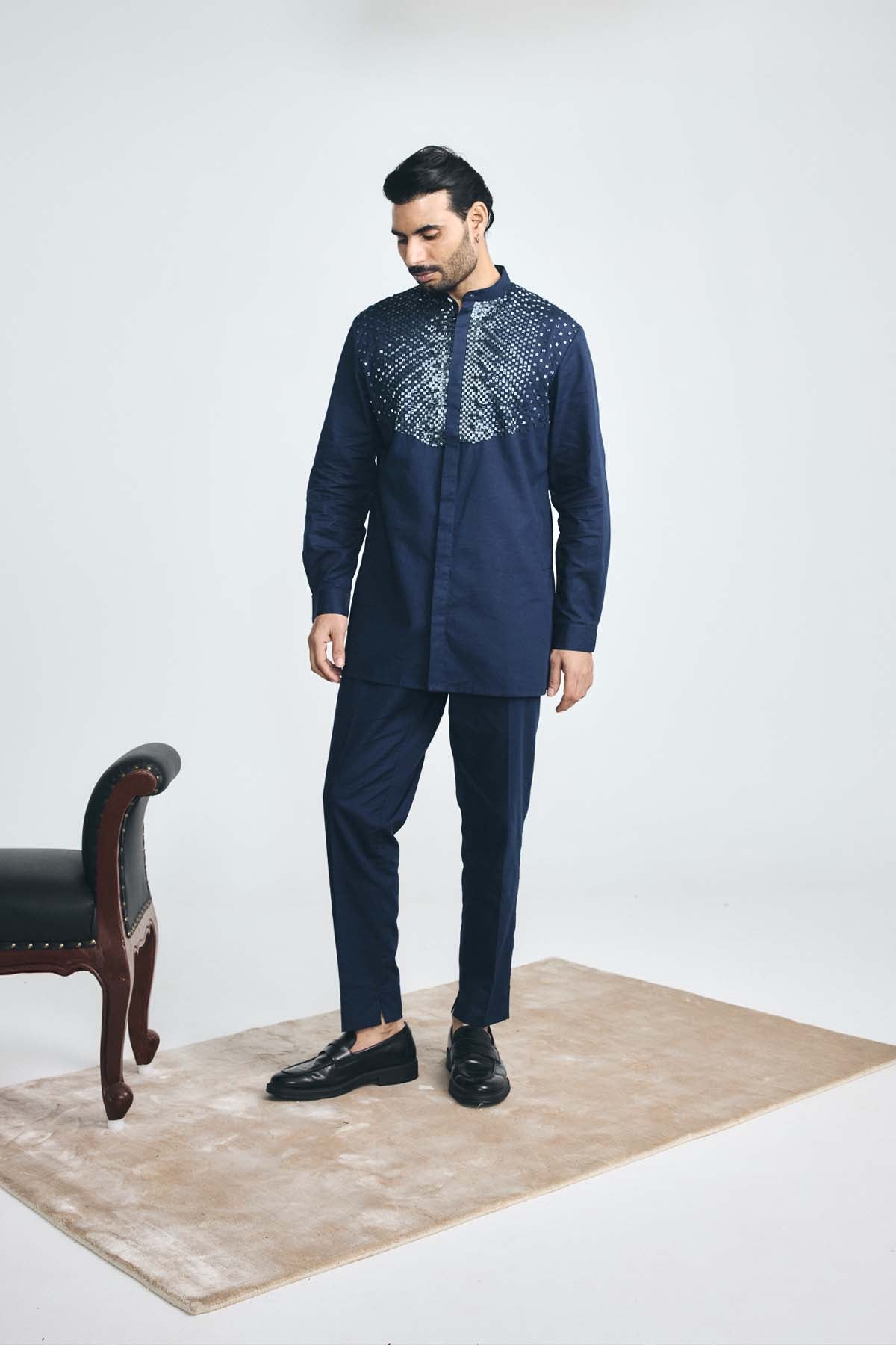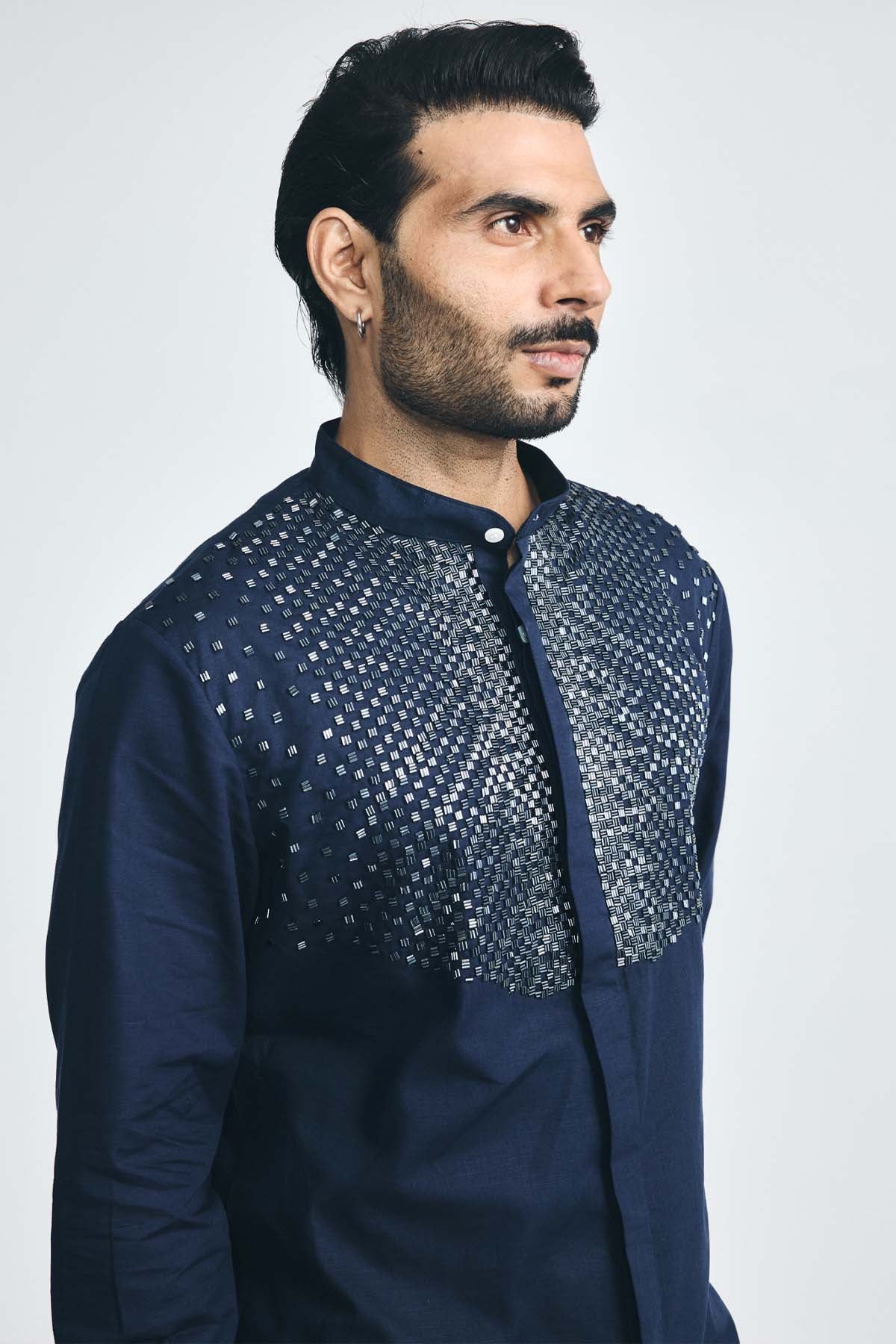 This navy blue cotton-linen shirt-style short kurta features a mandarin collar, cuffed sleeves, and two hip pockets. This kurta has a concealed packet and is enhanced with hand-embroidered cutdana on the shoulder, across front.