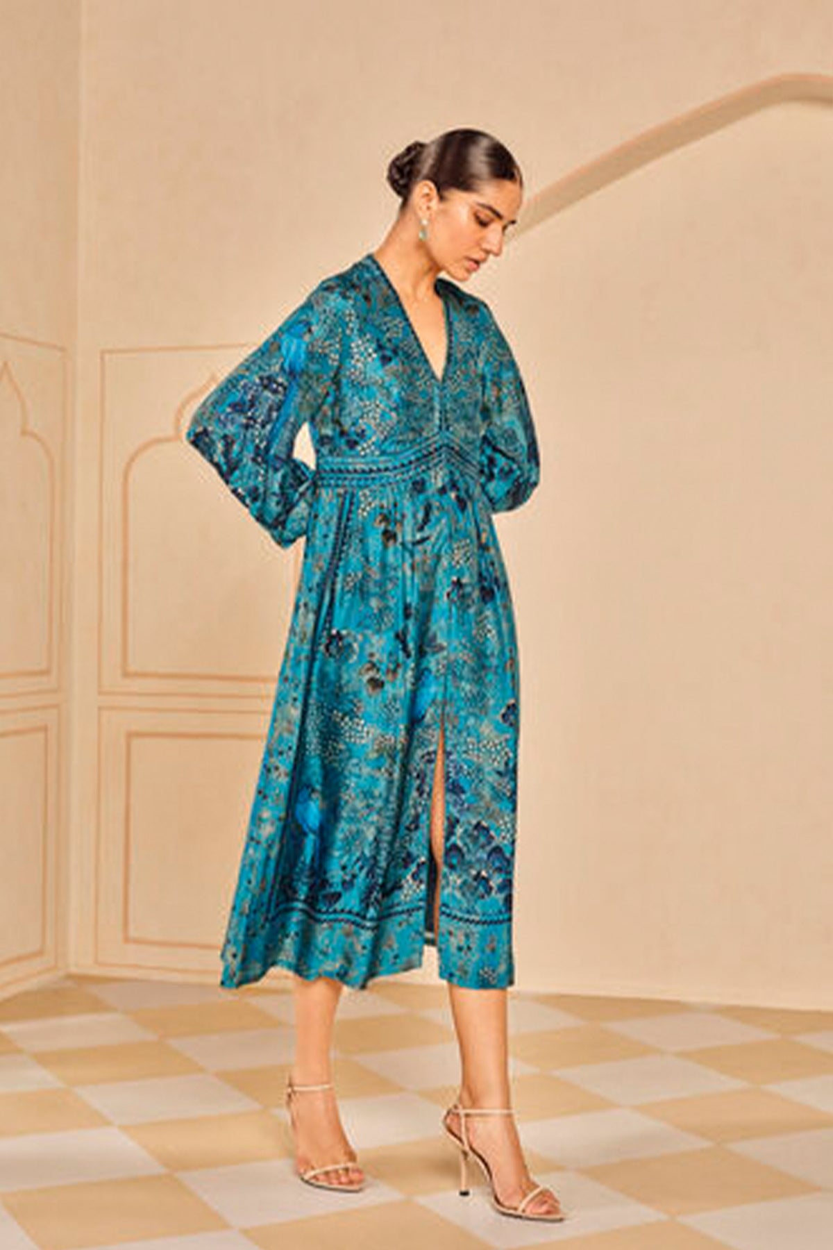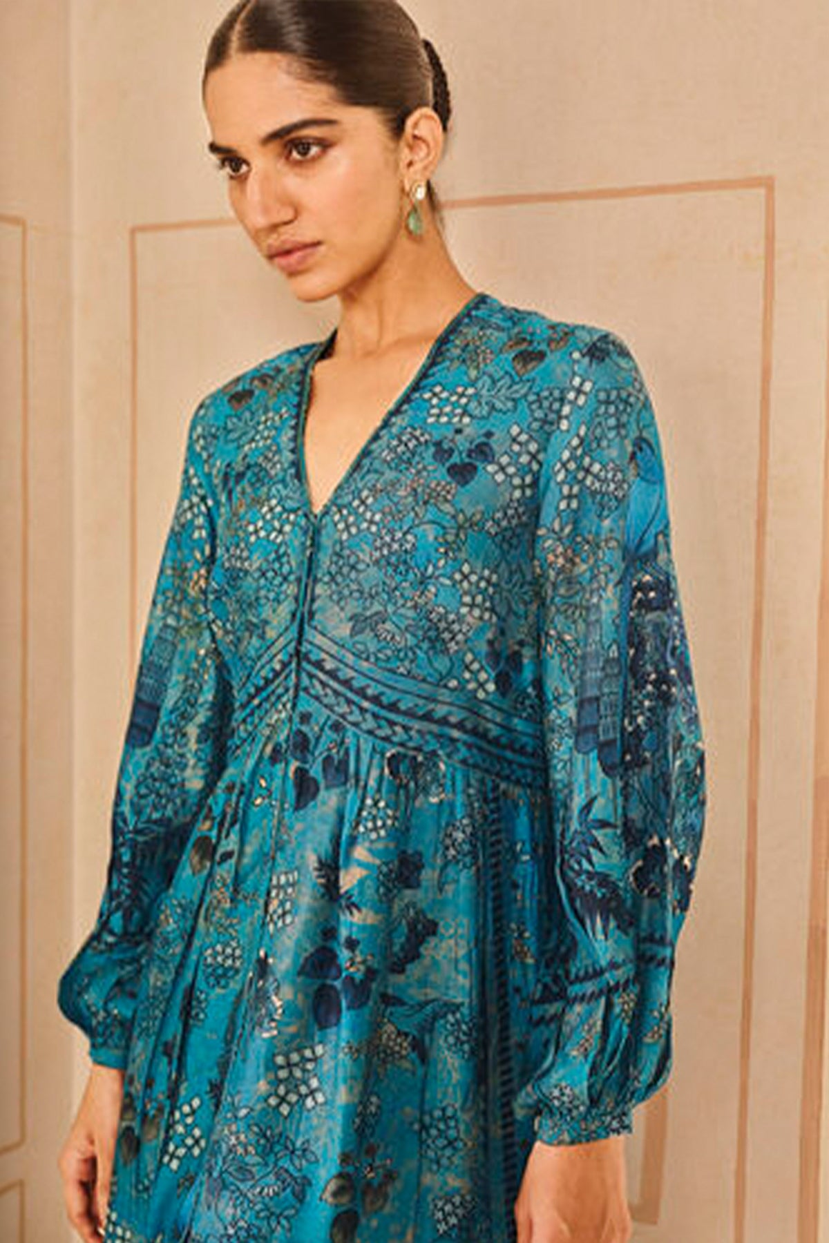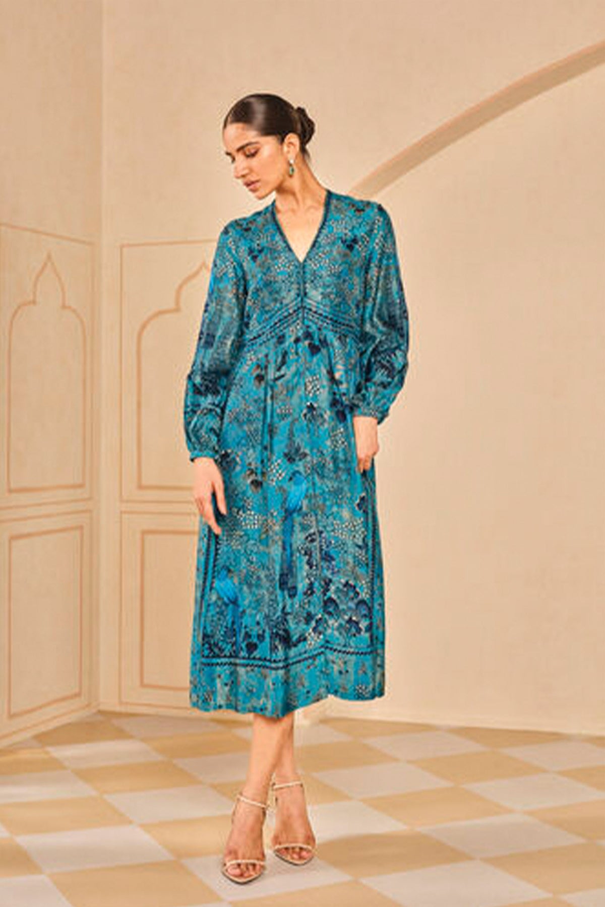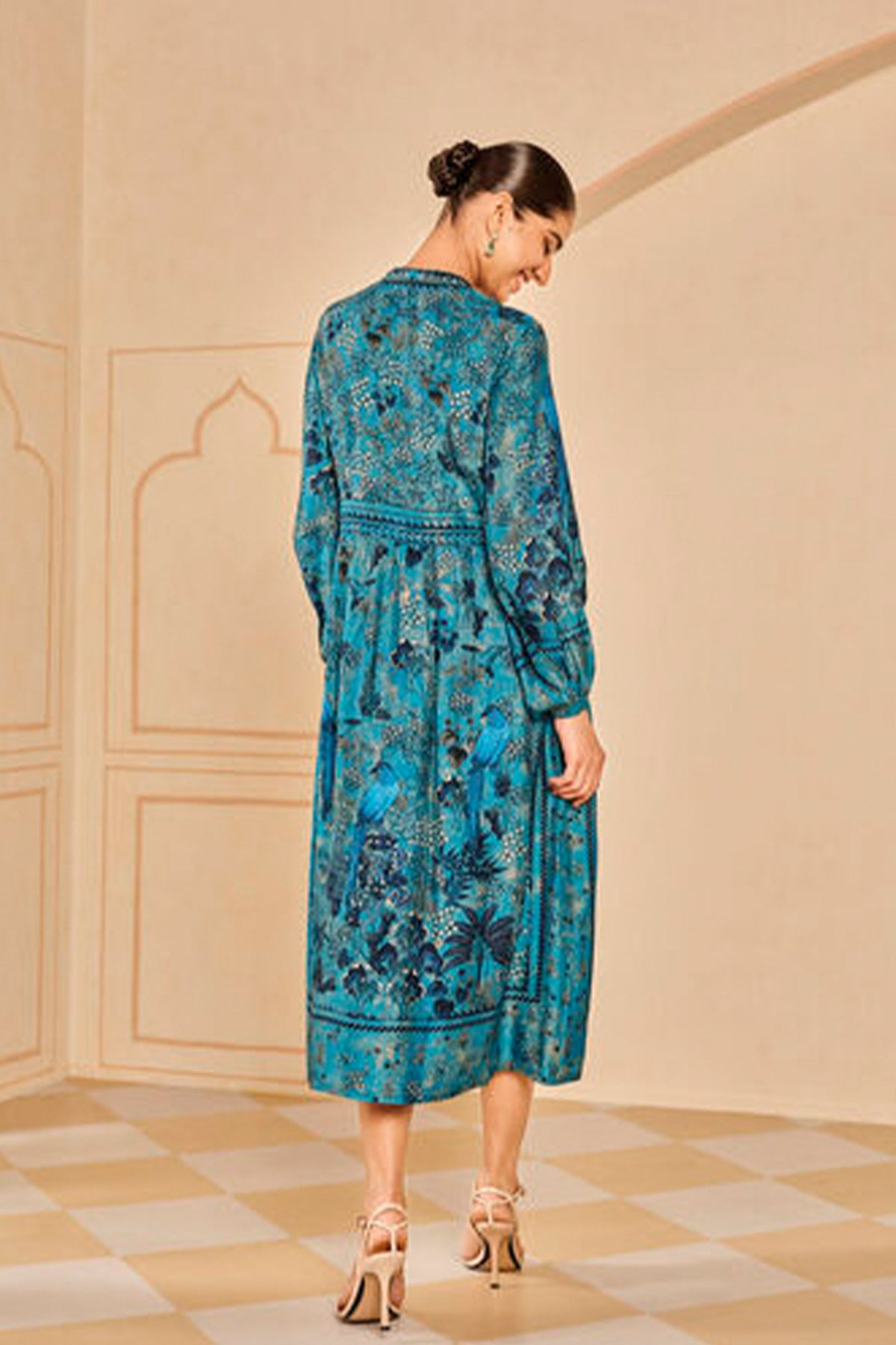 Crafted in a beaming blue hue, this dress features the lush fauna and flora of the forest in bird and flower motifs. Designed in silk and perfect for modern celebrations.
