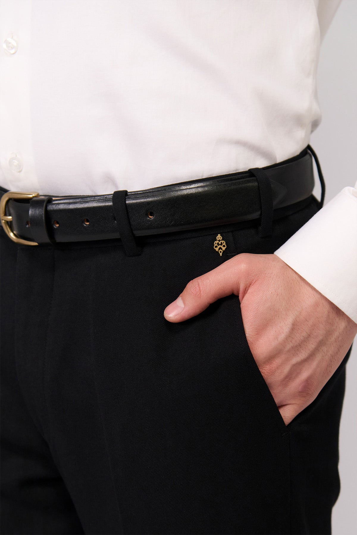 Step into style with these classic black trousers reimagined with tape detailing and Adamas accents on the pocket?an ideal choice for an elegant ceremonial evening.