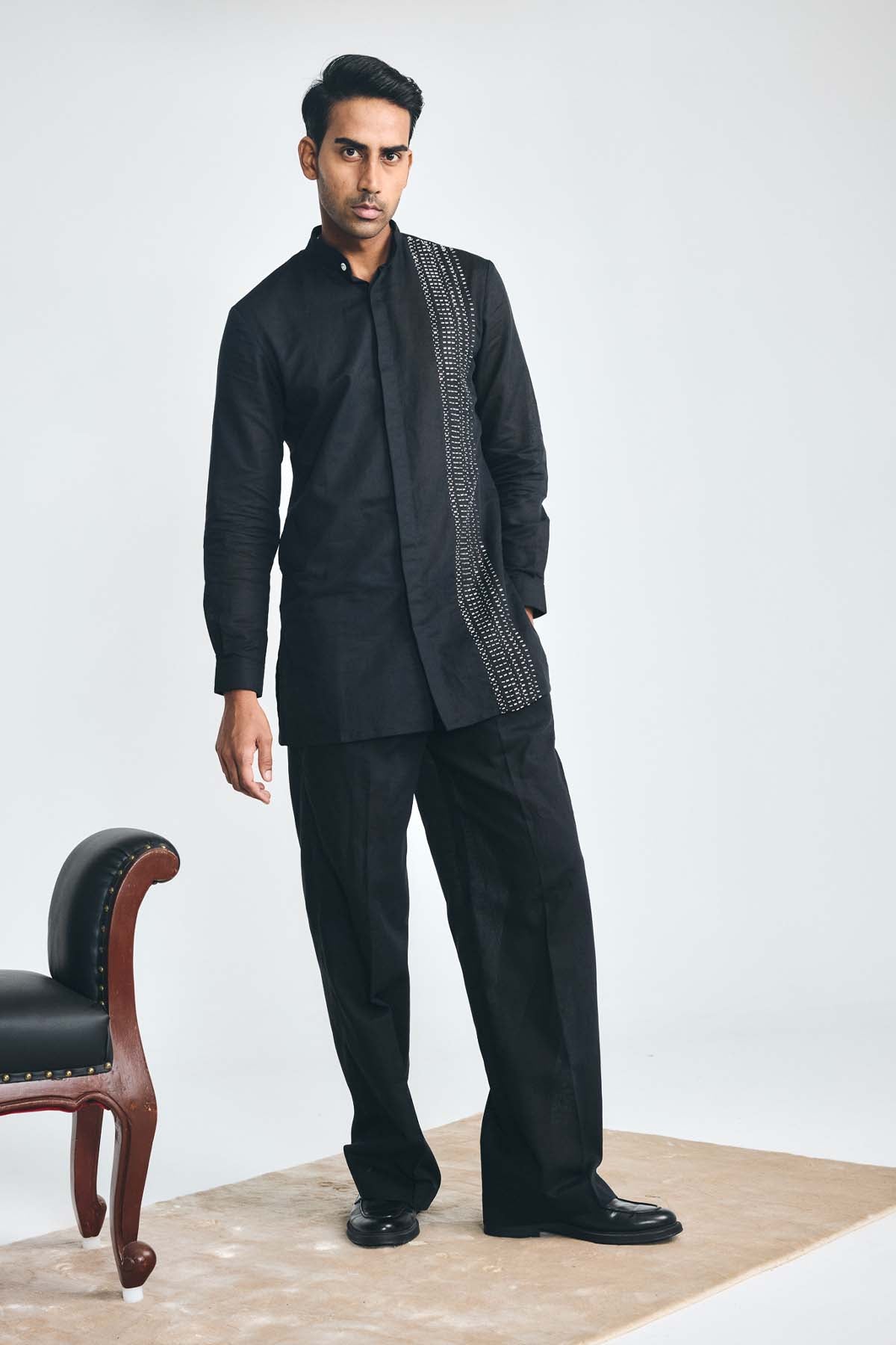 This black cotton-linen shirt-style short kurta features a mandarin collar, cuffed sleeves, and two hip pockets. This kurta has a concealed packet and is enhanced with hand-embroidered cutdana on the left panel.