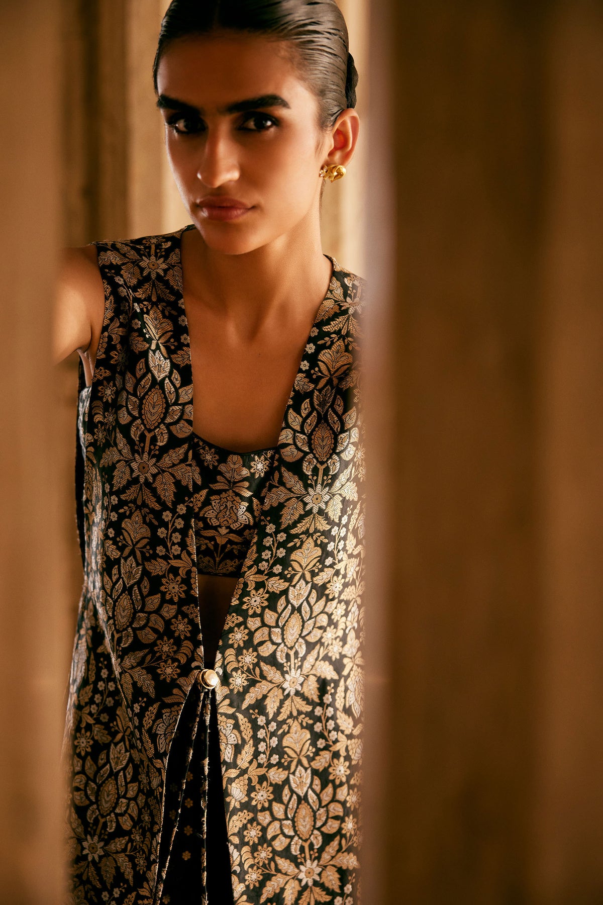 Classic black & gold is reimagined in our contemporary tabard set. Handwoven by the master artisans of benaras, the benarasi brocade is a centuries-old craftform and the epitome of heirloom crafts, learned over years of practice. An exquisite craftsmanship, the benarasi weave is created when additional wefts made of metallic fibres are woven into the yarn on the loom that bring to life intricate nature-inspired motifs. Crafted in silk, this ensemble is crafted for modern celebrations.