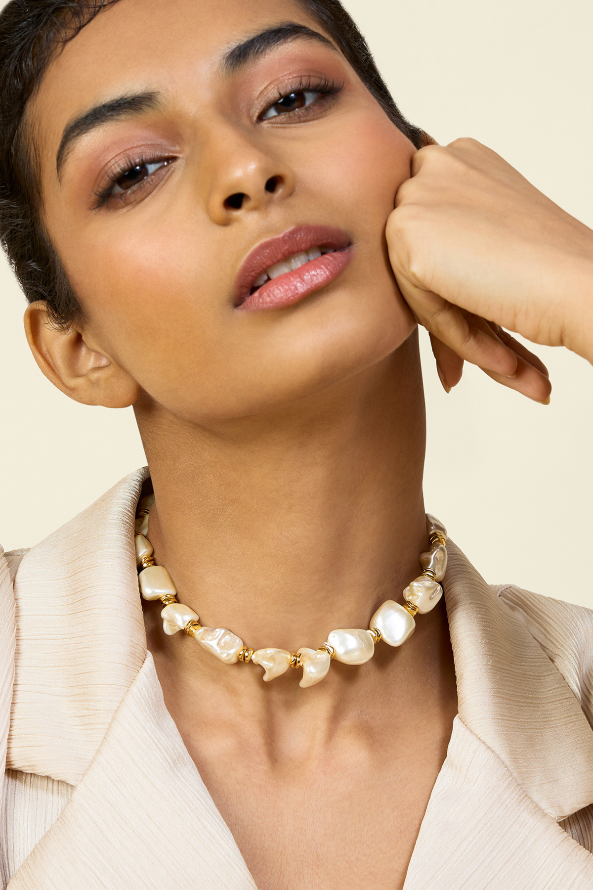 Enhance your festive elegance with the Pearl Riviere Collar Necklace. Crafted with gold plating and e-coating, this stylish necklace features a classic collar design adorned with stunning white pearls. Made from high-quality brass, this necklace is a timeless and sophisticated addition to your collection.