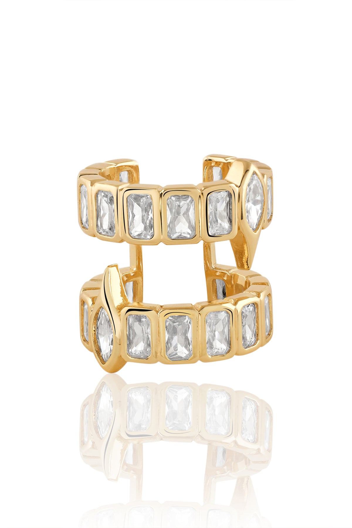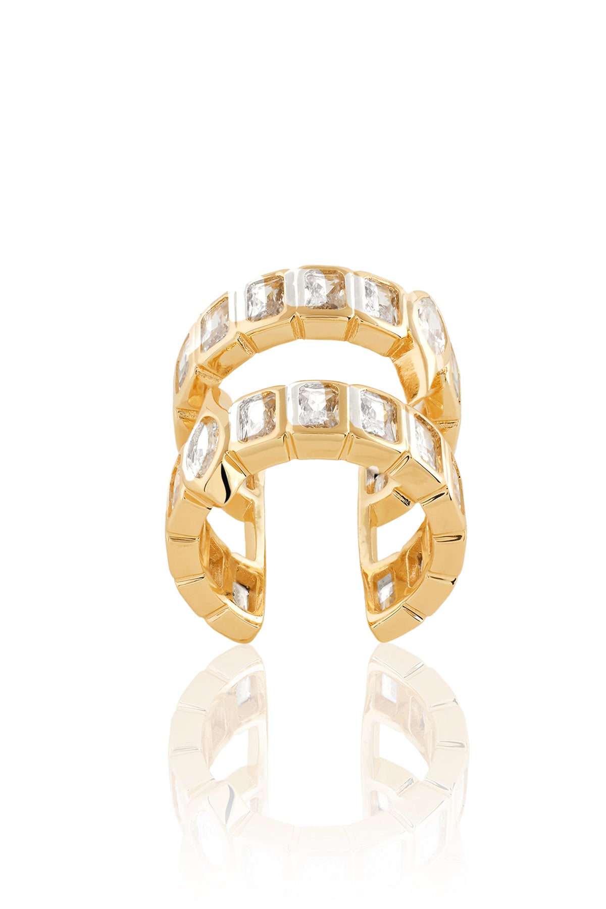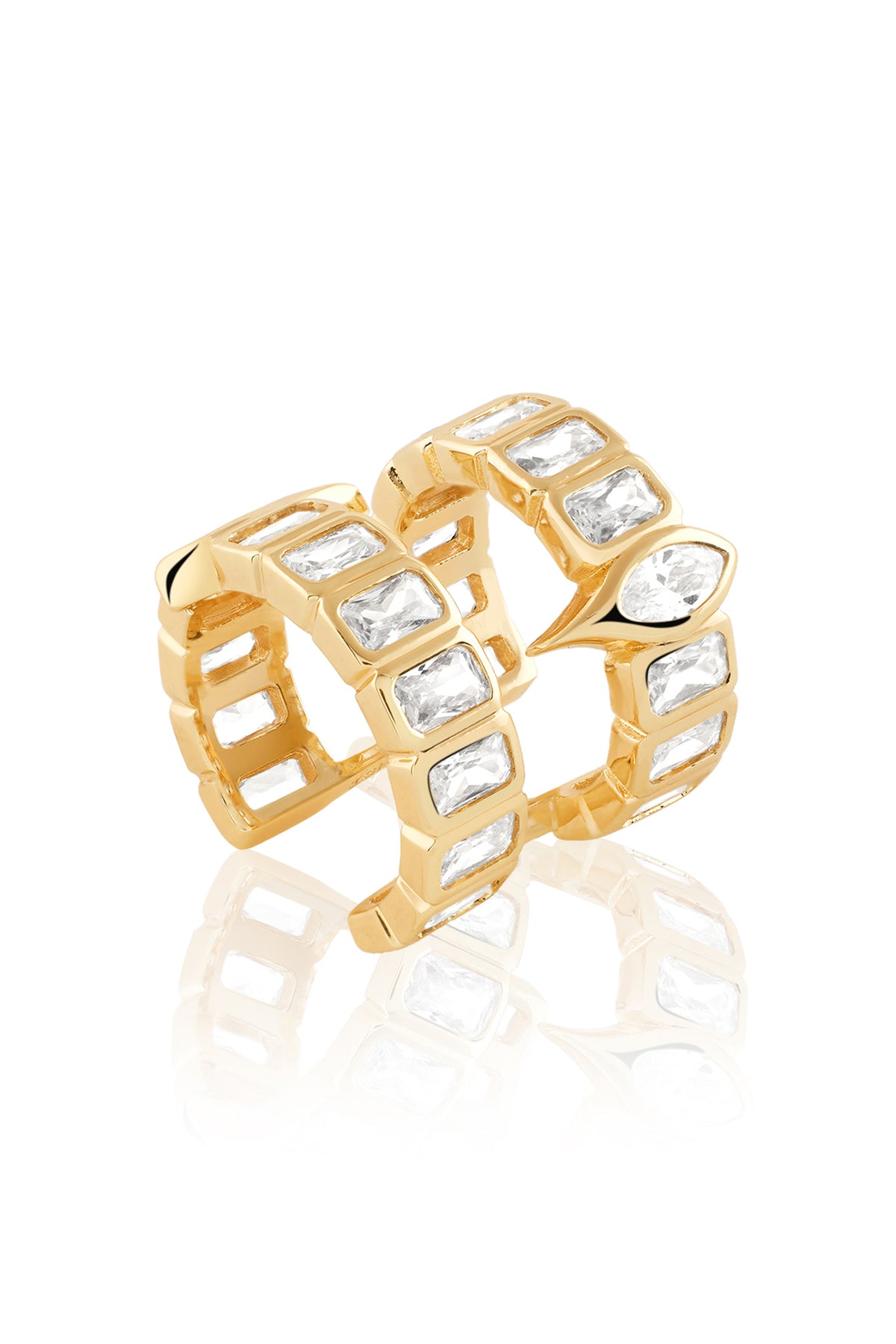 This tennis and punk era-inspired ring is equal parts edgy and elegant. Crafted from brass, and plated with 18k gold, this ring is studded with crystal zirconia stones for maximum chic. Perfect for stacking, style it with everything from skater dresses to tailored jumpsuits.