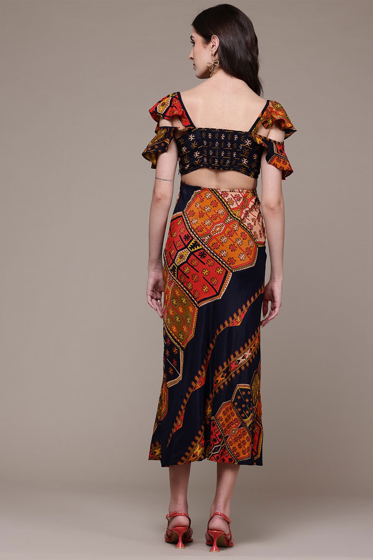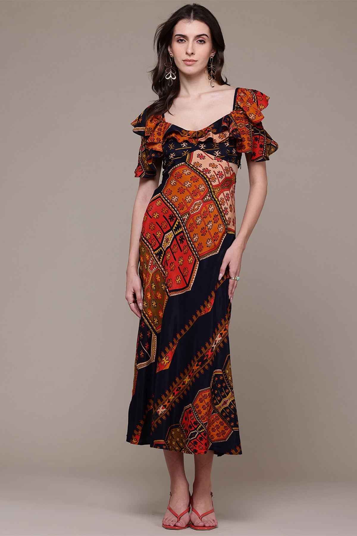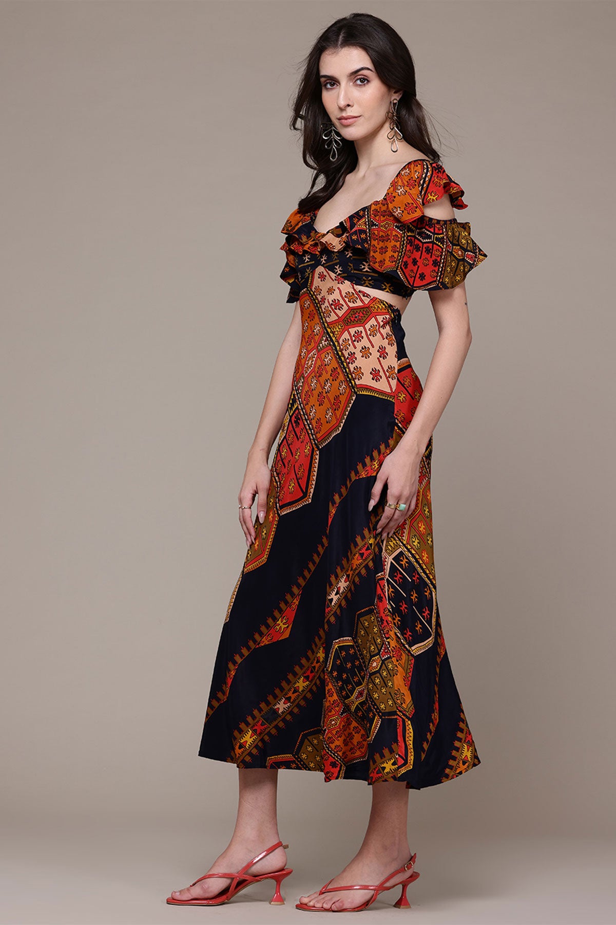 Label Ritu Kumar V Neck Frill Sleeves Printed Long Dress indian designer wear online shopping melange singapore