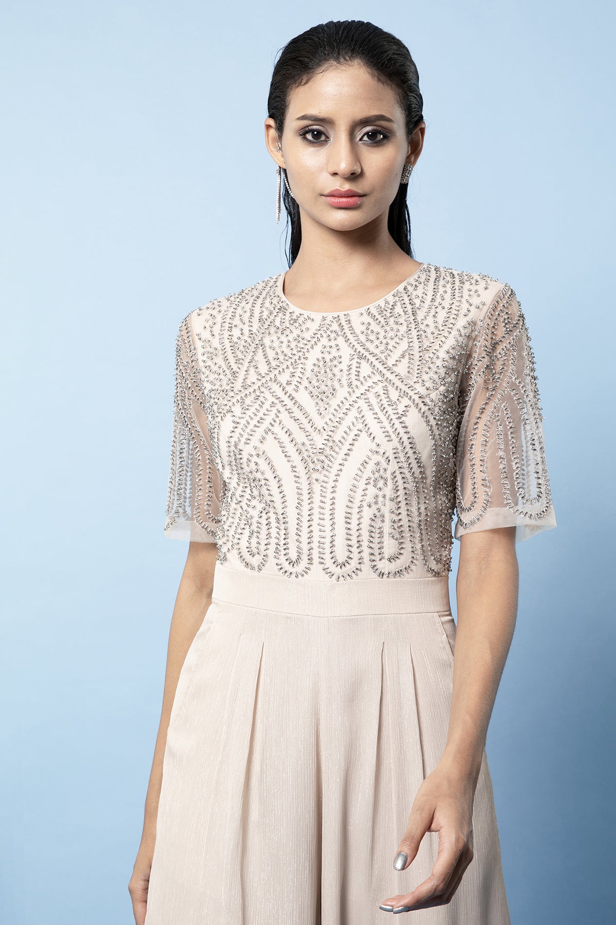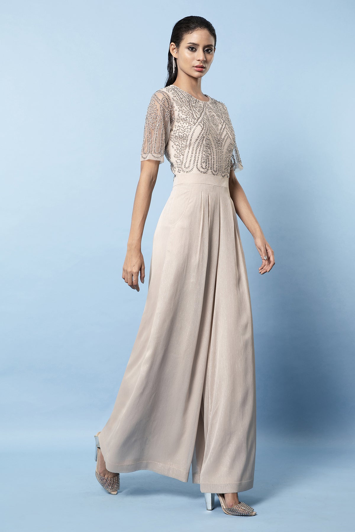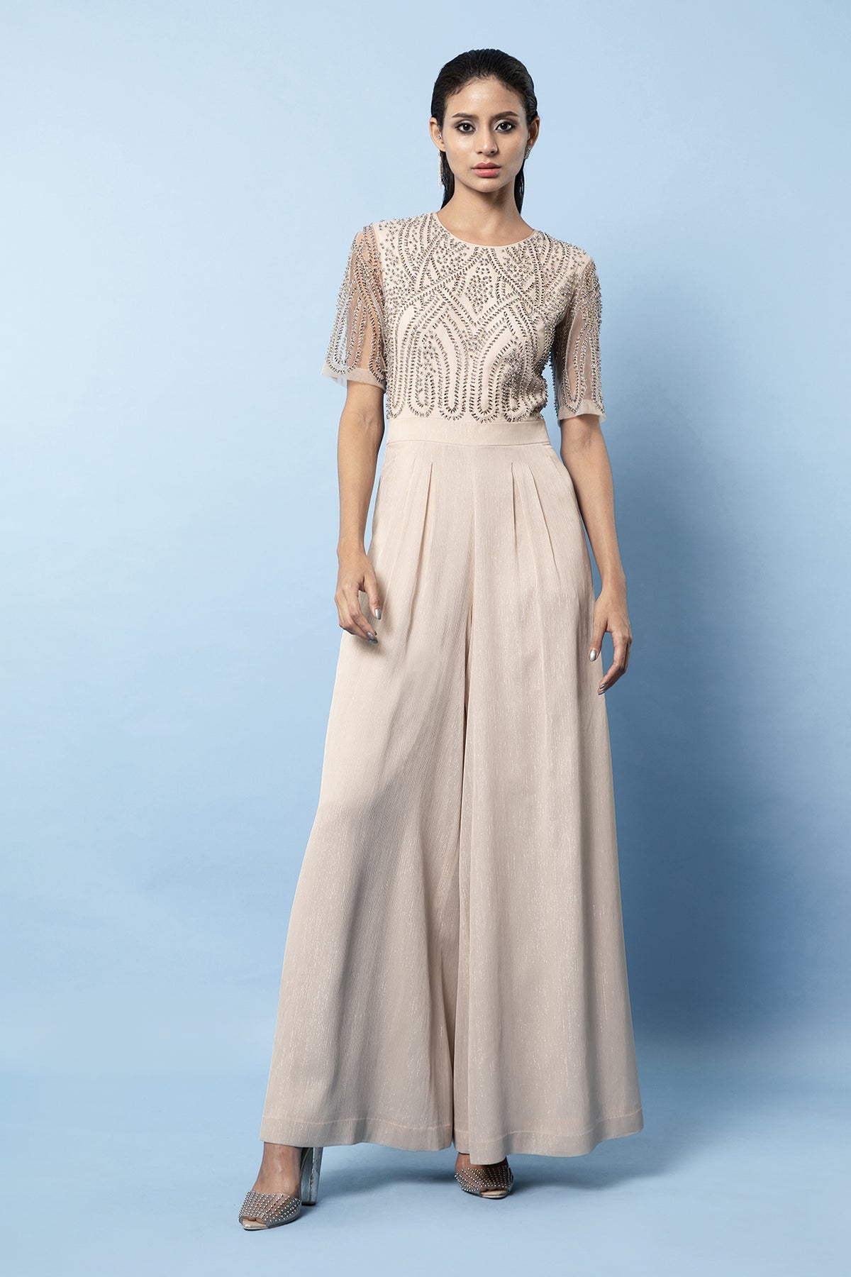 Our shimmer clay jumpsuit with a flared bottom features embellishments in a geometric floral artwork