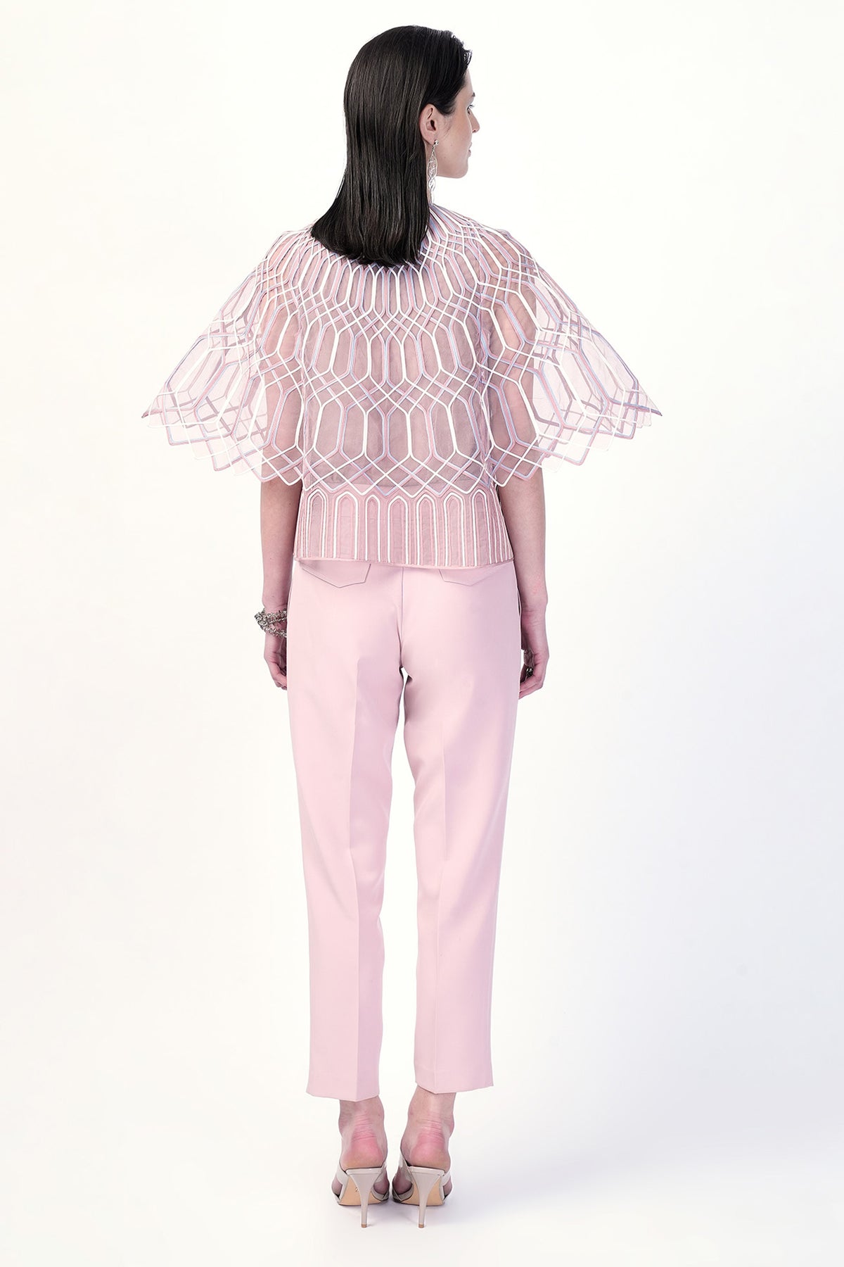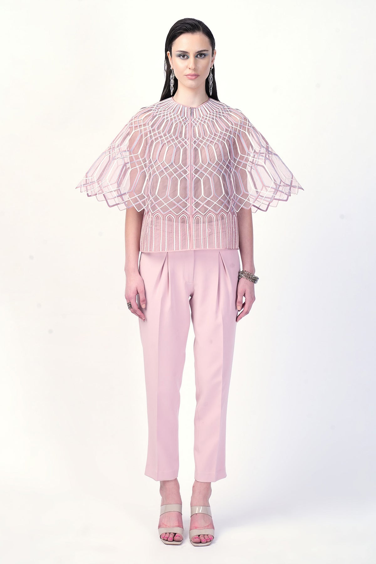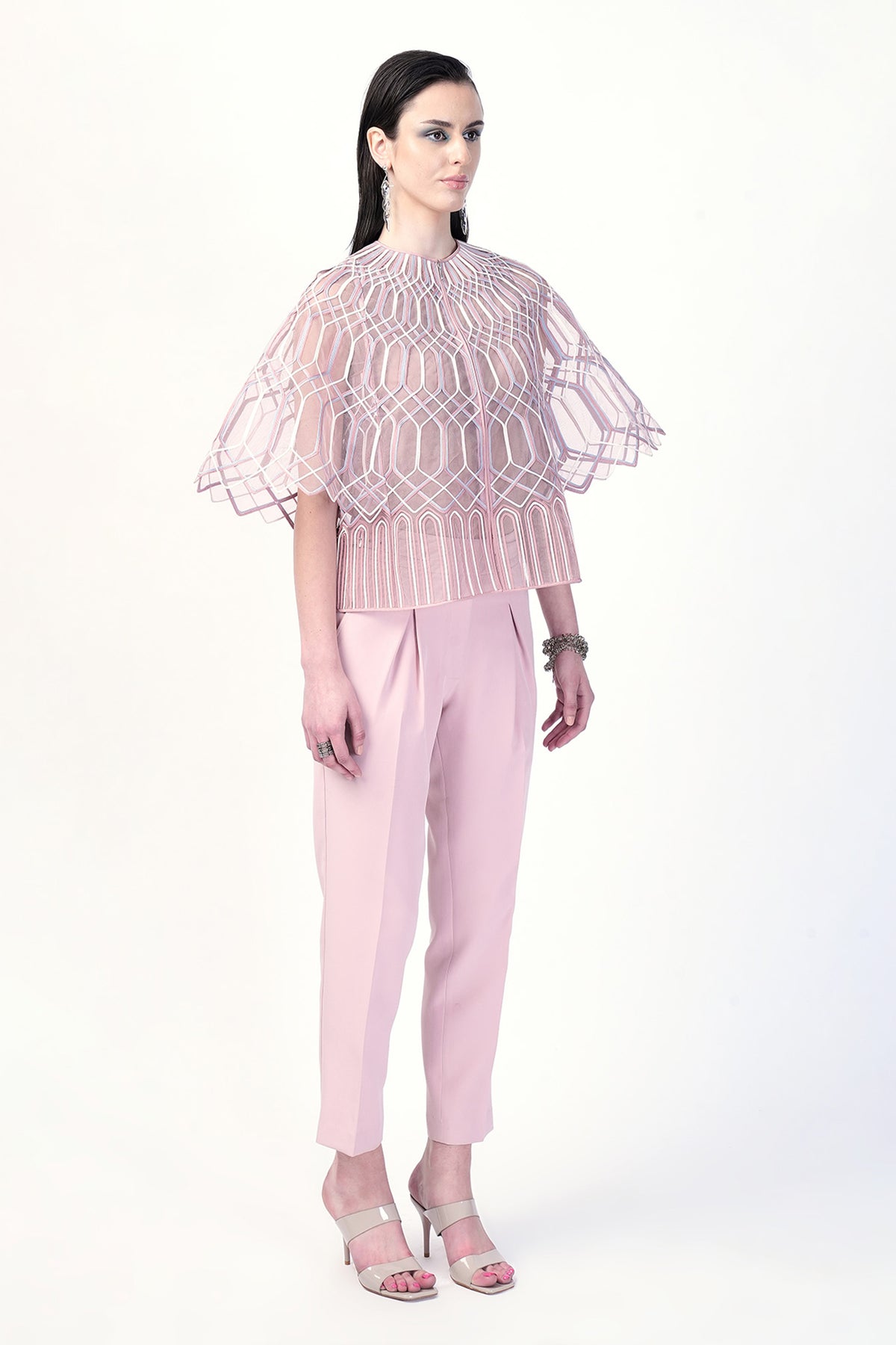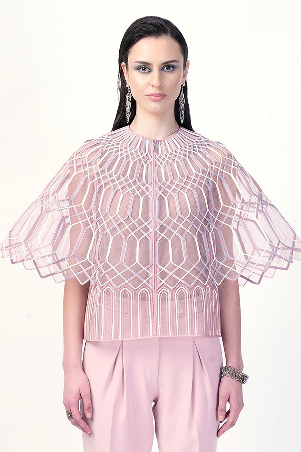 The castula trapez top, highlighted in a converging geometric maze blending into a linear pattern, ensures it's the perfect choice for your holiday ensemble.