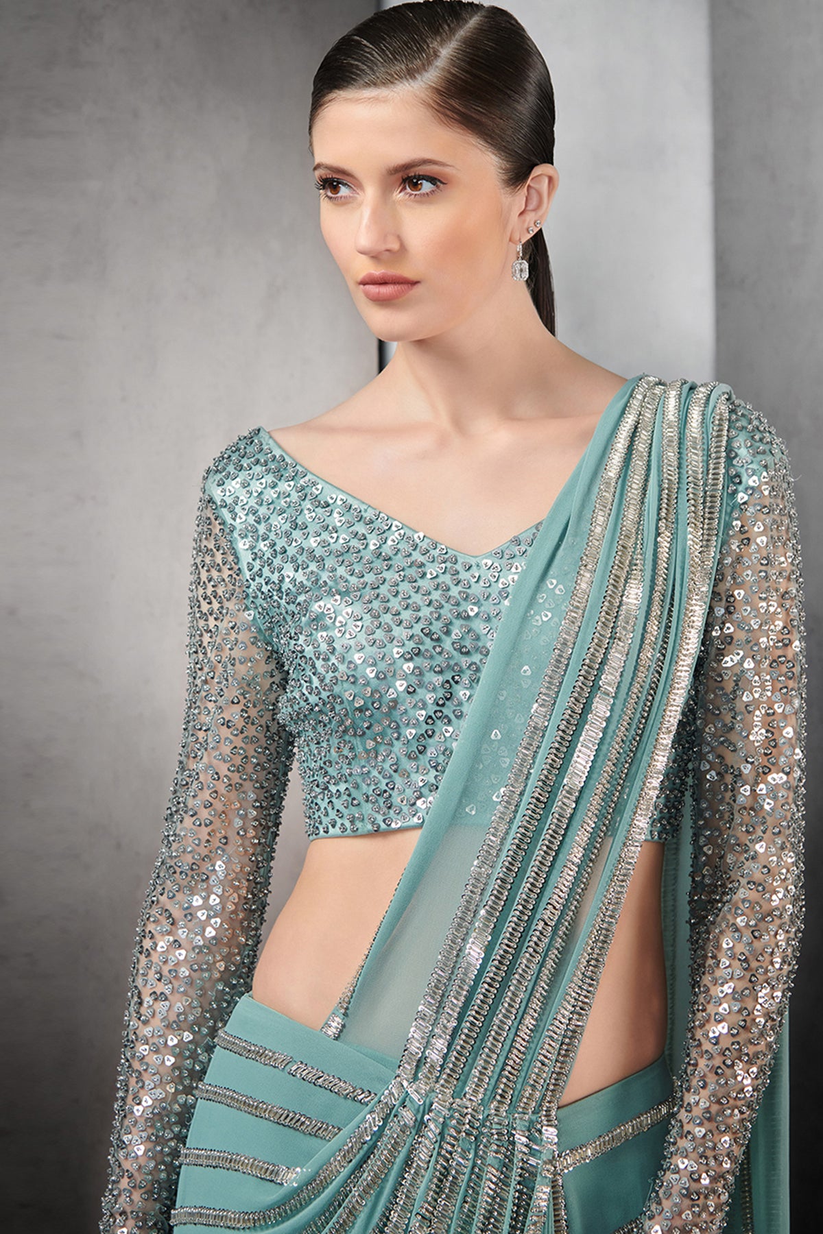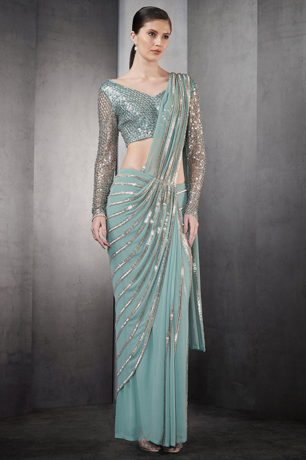 Draped saree in nylon tulle base with linear metallic bead