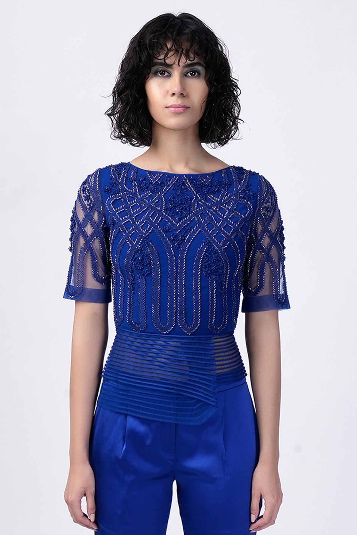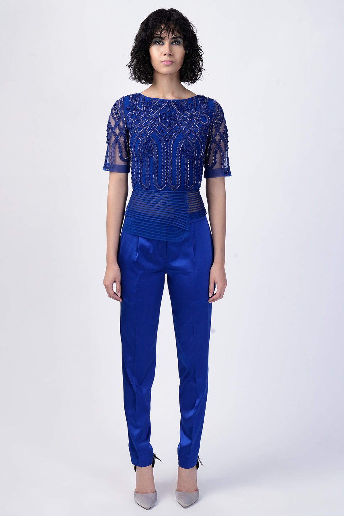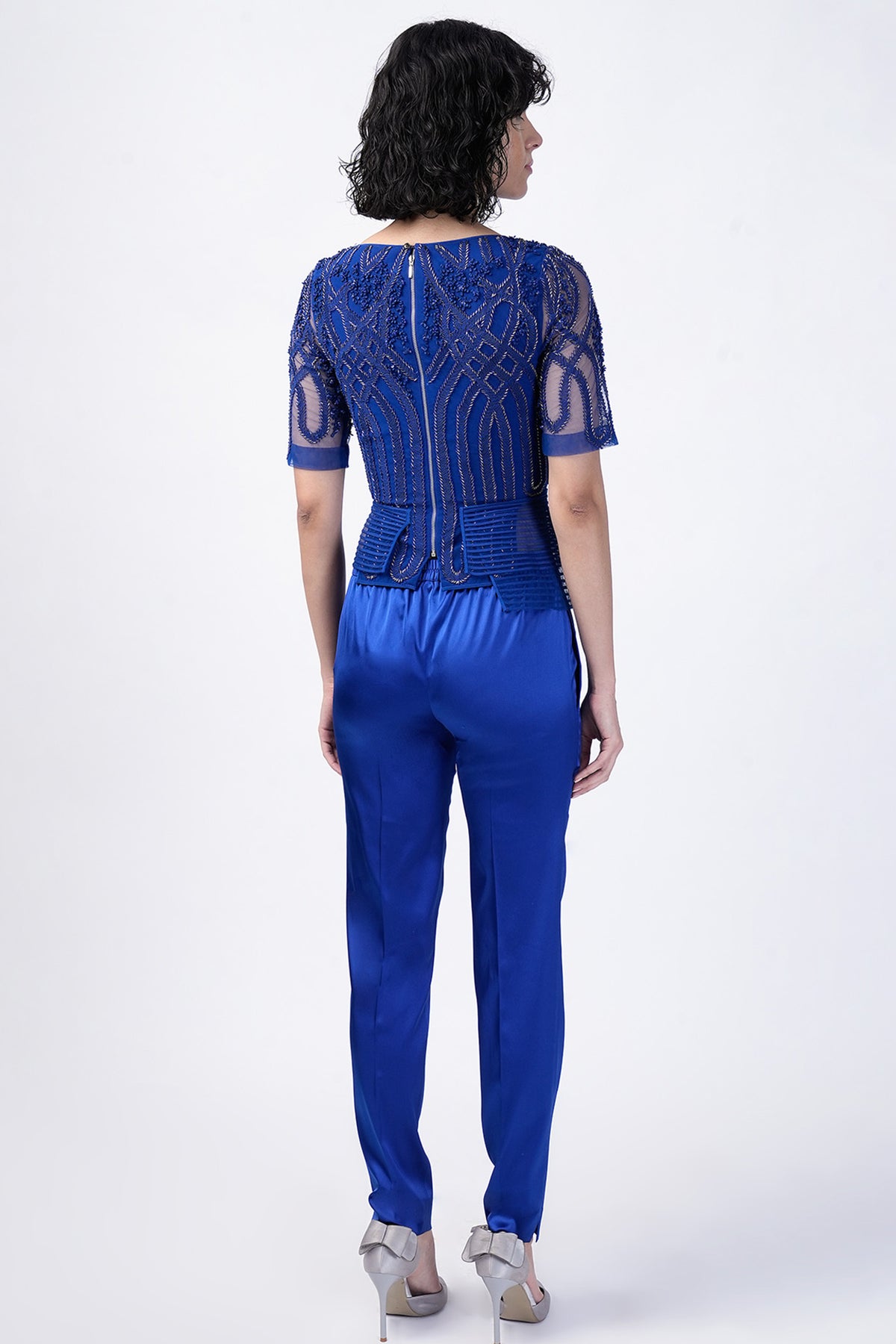 Our nautical peplum top, crafted with a tulle base and adorned with puff sleeves. Delicately embroidered with geometric floral applique all over, this top exudes elegance and charm. Pair it with our matching trousers the ensemble is perfect for an evening look..