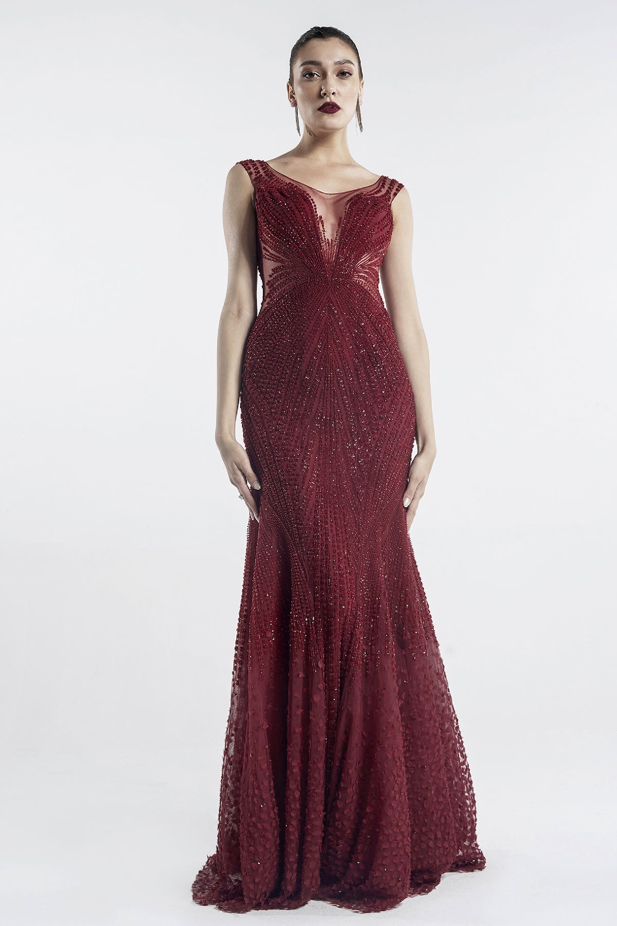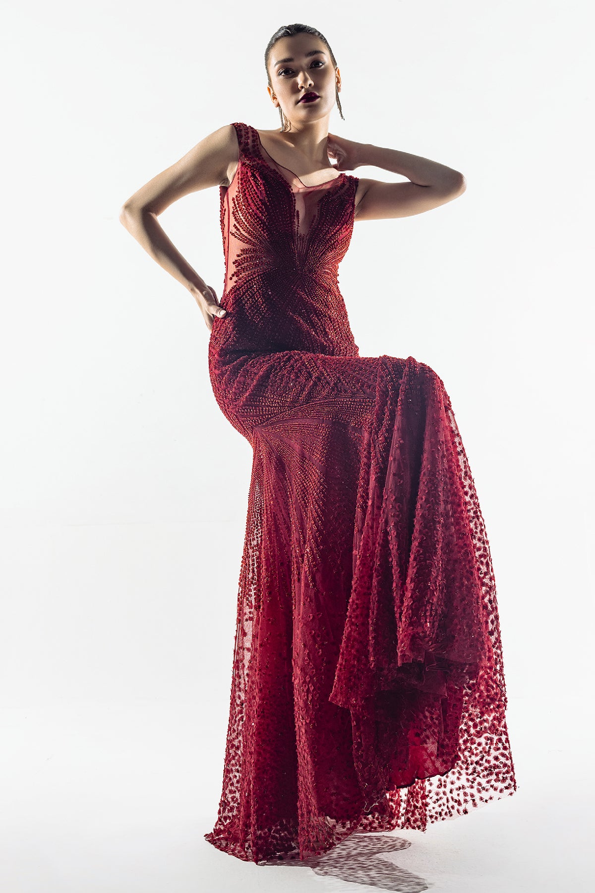 The alluring starburst mermaid off-shoulder gown has panache in tulle. Embellished crystals emit light with the slightest movement and the hand-cut silk organza fray at the bottom is grandeur in itself.