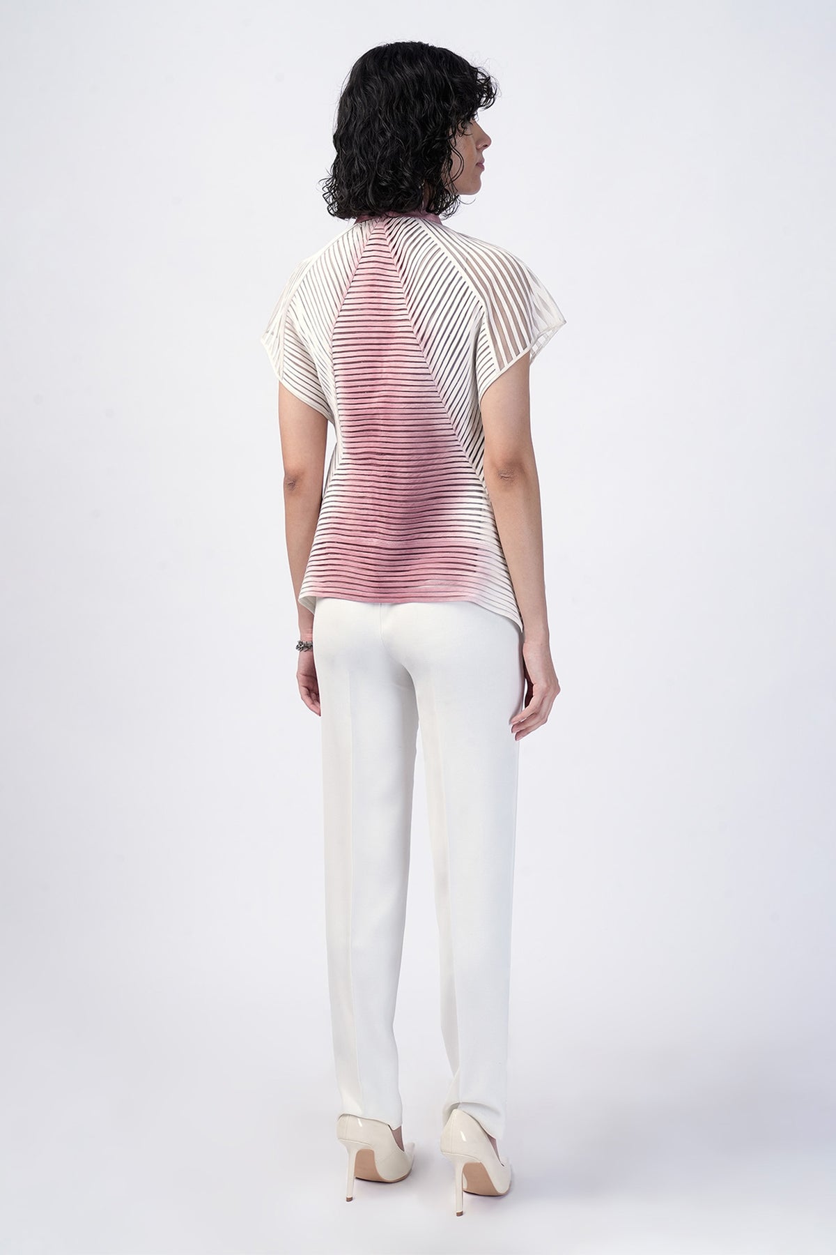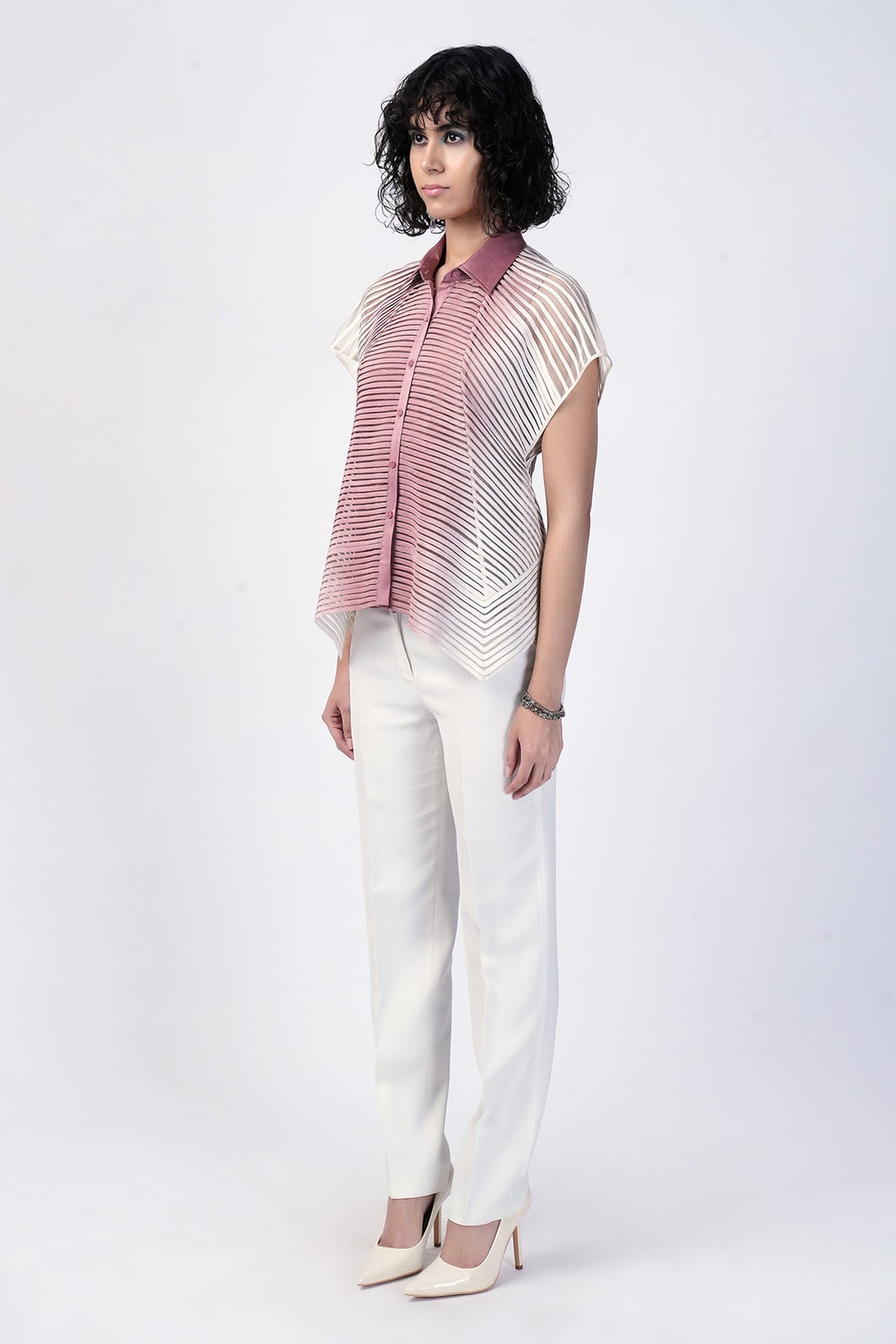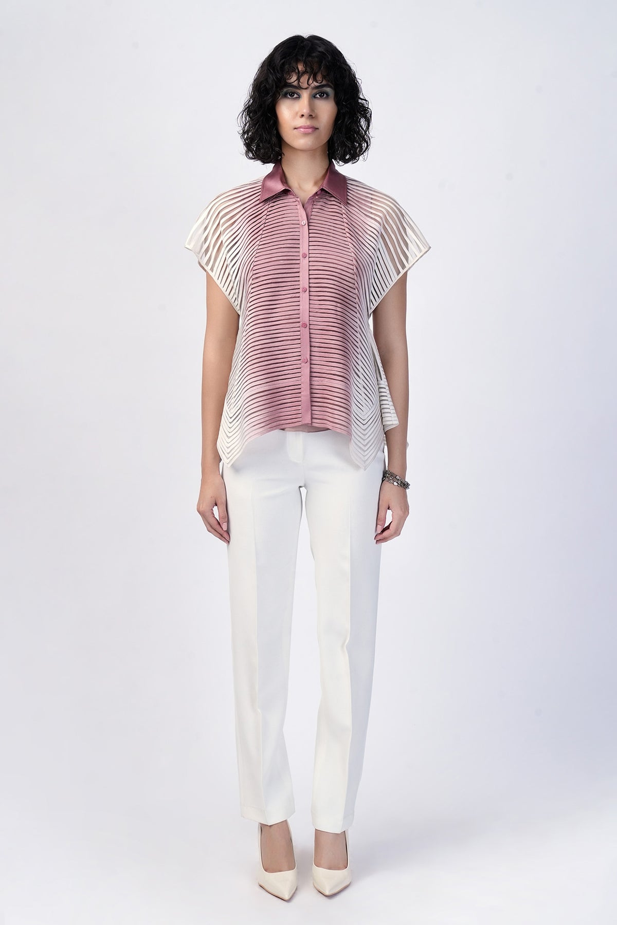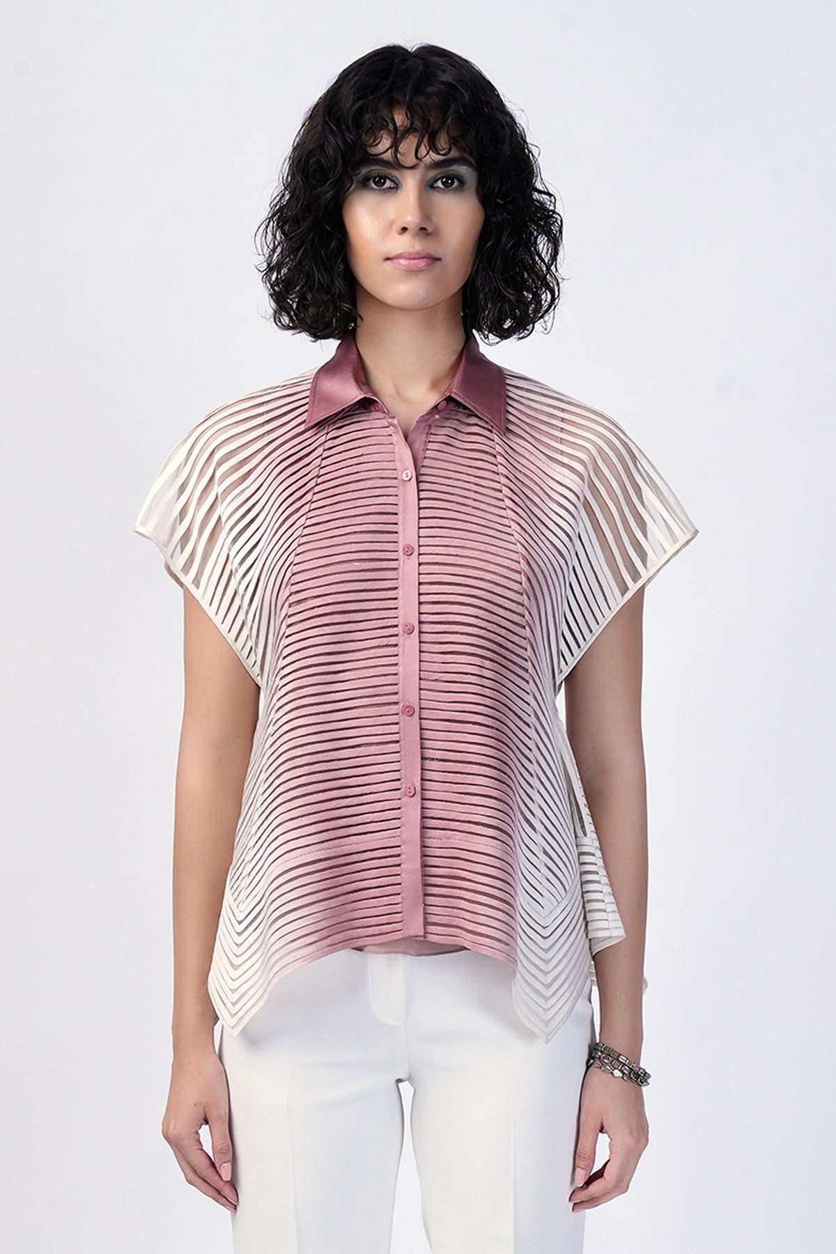 Make a bold fashion statement this season with our summer-ready ombre tulle top. Featuring stitched flat cords and a satin collar and placket, it's a must-have piece for your wardrobe.