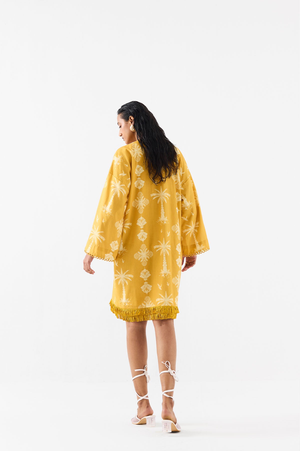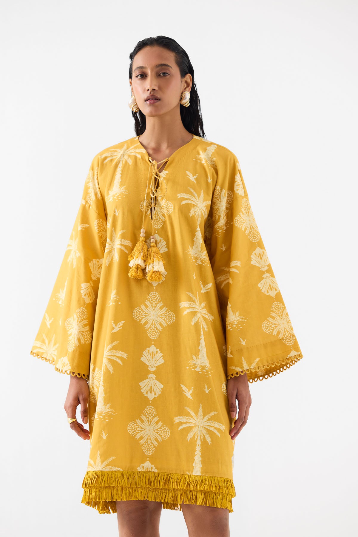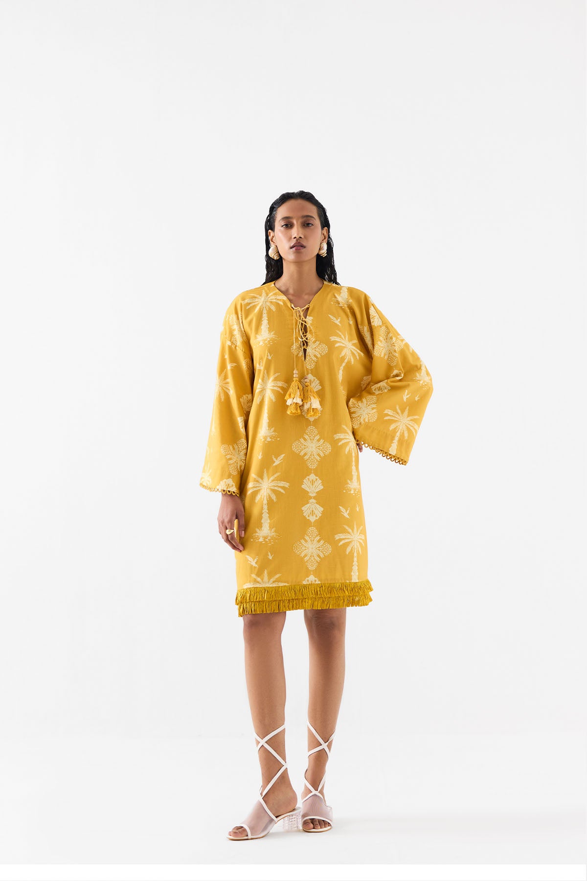 The cabana bell sleeves dress crafted from our stunning cotton fabrication, trans-seasonal, is a statement piece. Made in our 100% cotton slub in our cabana palm print, this dress has a v-neckline and bell sleeves. Featuring an a-line look, it has strings in the front with shell tassles. With pockets on the side, this piece has a relaxed look and can be styled in different ways. It also has raffia attached at the bottom hem. It can be paired with heels for a festive look