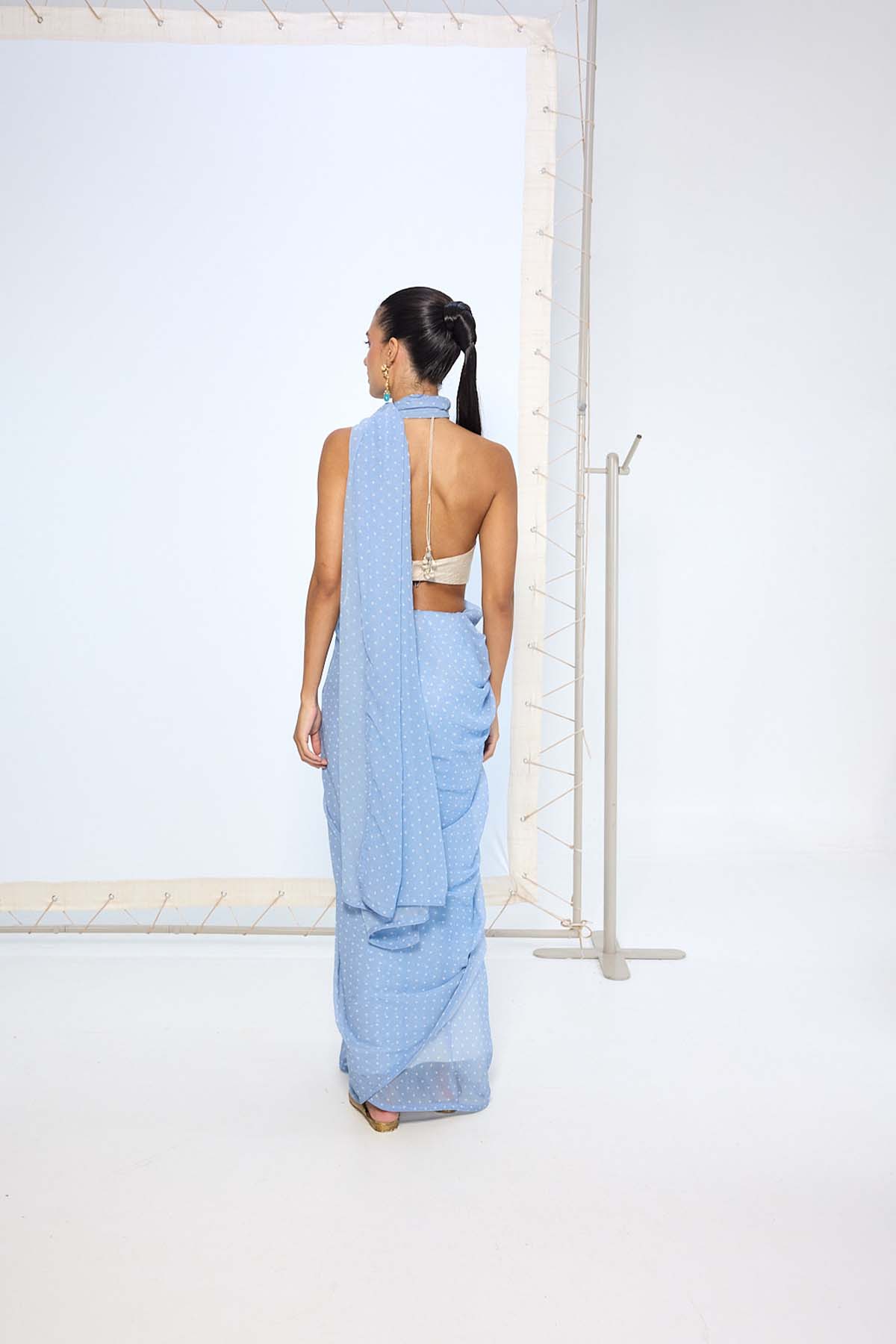 For palak shah, the saree is more than tradition—it is memory, identity, and love. This collection marks her first designer edit: a tribute to the looms of banaras and a bold vision for where the saree is destined to go.Our blue pure chiffon saree is adorned with an all-over white polka dot pattern, bringing a playful yet timeless touch to a classic silhouette. Lightweight and fluid, this saree drapes effortlessly and can be styled in endless ways.Palak recommends: keep it simple with a classic drape and delicate jewellery, letting the polka dots take center stage.