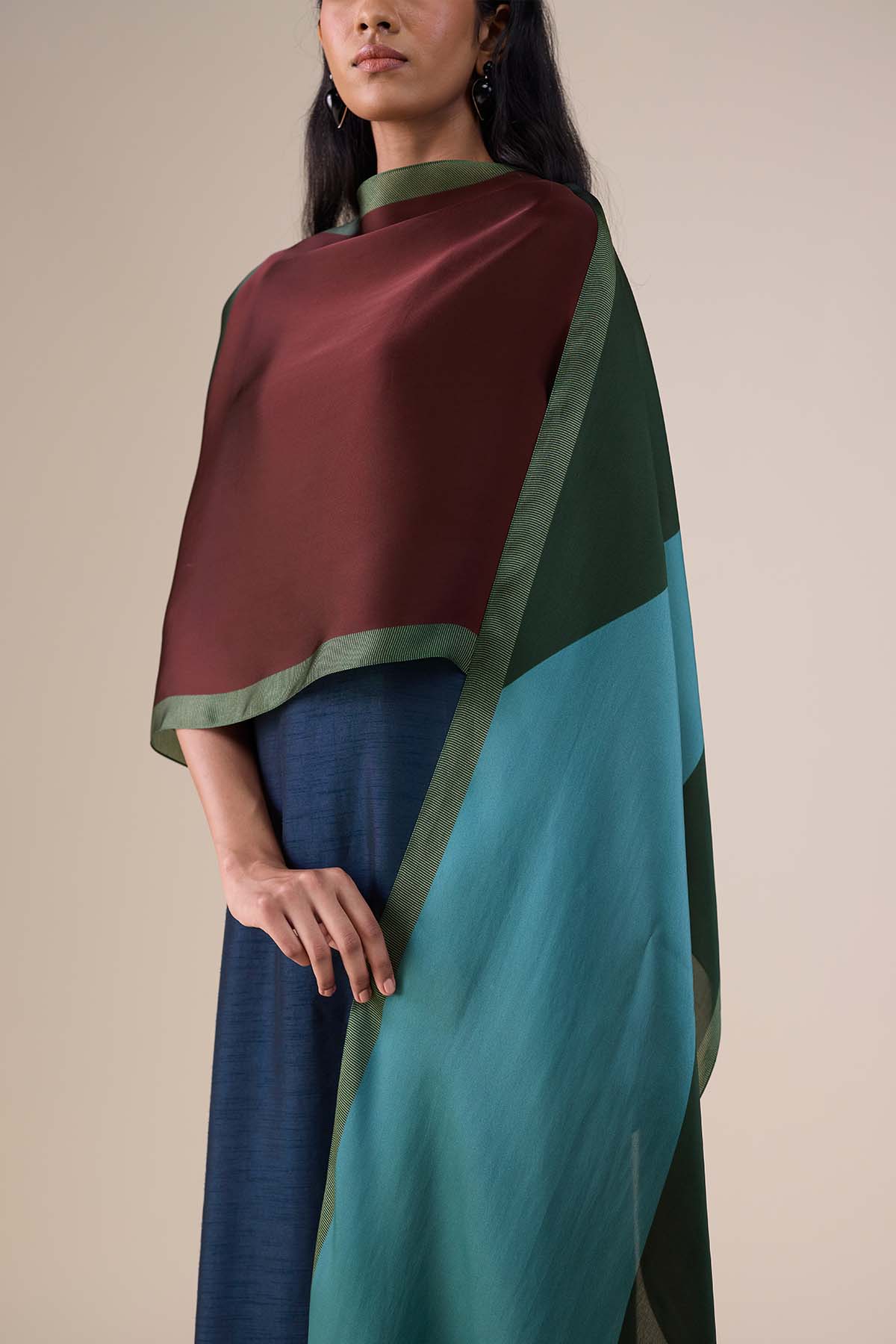 Wrap yourself in the softness of silk with our irene scarf, which combines shades of wine-red burgundy, deep forest green and steel blue into a wardrobe staple. Wear her anywhere from a casual stroll on the beach to a formal dinner party.