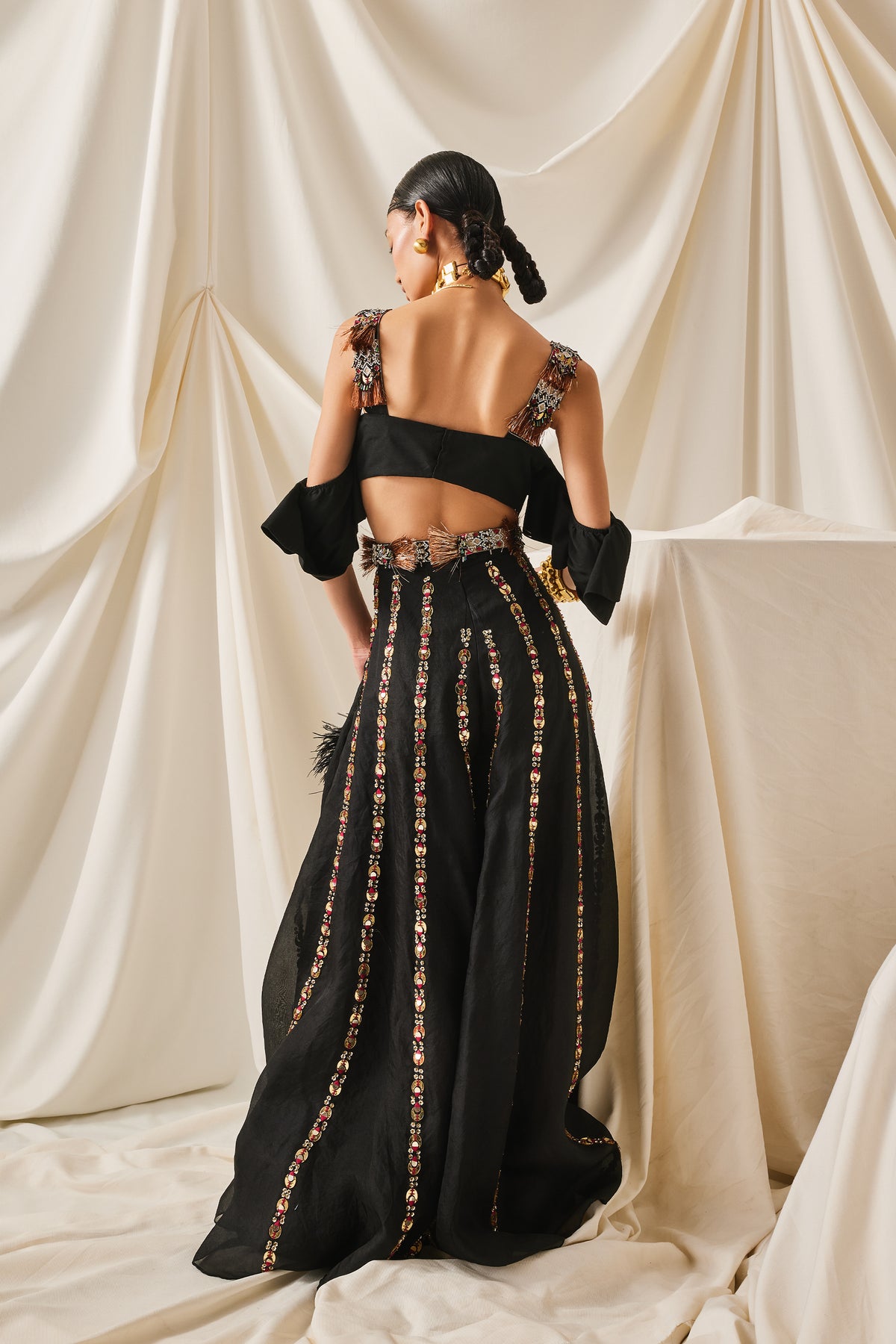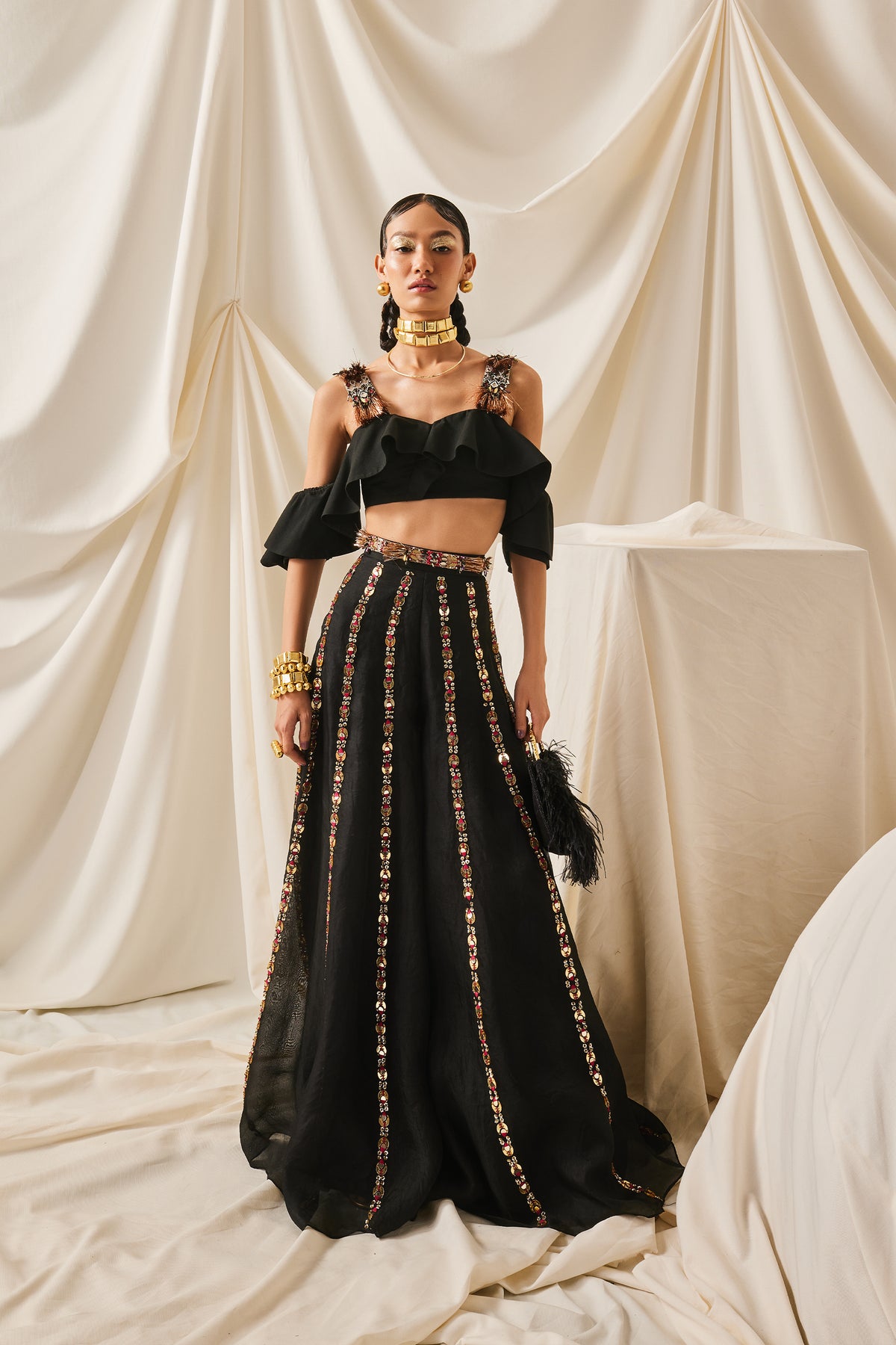Black ruffle crop top with shoulder fring strap + arsy sharara + belt